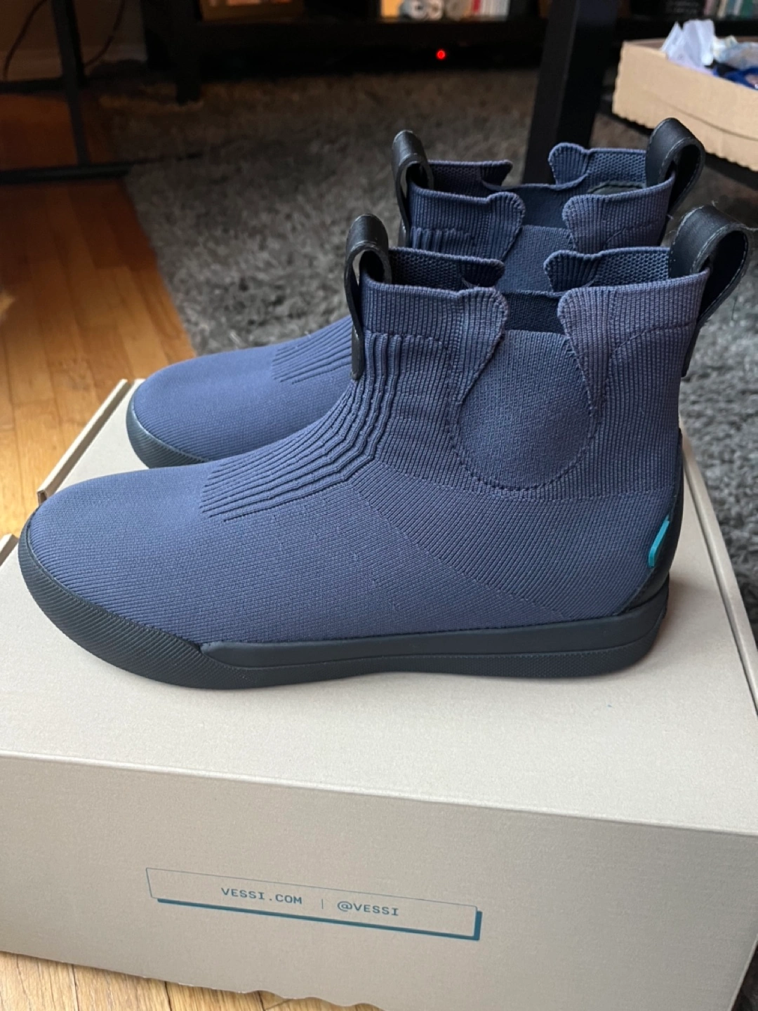 Vessi Weekend Chelsea Boot in Coast Blue on Black. Size 9. Brand new in box. Waterproof, feels like a sneaker. $60 OBO Retail: $175.00 This cool weather staple combines the comfort of a sneaker with the coverage and warmth of a boot. Features: •Dyma-tex® 100% waterproof technology •Lightweight, cushioning midsole •High-traction rubber sole •High side panels •Pull tabs for easy on and off •Temperature-regulating, breathable upper knit •Vegan materials