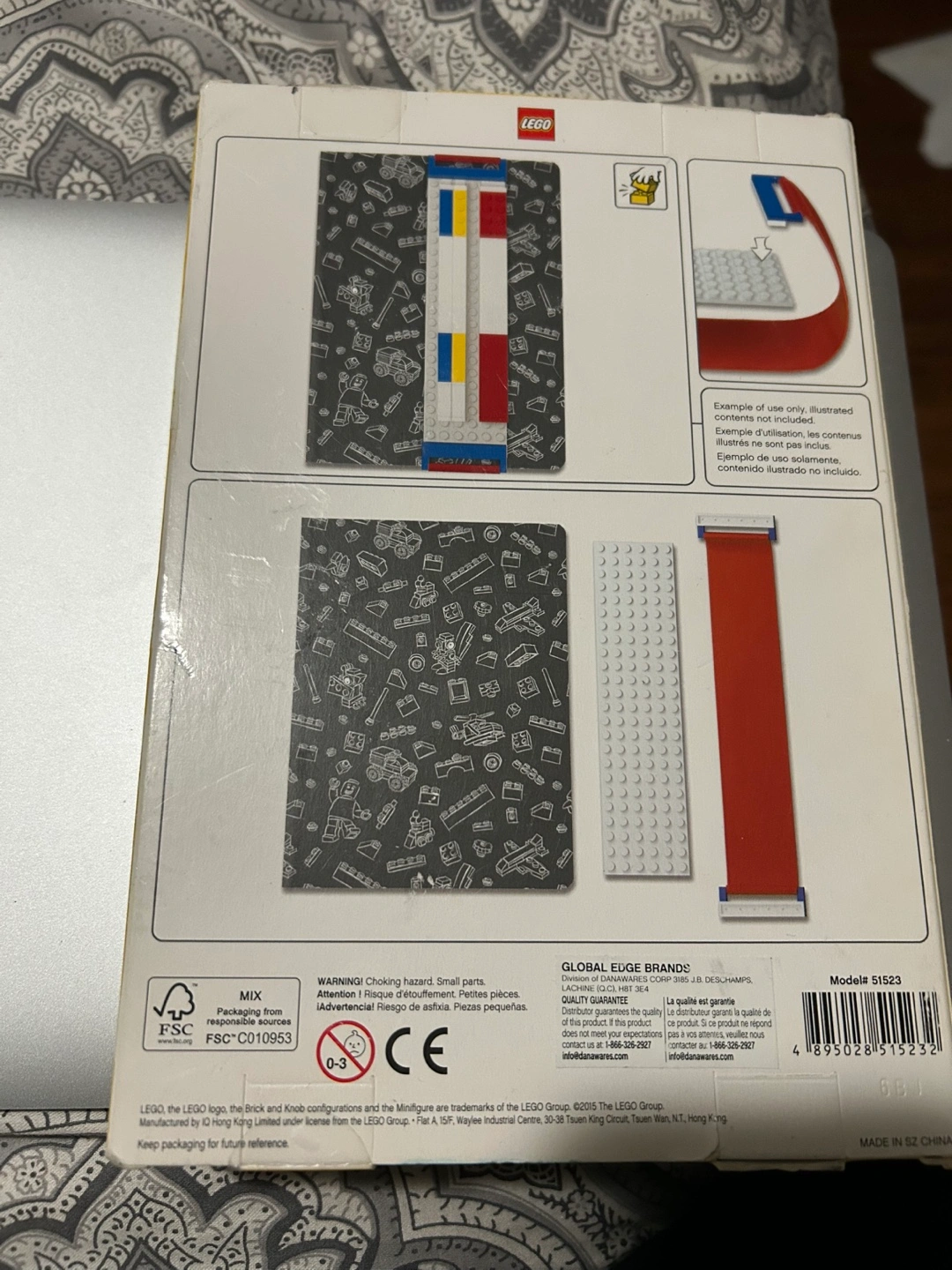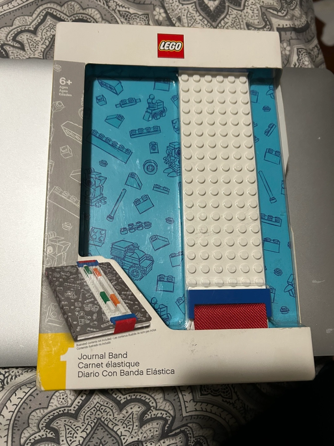 Journal with Lego band. Blue and white cover with LEGO pattern. Red elastic band. New in box.
