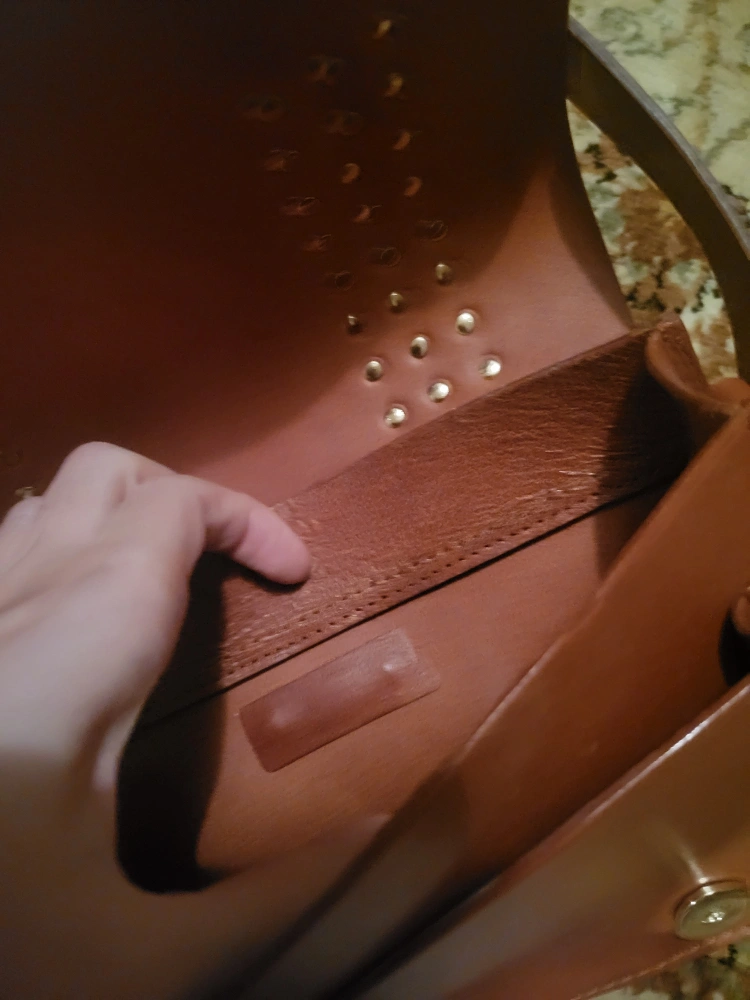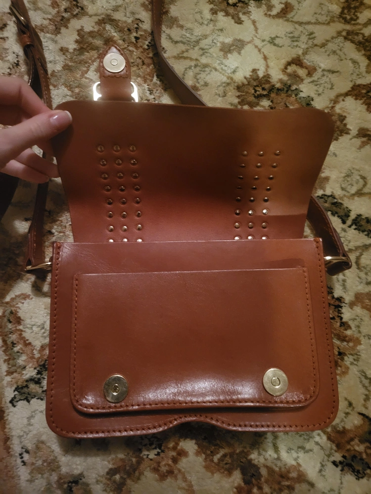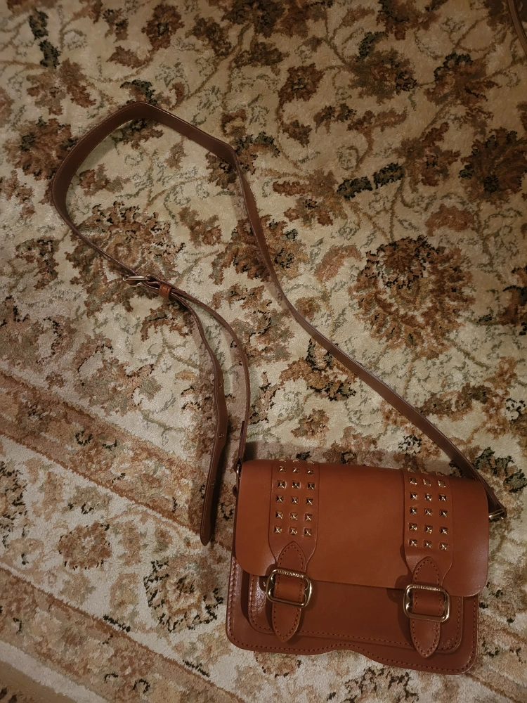 Small brown leather crossbody bag with gold hardware. Features a flap closure with two buckles. The bag has a small pocket on the front and a large compartment inside. The strap is adjustable.