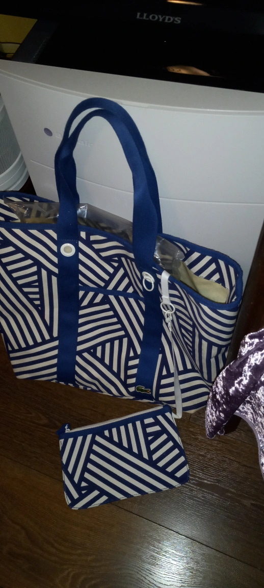 This sturdy bag comes with outside pocket and inside zippered case on a white cotton sinch chain on a white enamel steel ring. The geometric royal blue and white screams beach bag..It has a strong double bottom and double closure clasps. Super for the market or the beach!♡