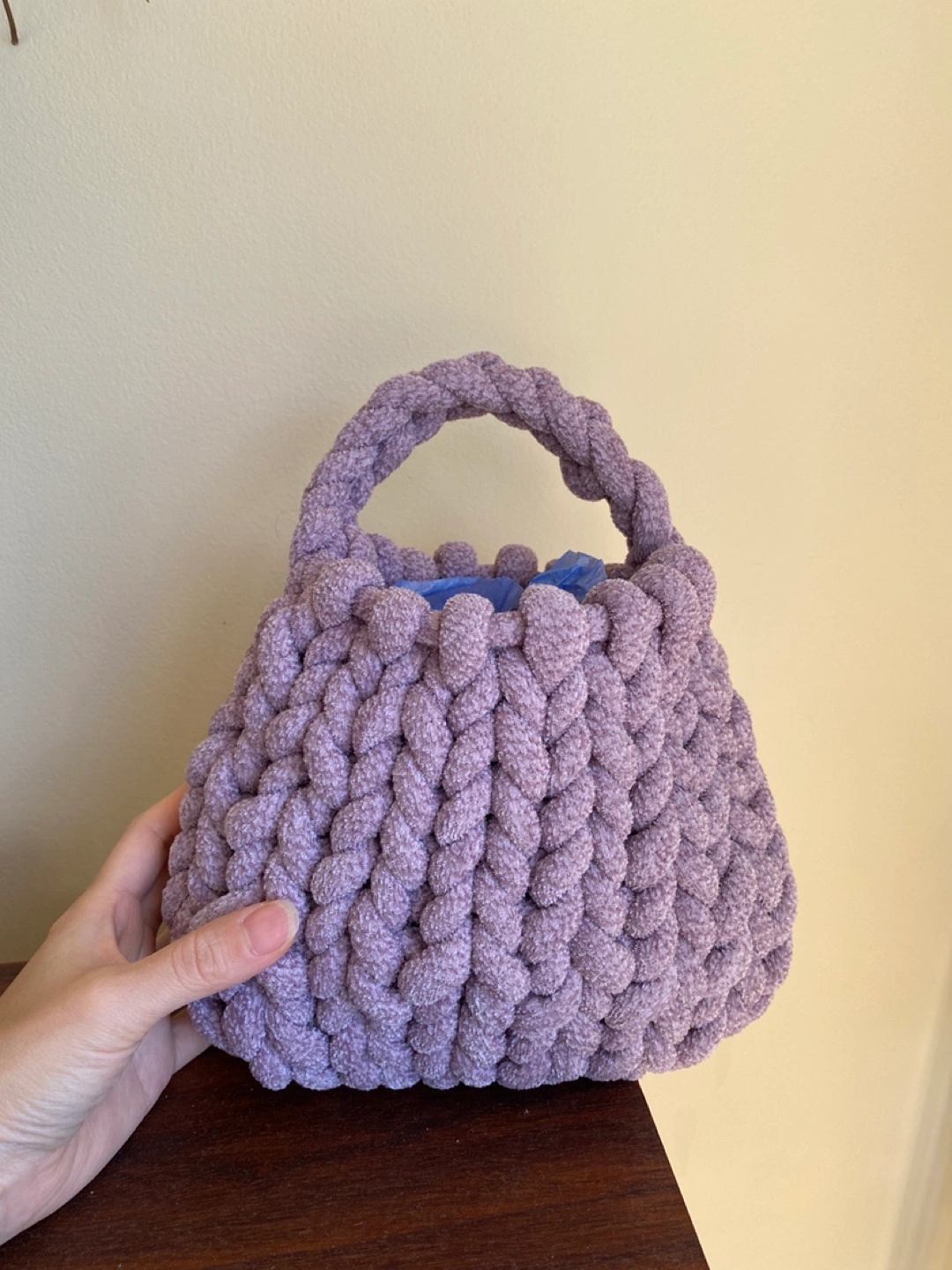 Small crochet bag with a single handle. Made of a soft, plush material. Handmade 7β tall without handle. 9β tall with handle. 8β wide. Perfect for gifting!π