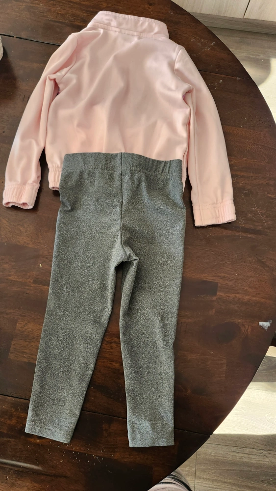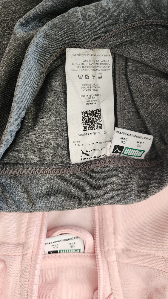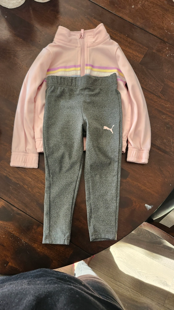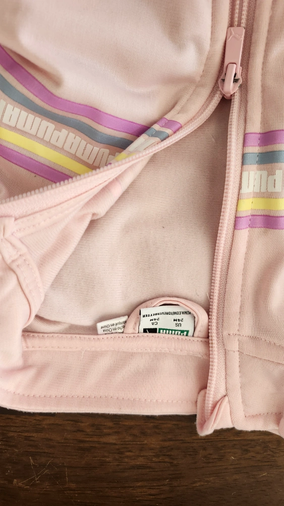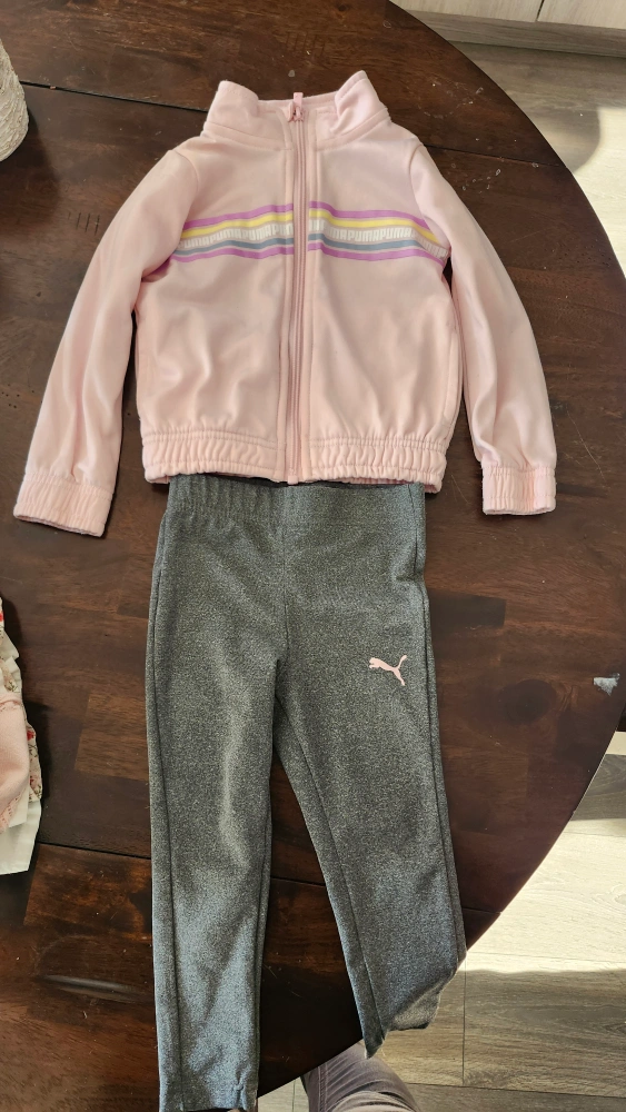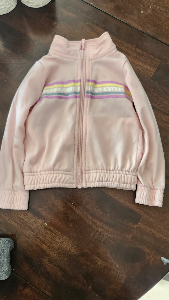 Pink tracksuit with multicolored stripe detail on the jacket. Grey pants with Puma logo on the left leg. Jacket good and pants like new