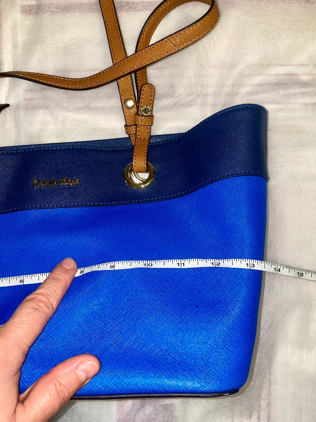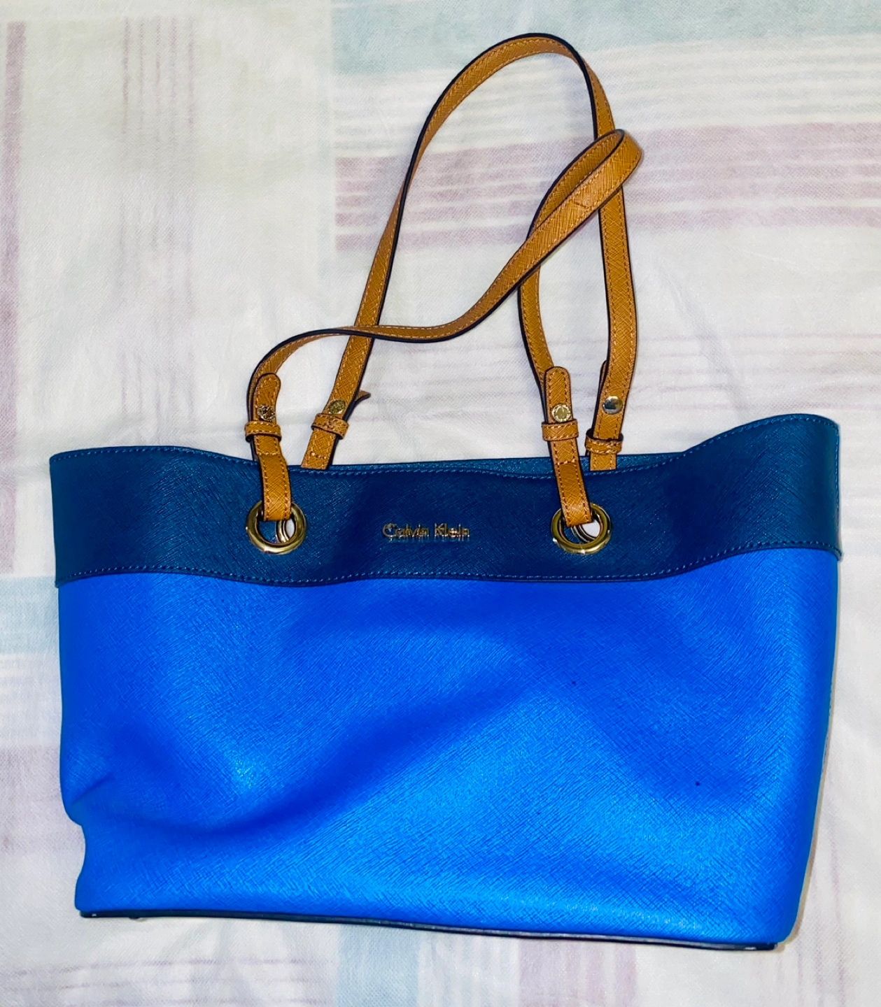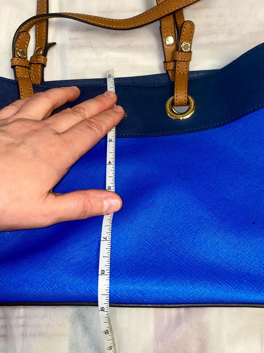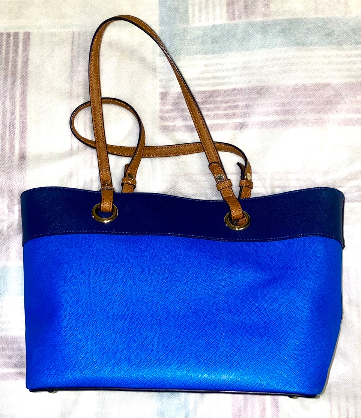 Blue and navy tote bag with brown handles. Gold accents. Measures approximately 12 inches wide and 10 inches tall.