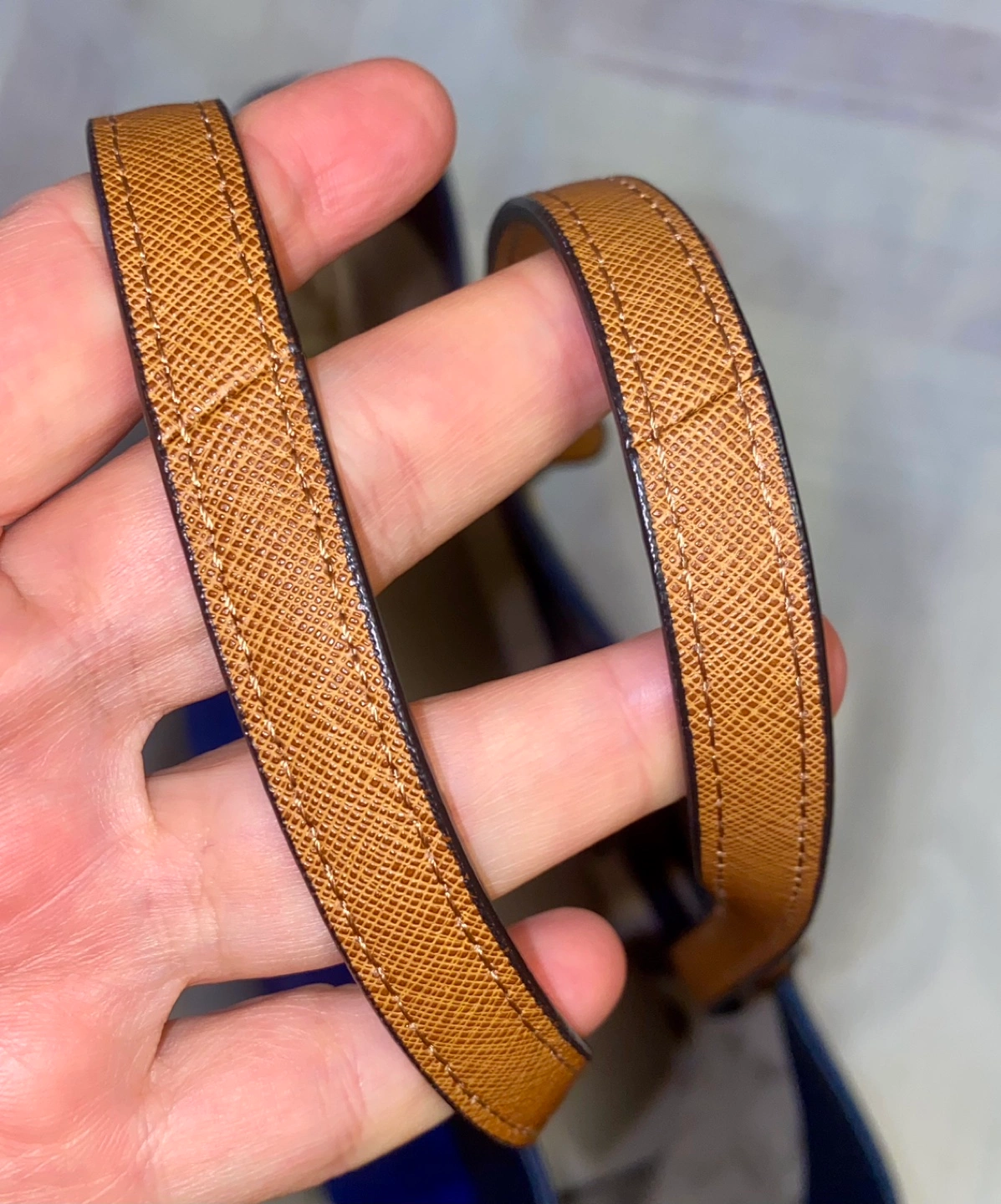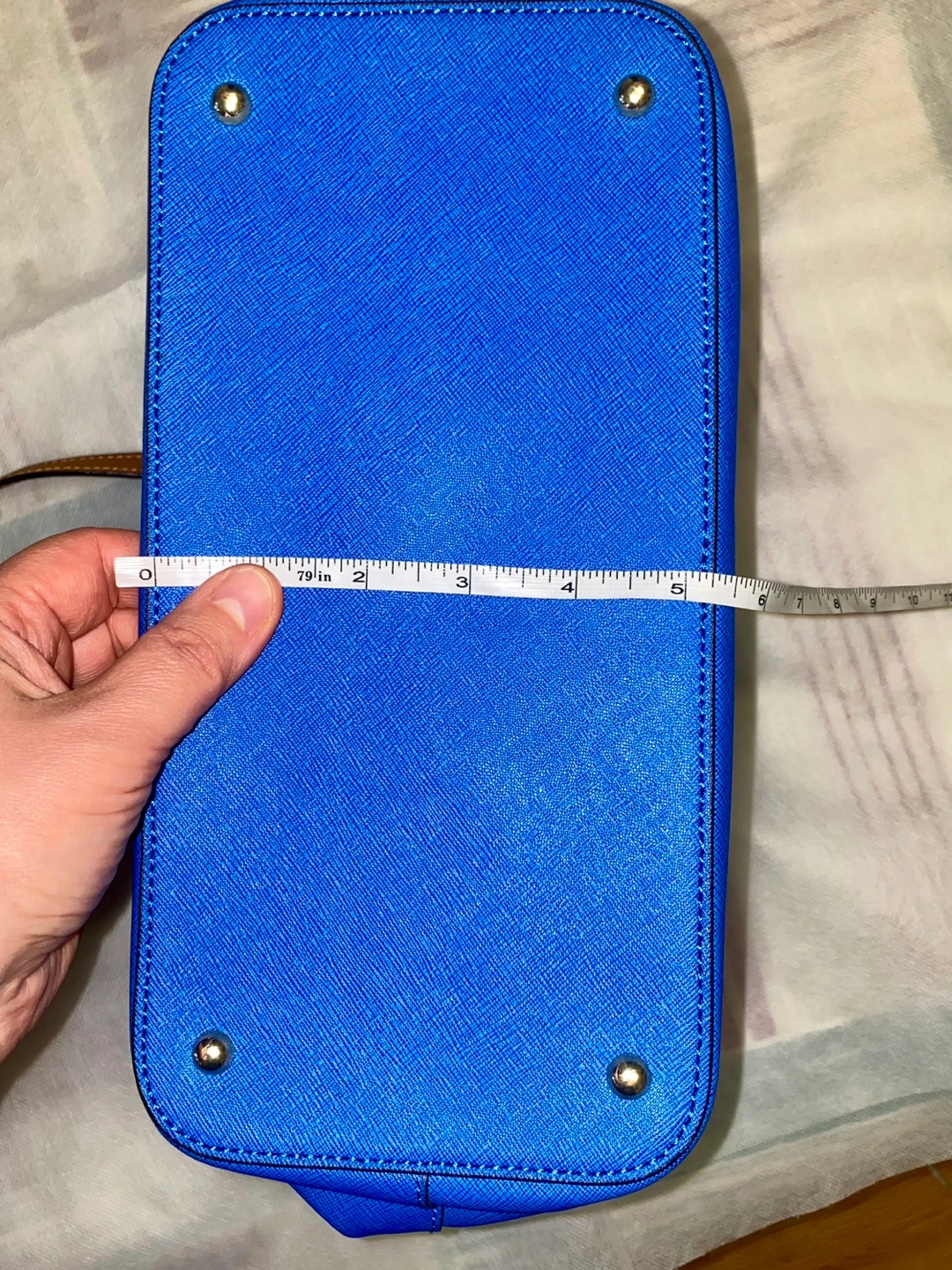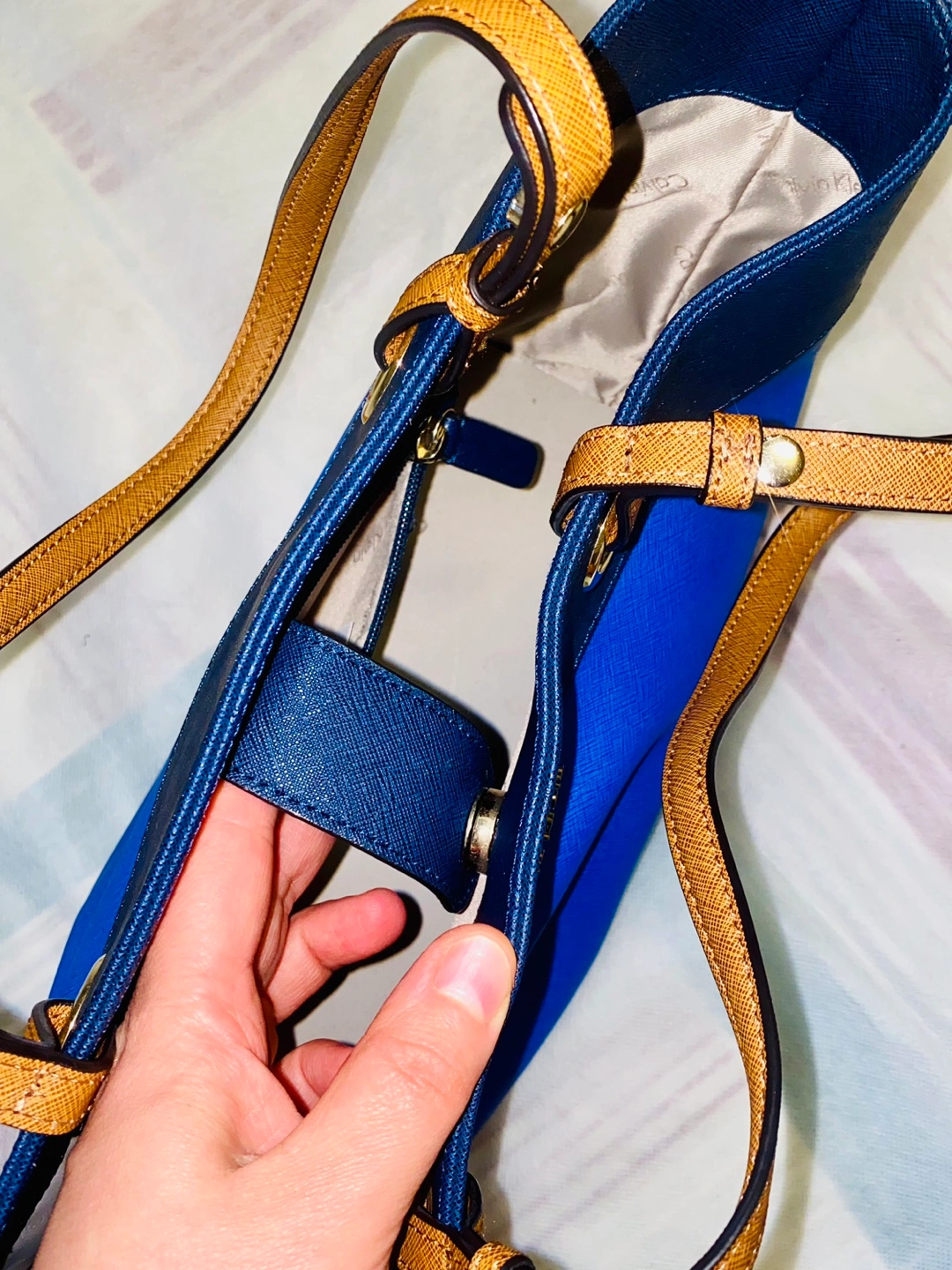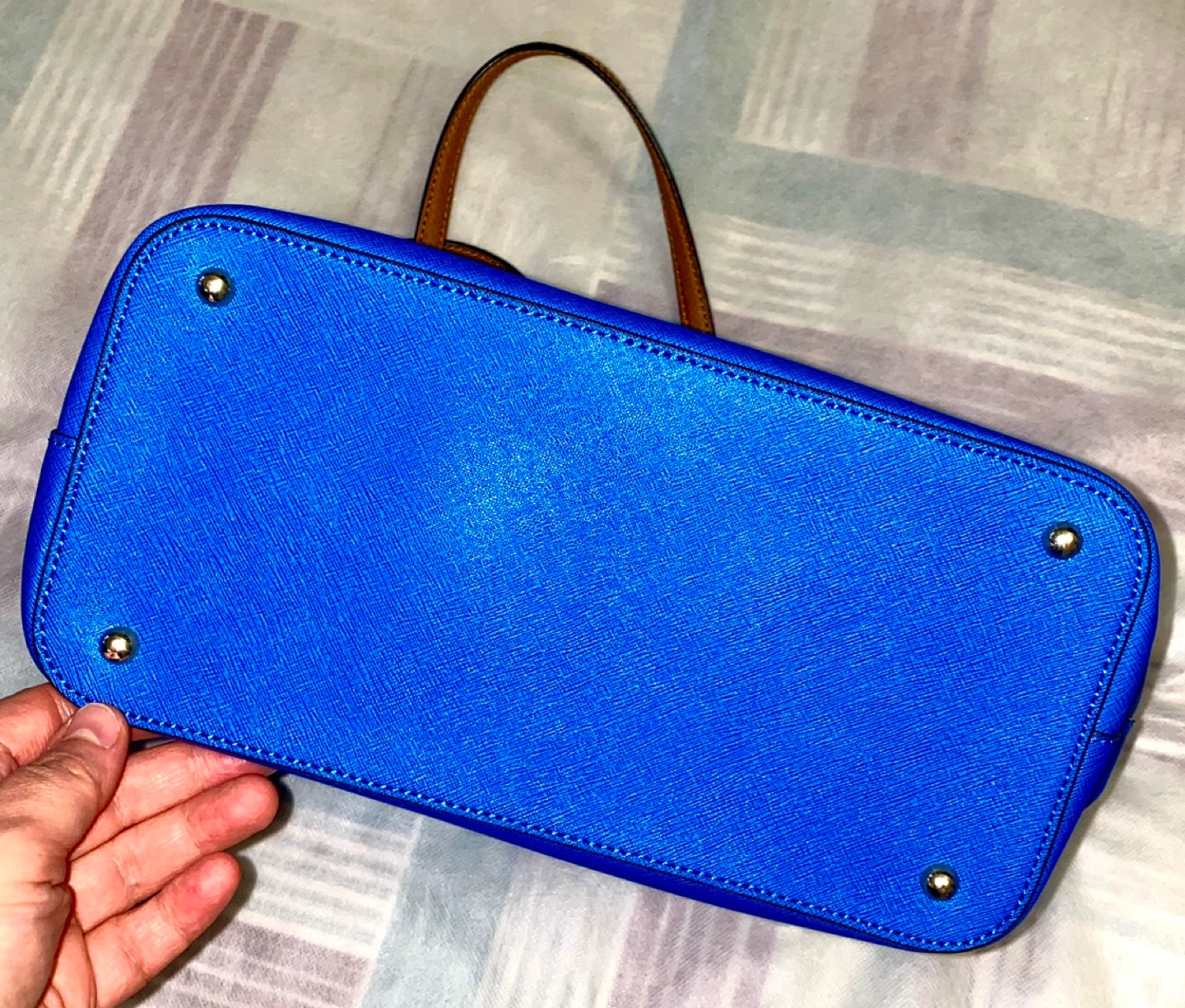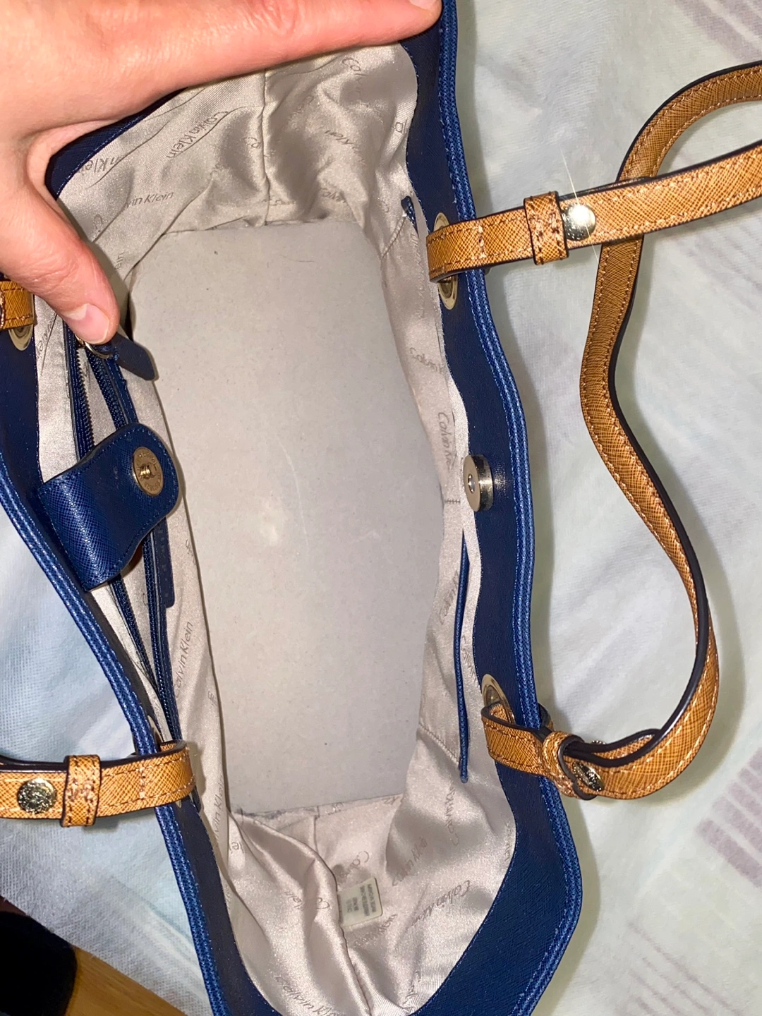 Blue and navy tote bag with brown handles. Gold accents. Measures approximately 12 inches wide and 10 inches tall.