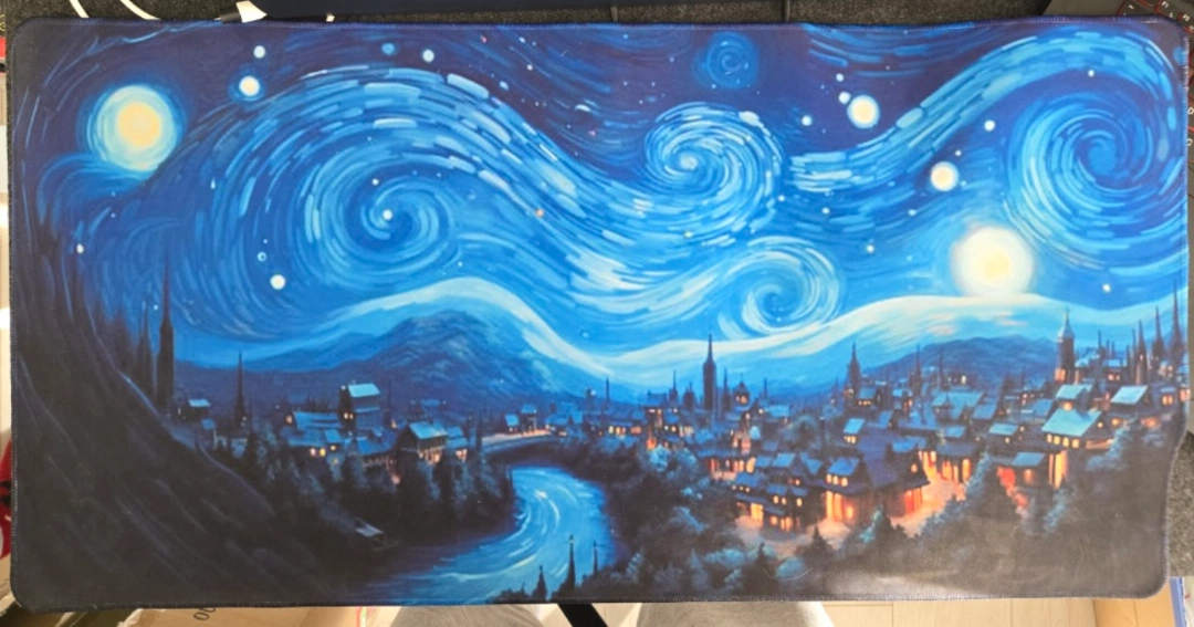 Large mousepad with a starry night design. Rolled up for storage. 80x40 cm