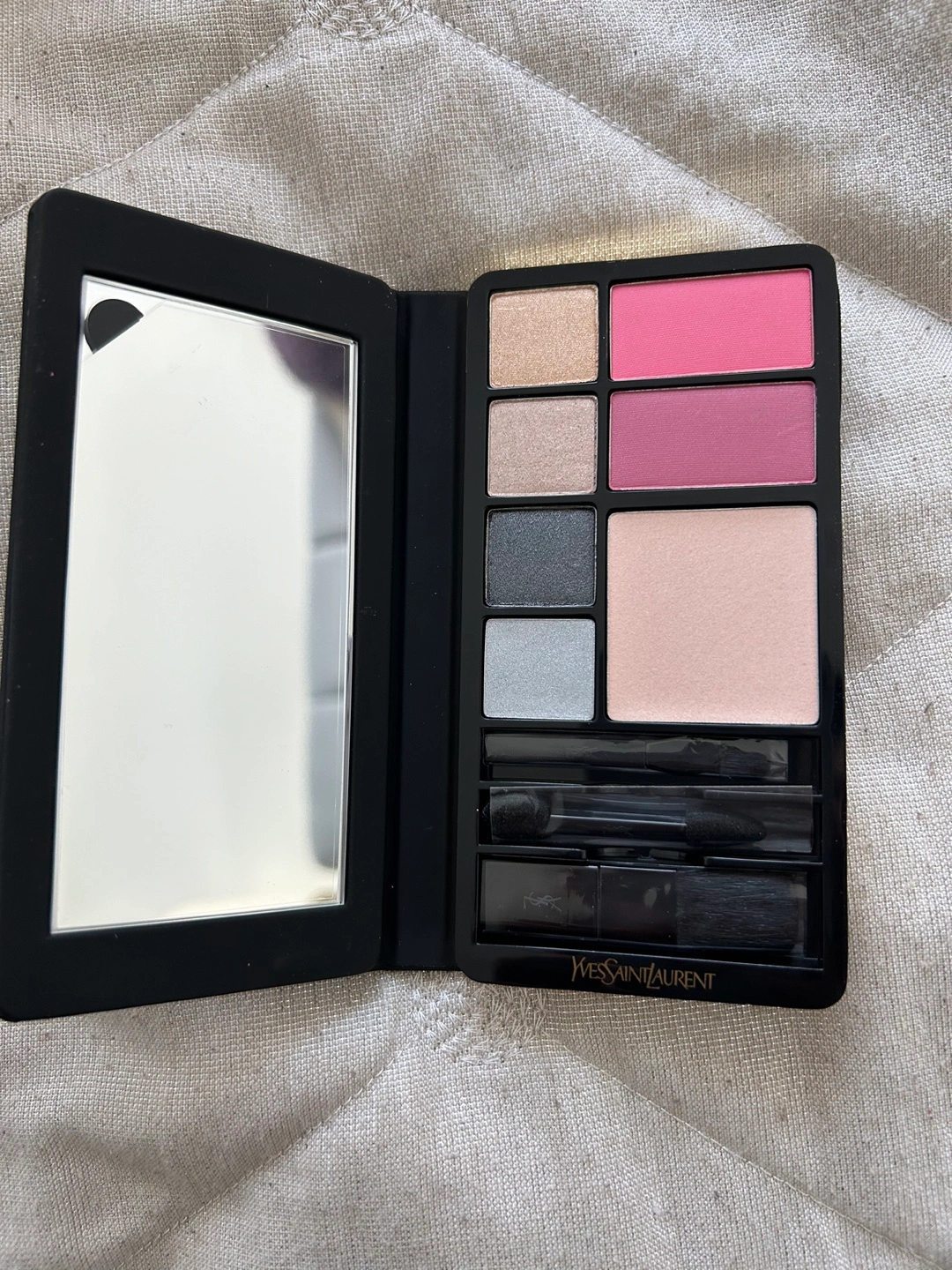 Complete makeup palette with mirror and applicators. Includes eyeshadows and blush.