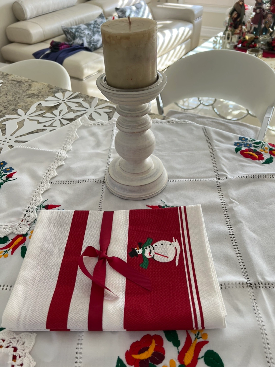 William Sanoma Red and white 2 striped dish cloths with snowman are Brand new, never used. The table cloth is hand embroidered. Dish cloths are $20. For both. Make a very useful gift π for someone. The table cloth is also $20.