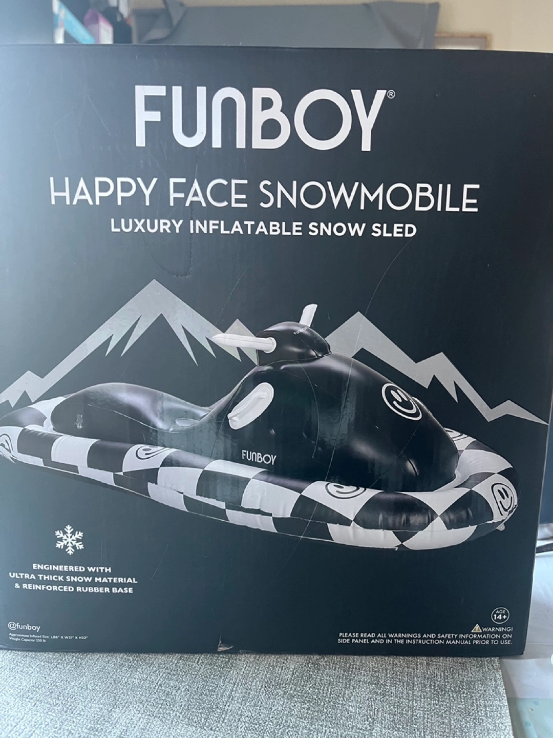 Brand new in box, unopened. Black and white inflatable snowmobile sled. Engineered with ultra thick snow material and reinforced rubber base.