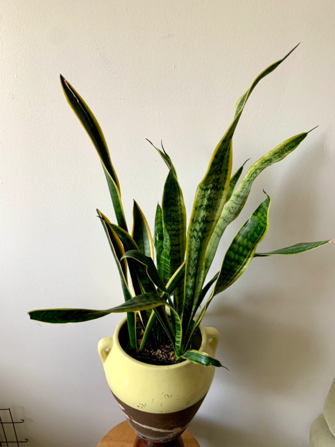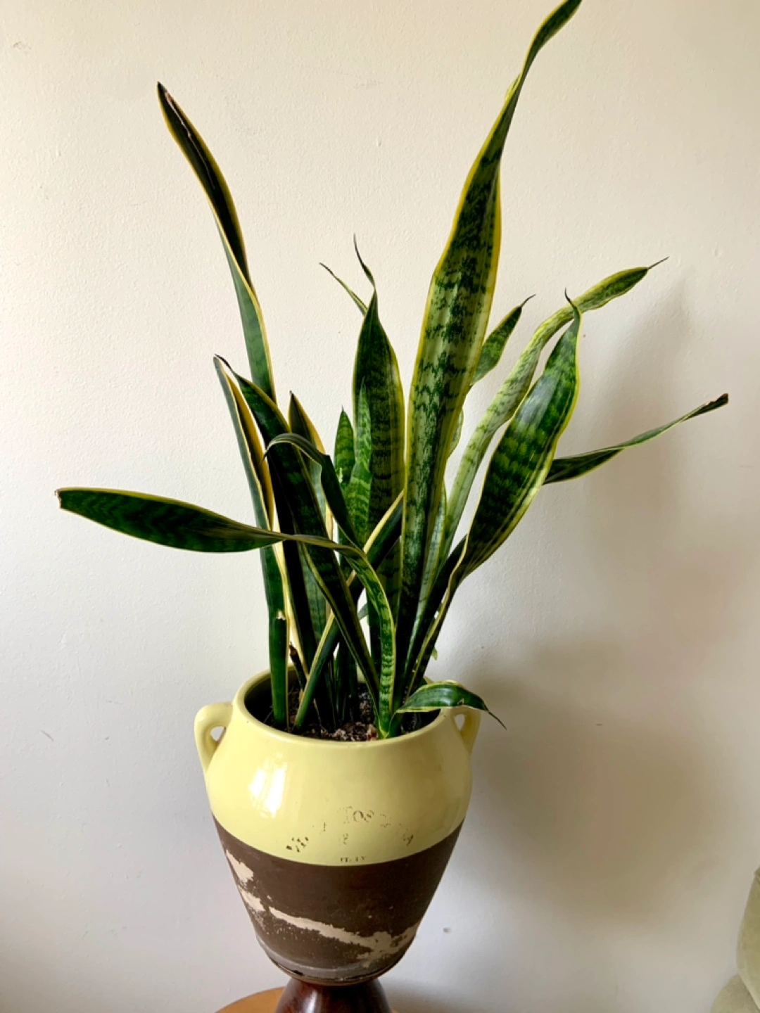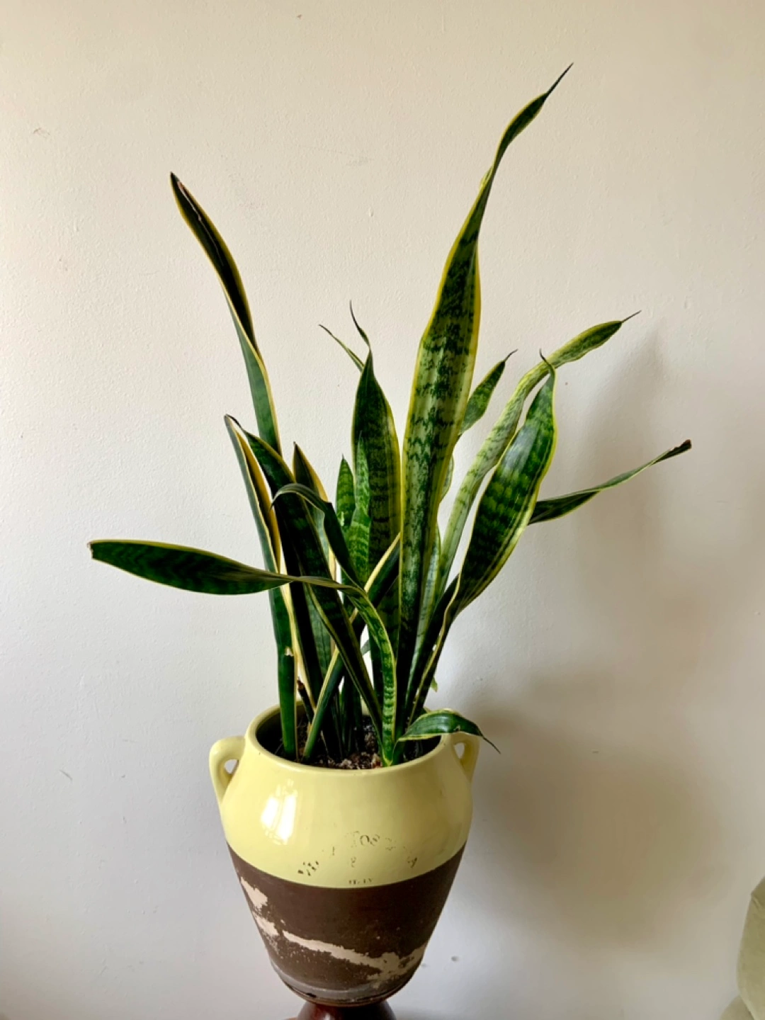 Large snake plant in a ceramic pot. The pot is a light yellow colour with brown accents. It has two handles on either side. The pot is 10 inches tall. The plant is very easy to care for and requires minimal watering. It is a great addition to any home. ▶️Price firm ▶️pick up only and final sale ▶️exact cash payment. ▶️kindly respond when ready to purchase and pick up.