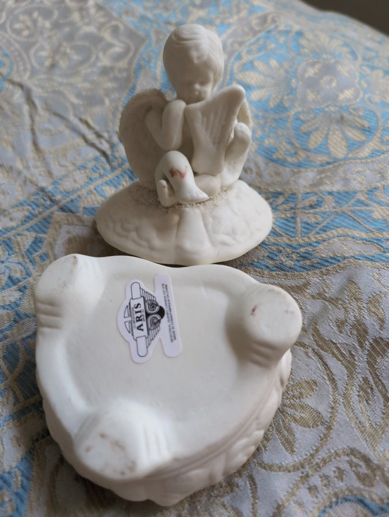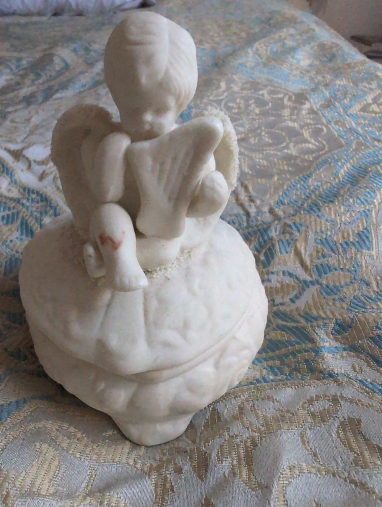 White porcelain trinket box with a small angel playing a harp on the lid.