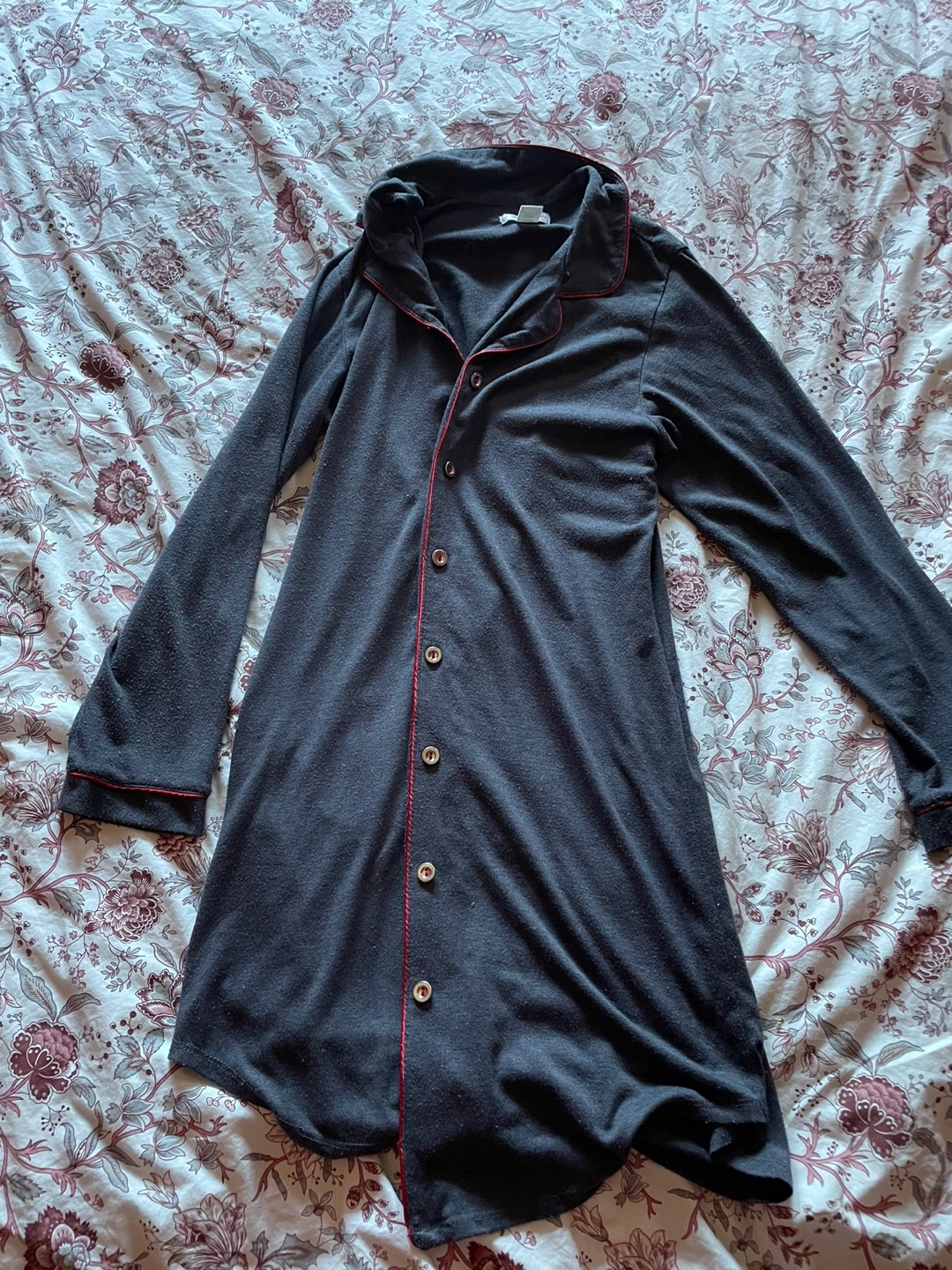 Long sleeve button up pyjama shirt with red trim. Soft and comfortable fabric. Small, but fits oversized. PM for more detailed images / information. Will be donated at the end of May. 🪻Pay what you can🪻