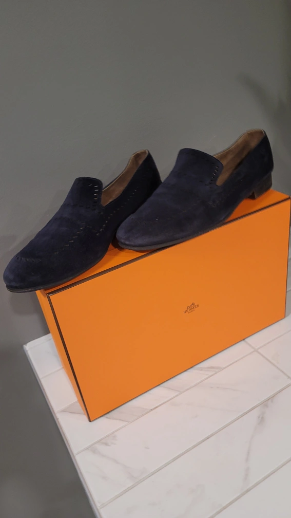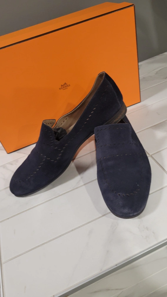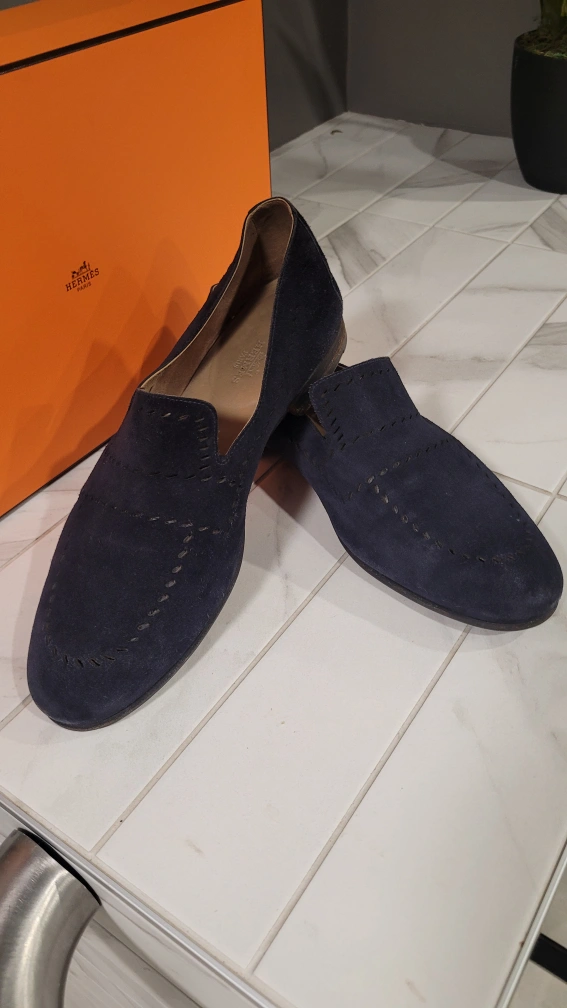 Blue suede loafers. Comes with original box. Authentic Hermes.