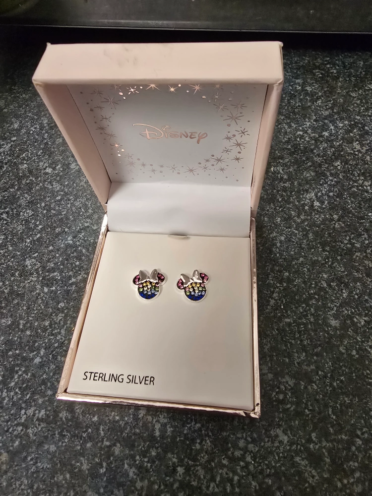 Sterling silver earrings with a Minnie Mouse design. Comes with a box.