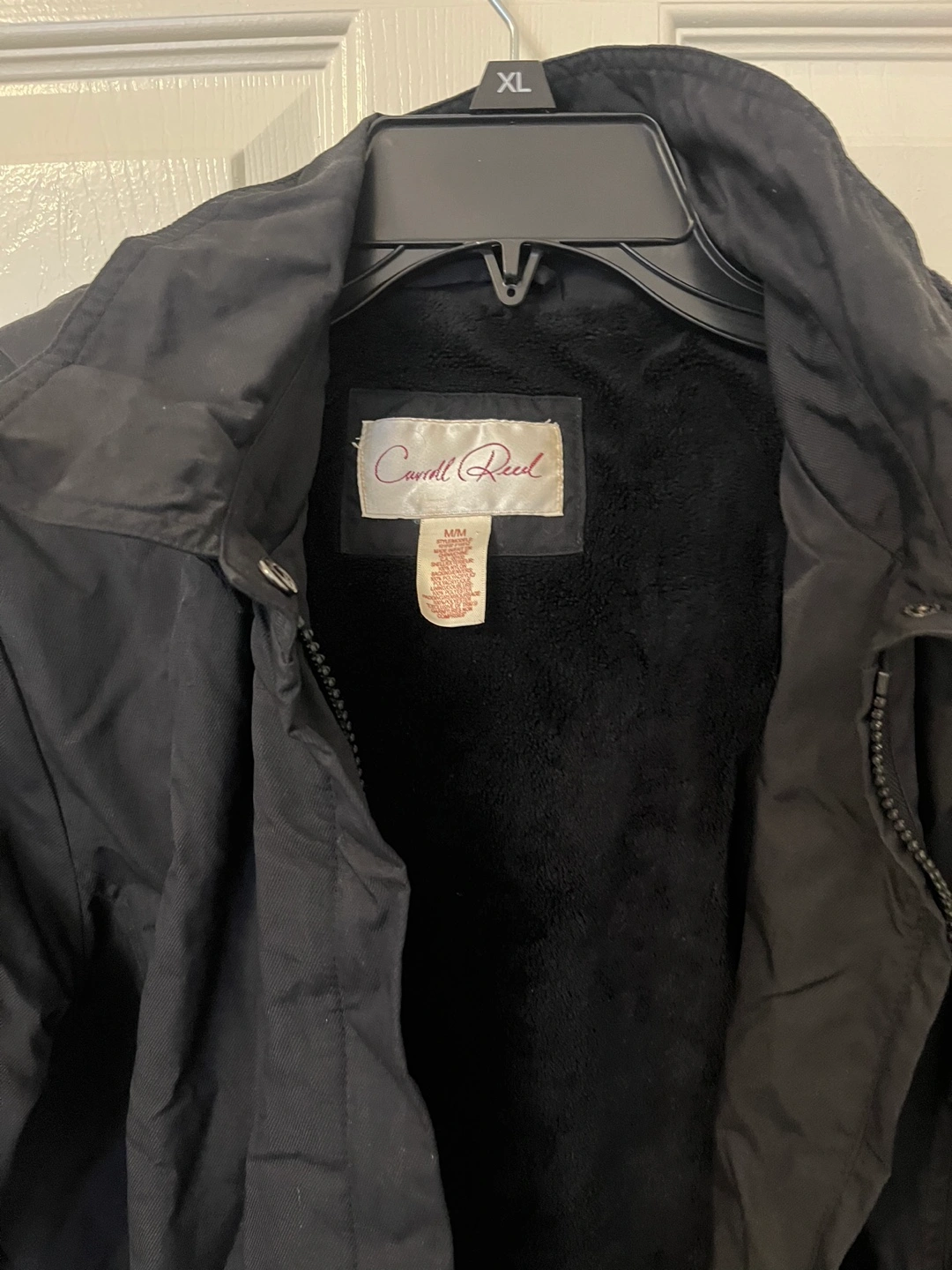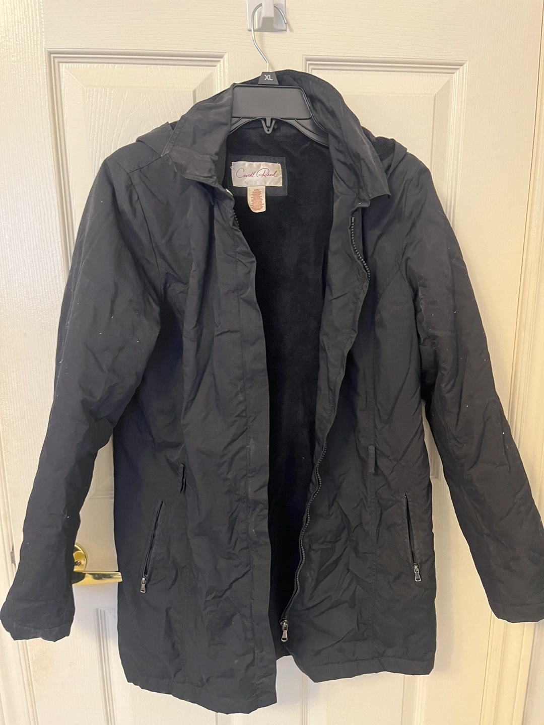 Black winter jacket with a hood. Features a fleece lining and two zippered pockets on the sides.