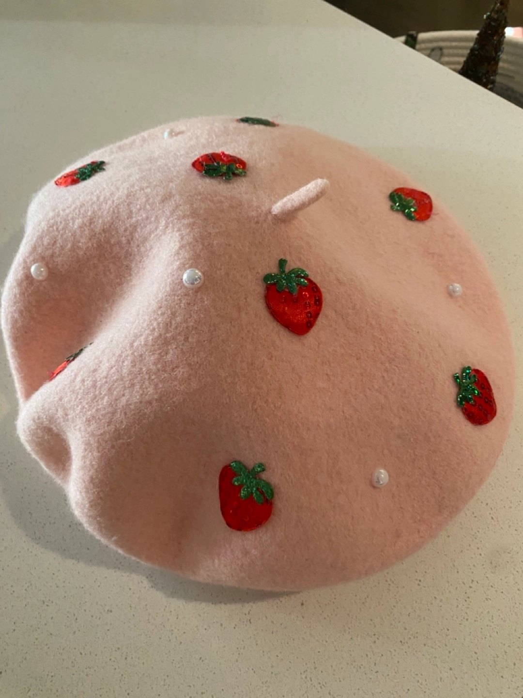 Pink beret with sequin strawberry embellishments and pearl details. One size fits most.