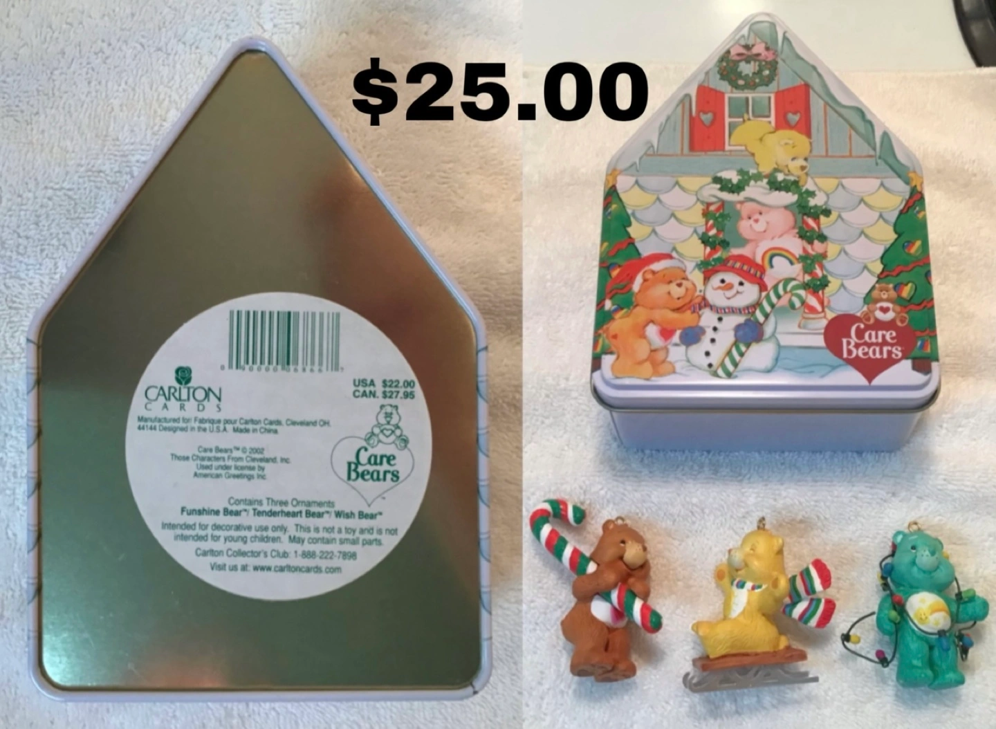 Care Bears tin with three ornaments. Tin is in the shape of a house with a Care Bears Christmas scene. Tin has a label on the bottom that says "Funshine Bear "Tenderheart White Bear" and "Wish Bear". $25.00 exact cash only MUST GO NOW As is You pick up, 11am to 6pm
