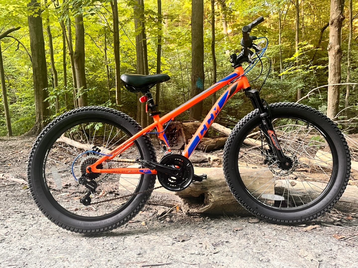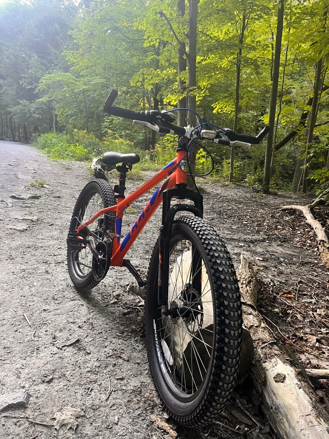 Orange mountain bike with front suspension and disc brakes. 24-inch wheels. Bought 3 months ago, everything is in great condition. Works well in snow as well!!
