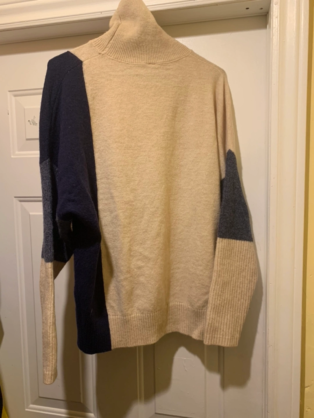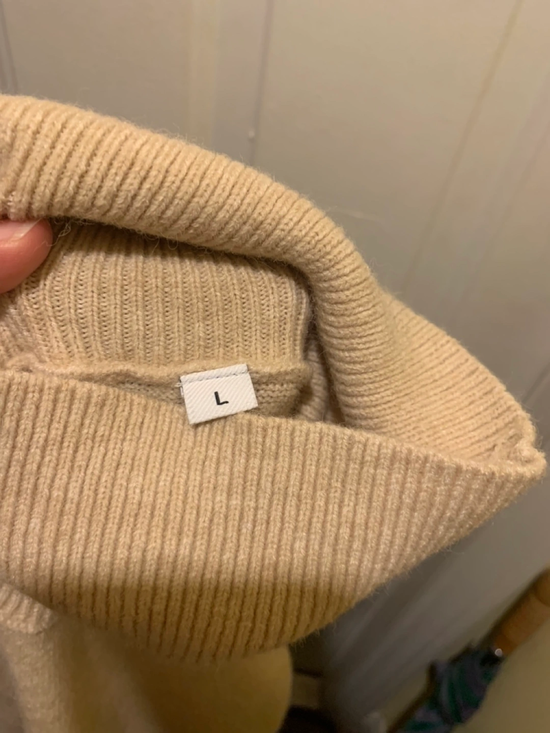 Never wore, doesn’t specify material but feels like a wool-acrylic blend, soft not scratchy. Large but not oversized.