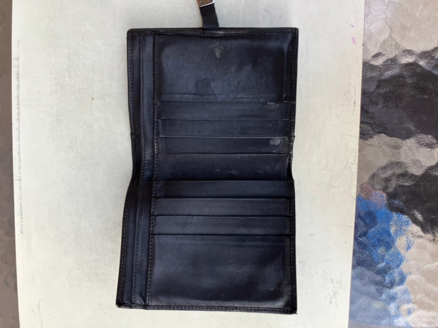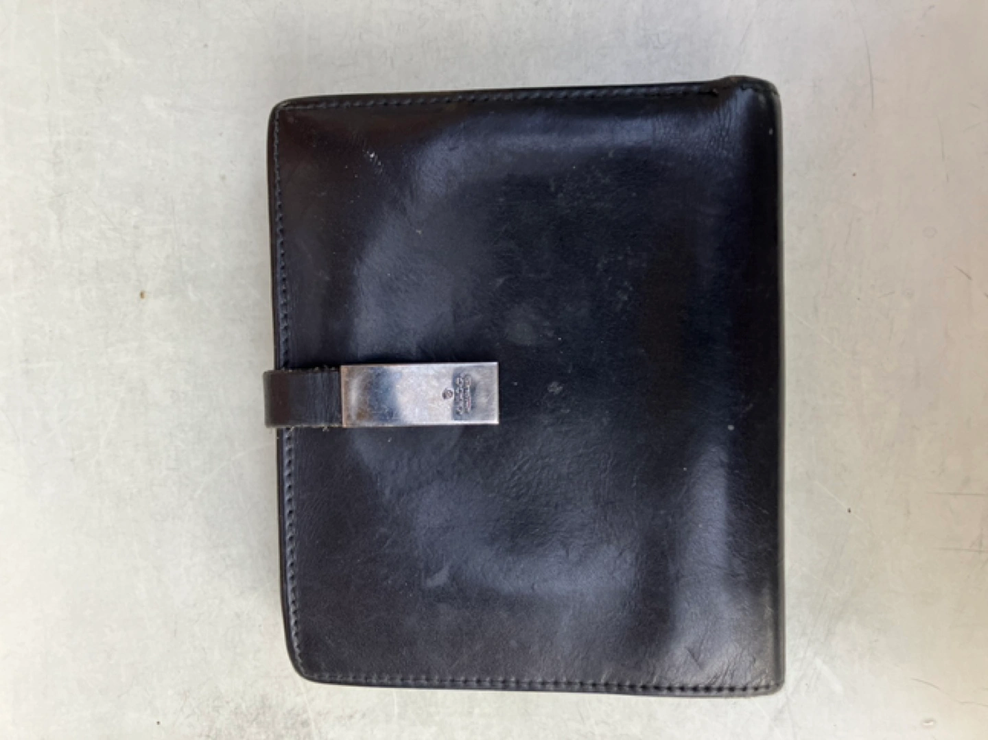 Vintage Gucci black leather wallet with silver hardware. Has multiple card slots and a billfold.