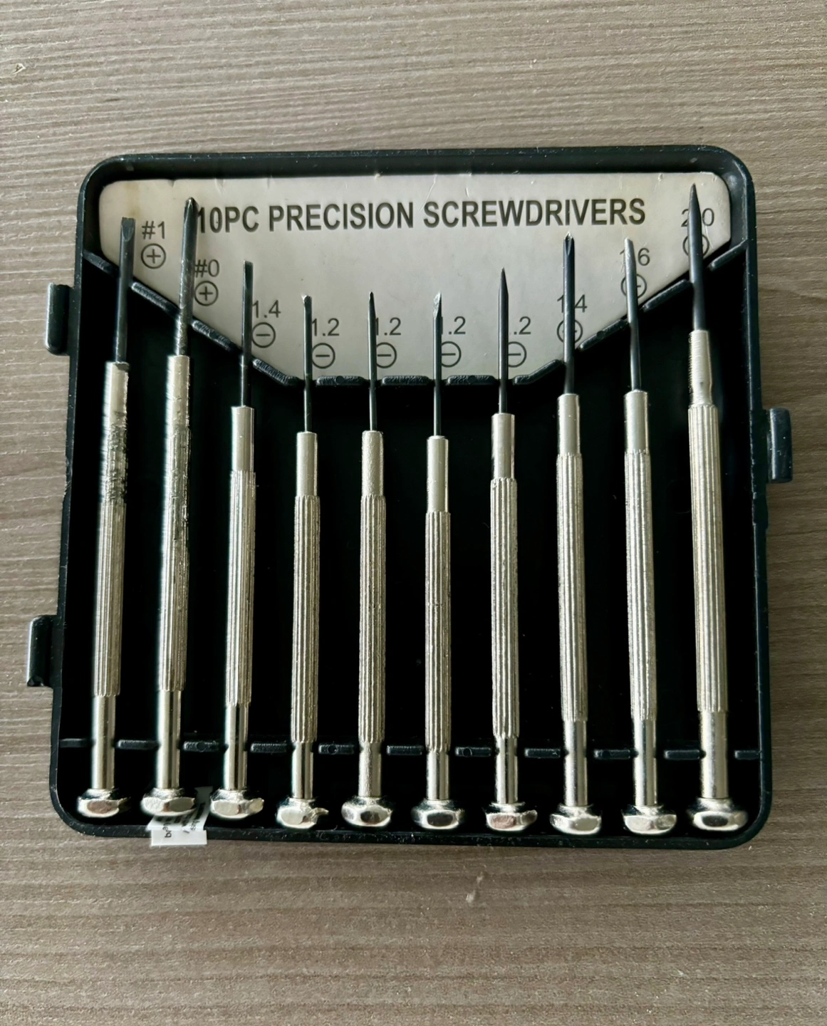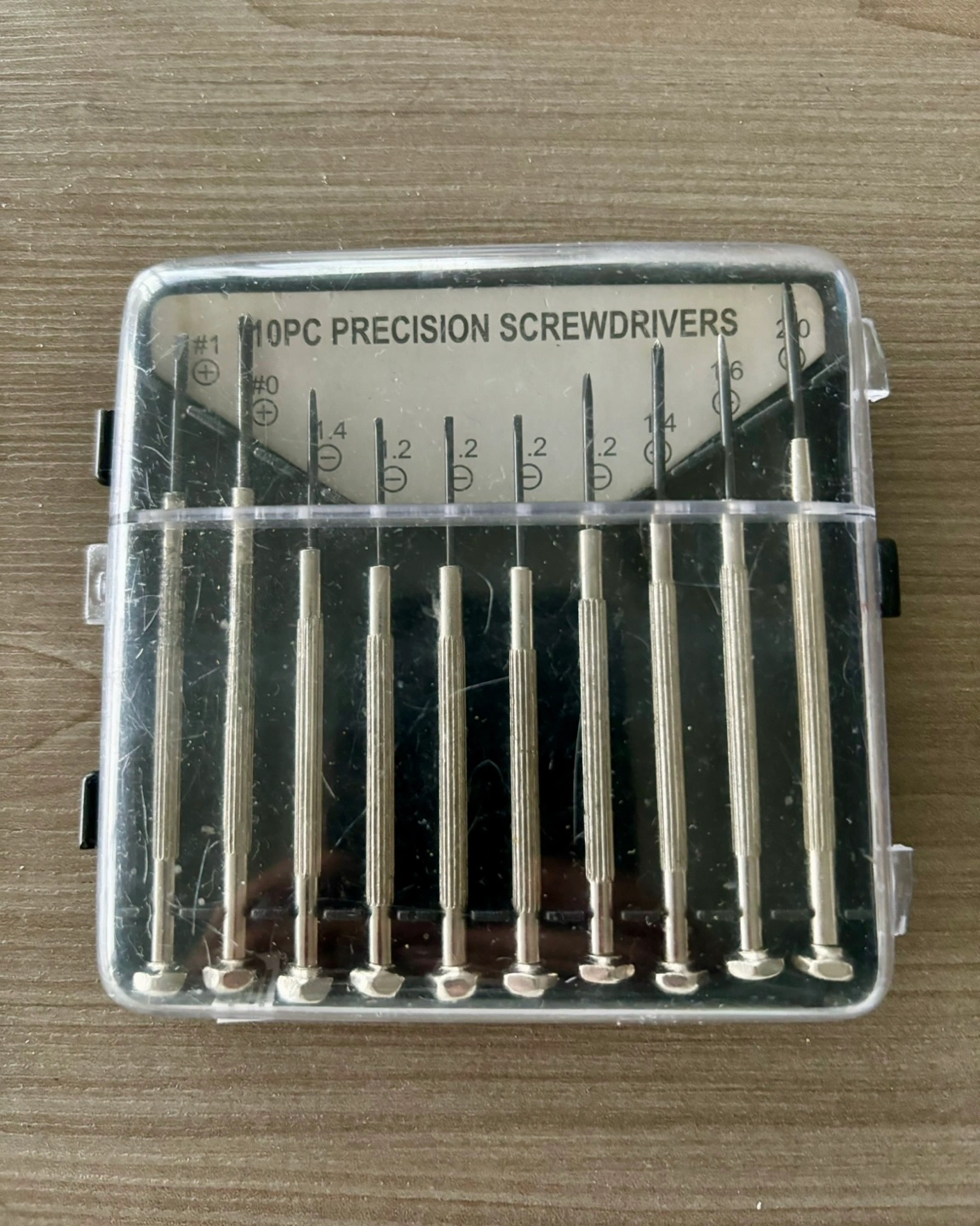 Set of 10 precision screwdrivers in a plastic case about 4”x4”, Includes various sizes and types. Click on my name above to see my other listings and pickup locations.