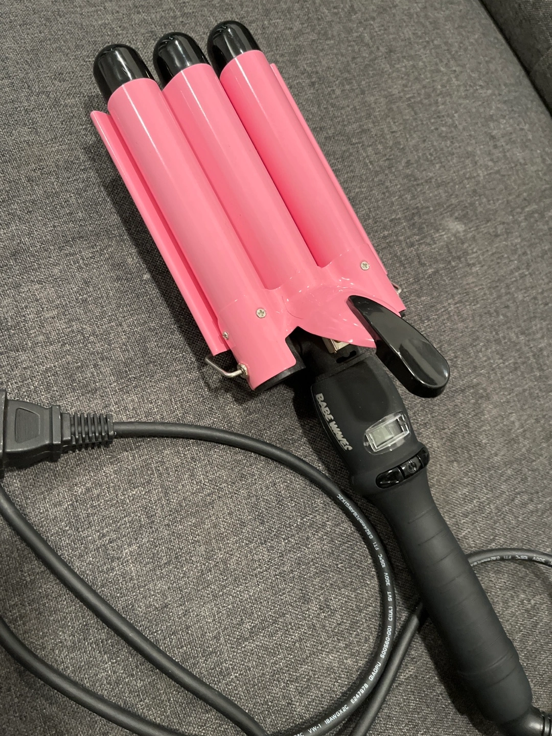 Pink 3 barrel curling iron. Its new. Also has a stand to rest on while using. i like my natural straight hair so selling this one. It was a gift.