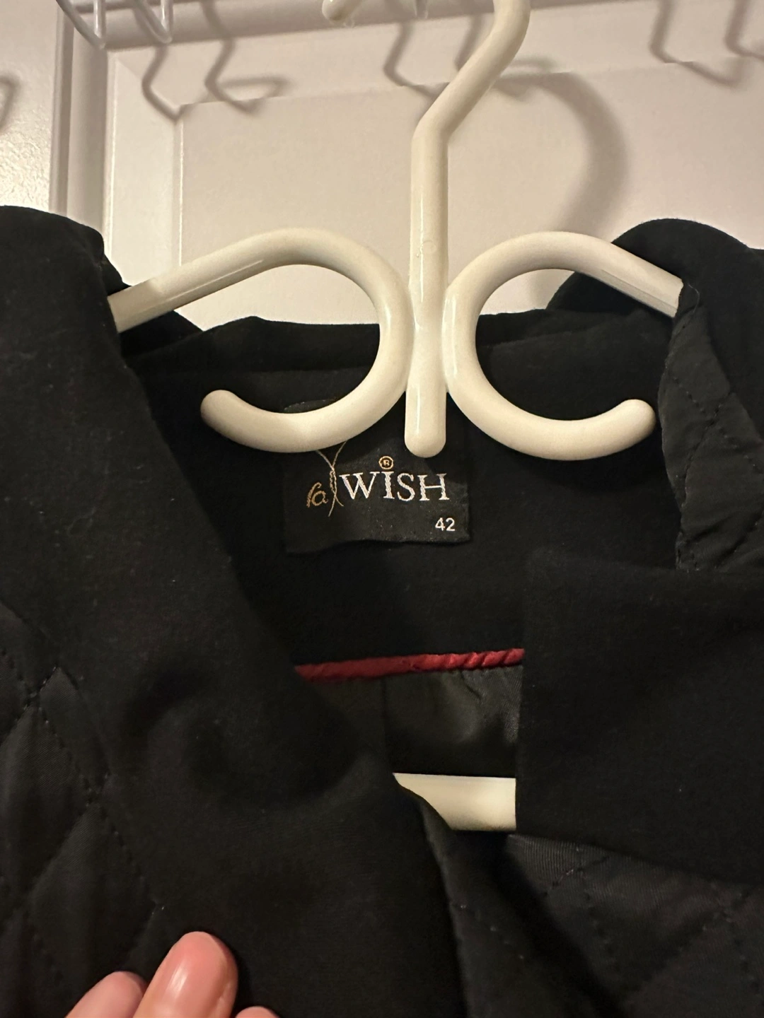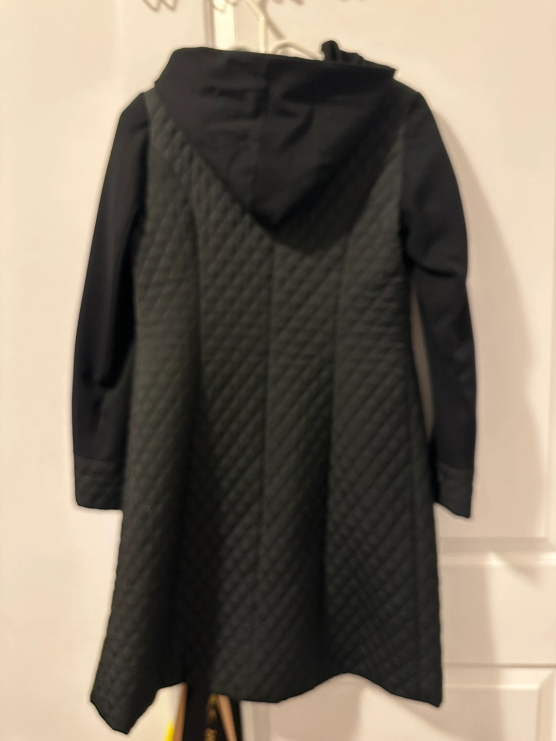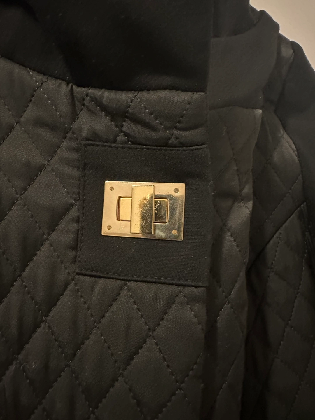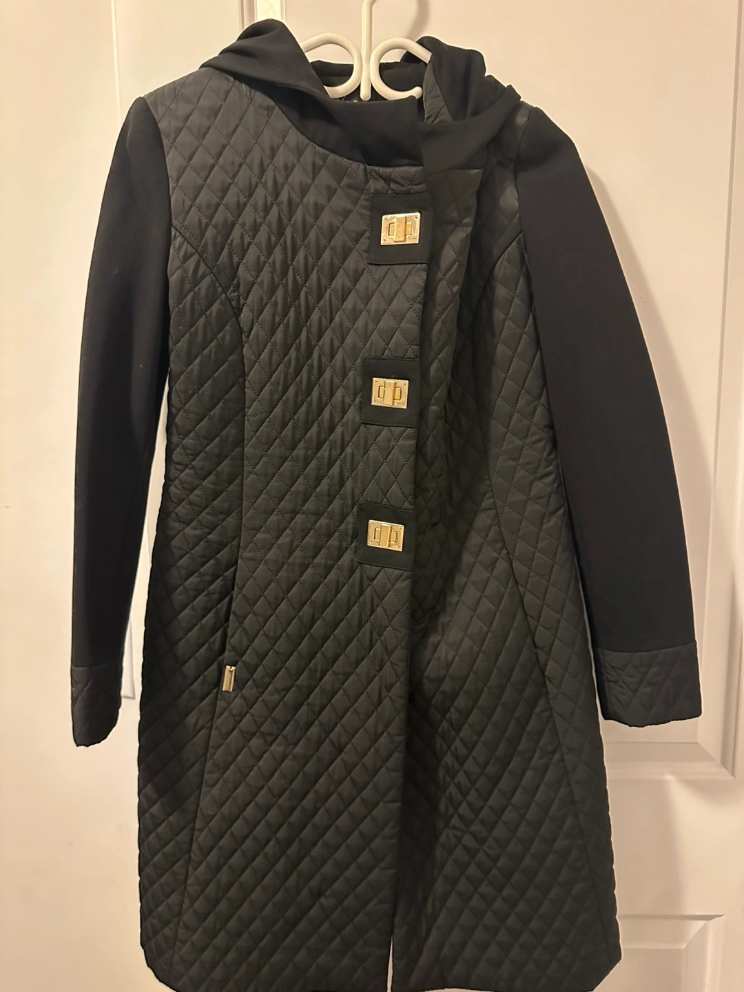 Black quilted jacket with hood, size 42. Features gold buttons and a zipper. Long sleeves.