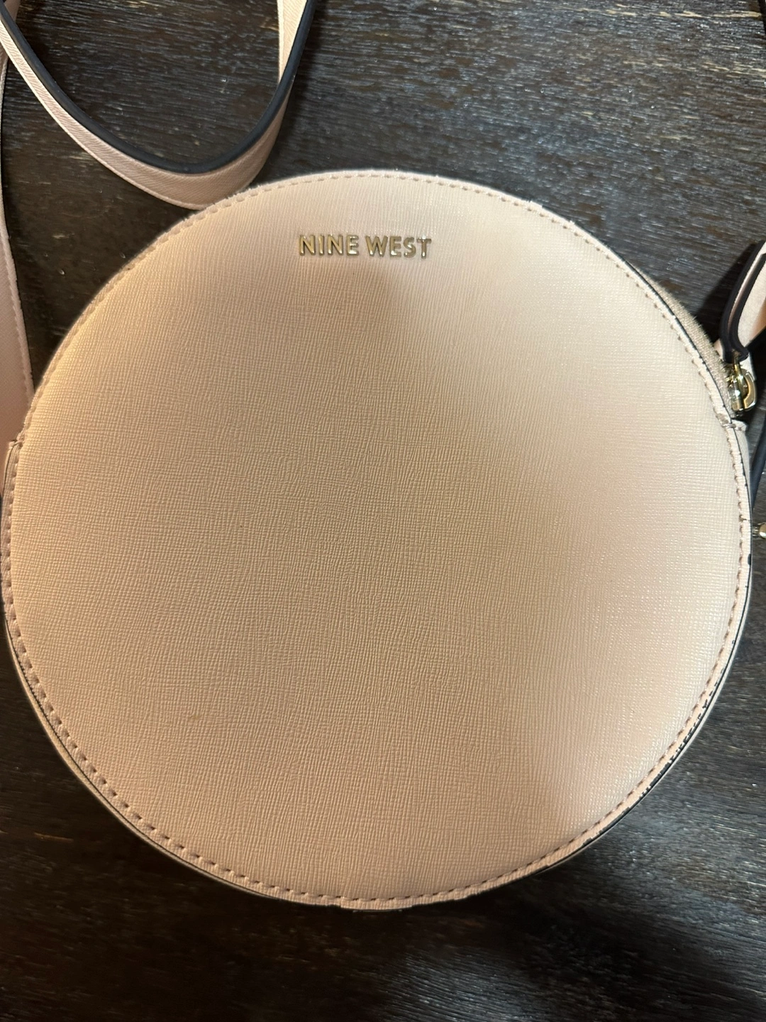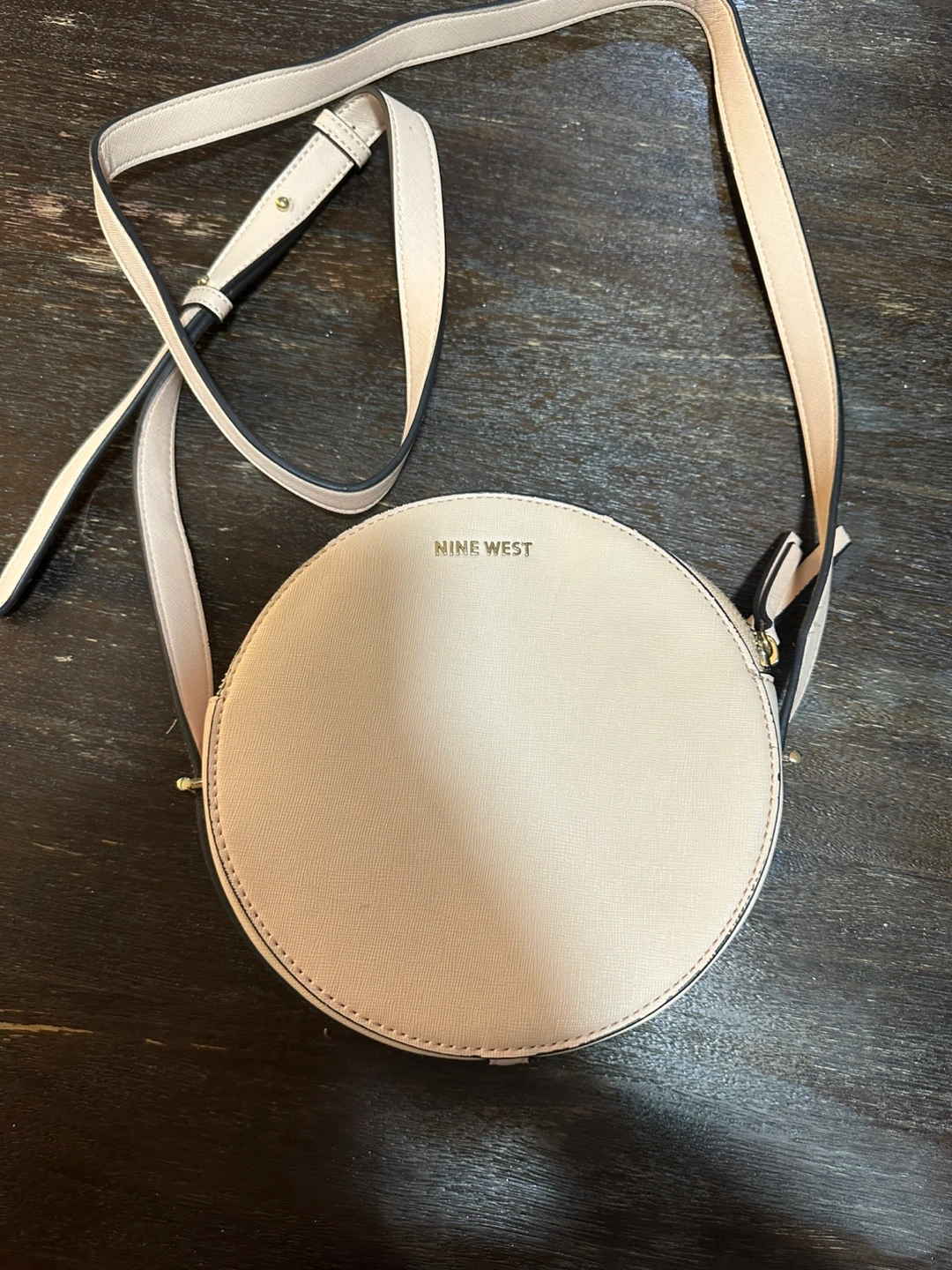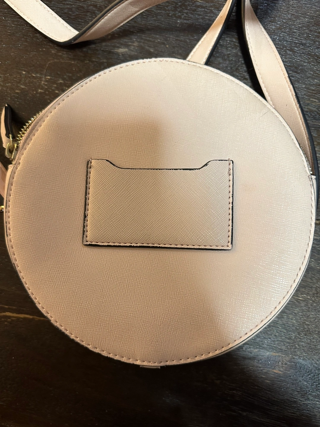 Round crossbody bag with adjustable strap. Has a zipper closure and a small pocket on the back.