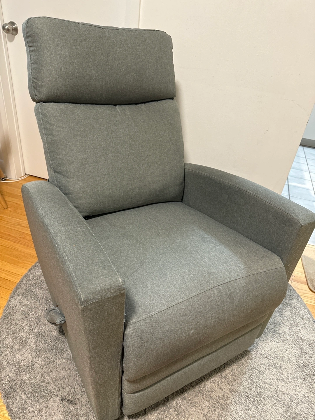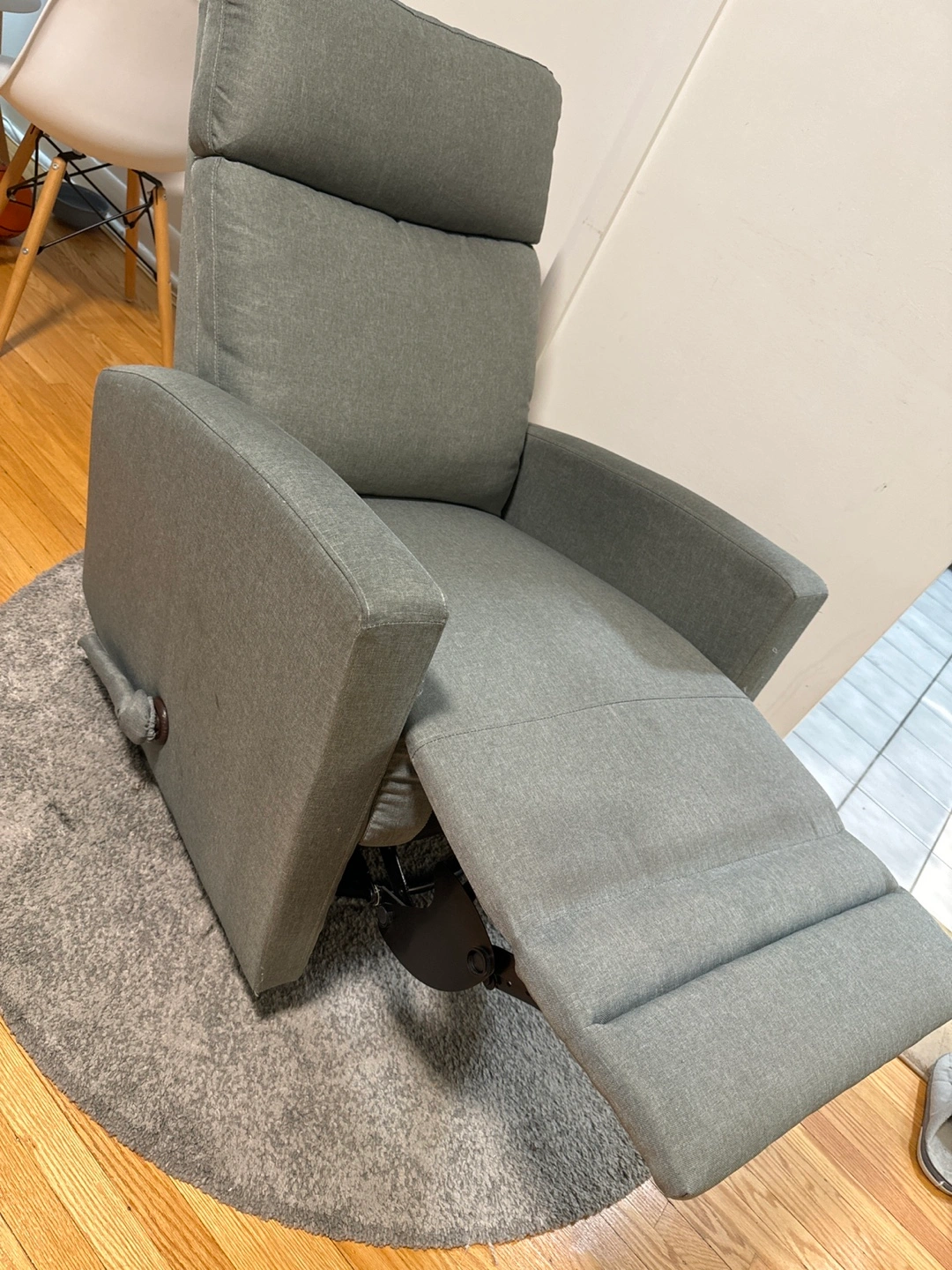 Grey fabric reclining armchair with swivel base. The chair is in good condition. No pillow. Has some stains but can be hidden using a base cover. Chair starts to squeak if rocked for long otherwise idle for relaxing / reading - has a comfortable cushioning at the back & base. Works Perfectly in chaise lounge position. You can take rug for another $10 (has some oil stains mostly under the chair)