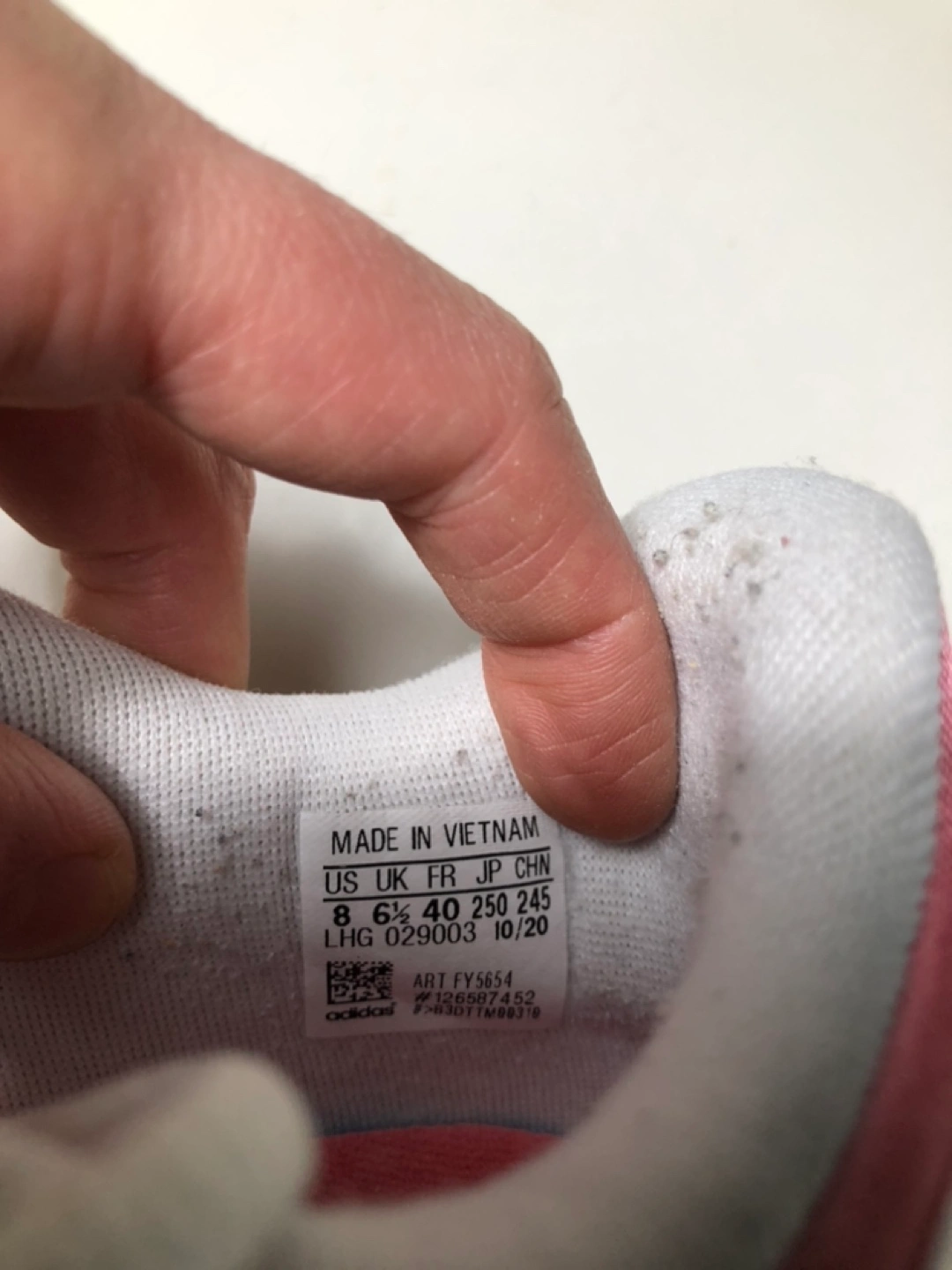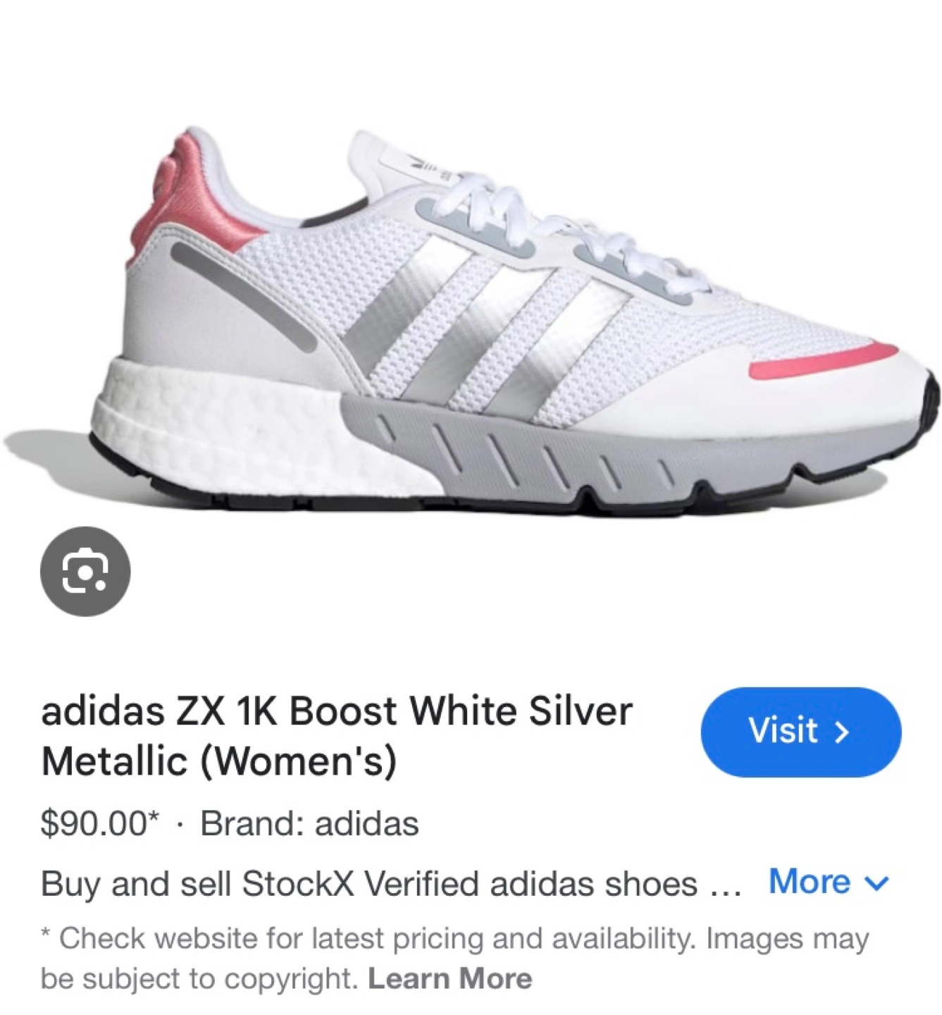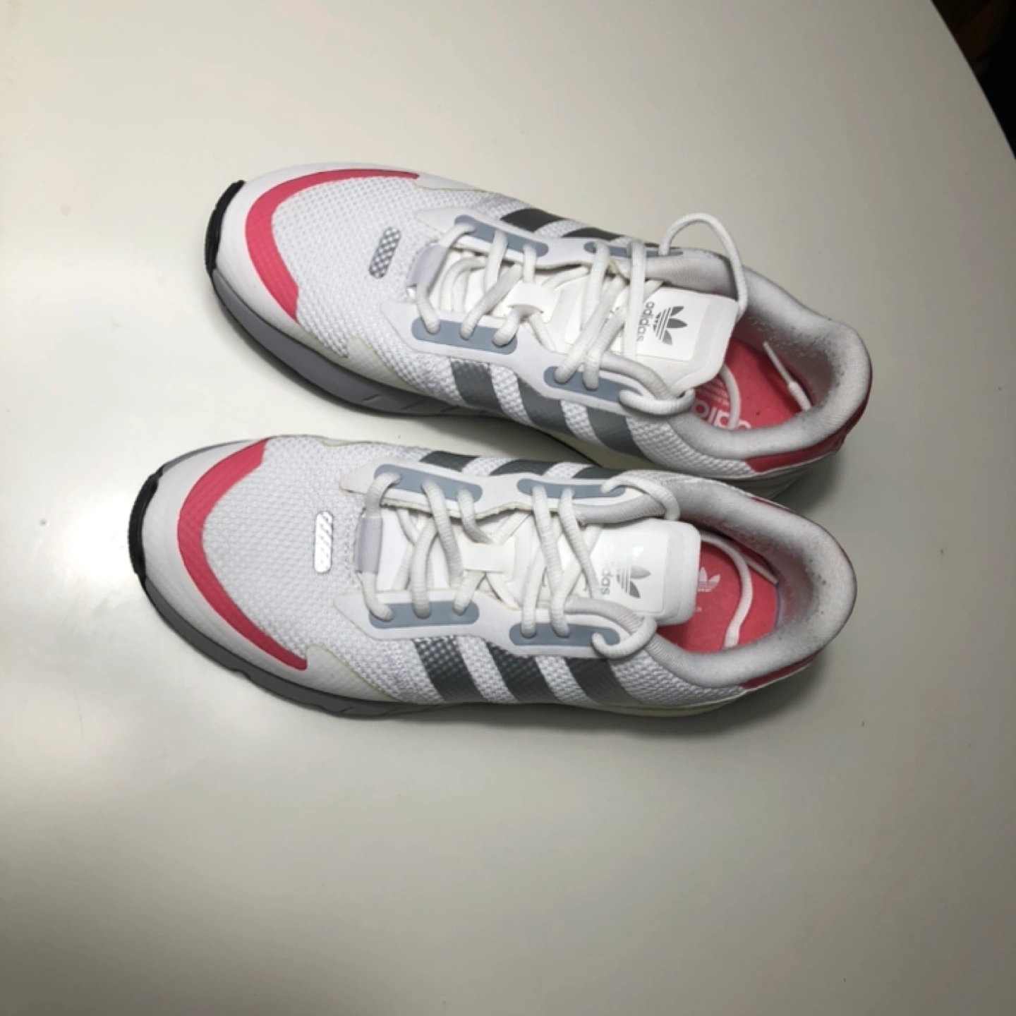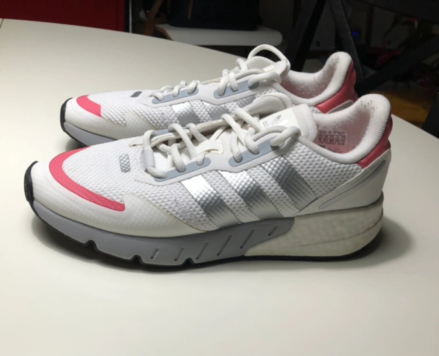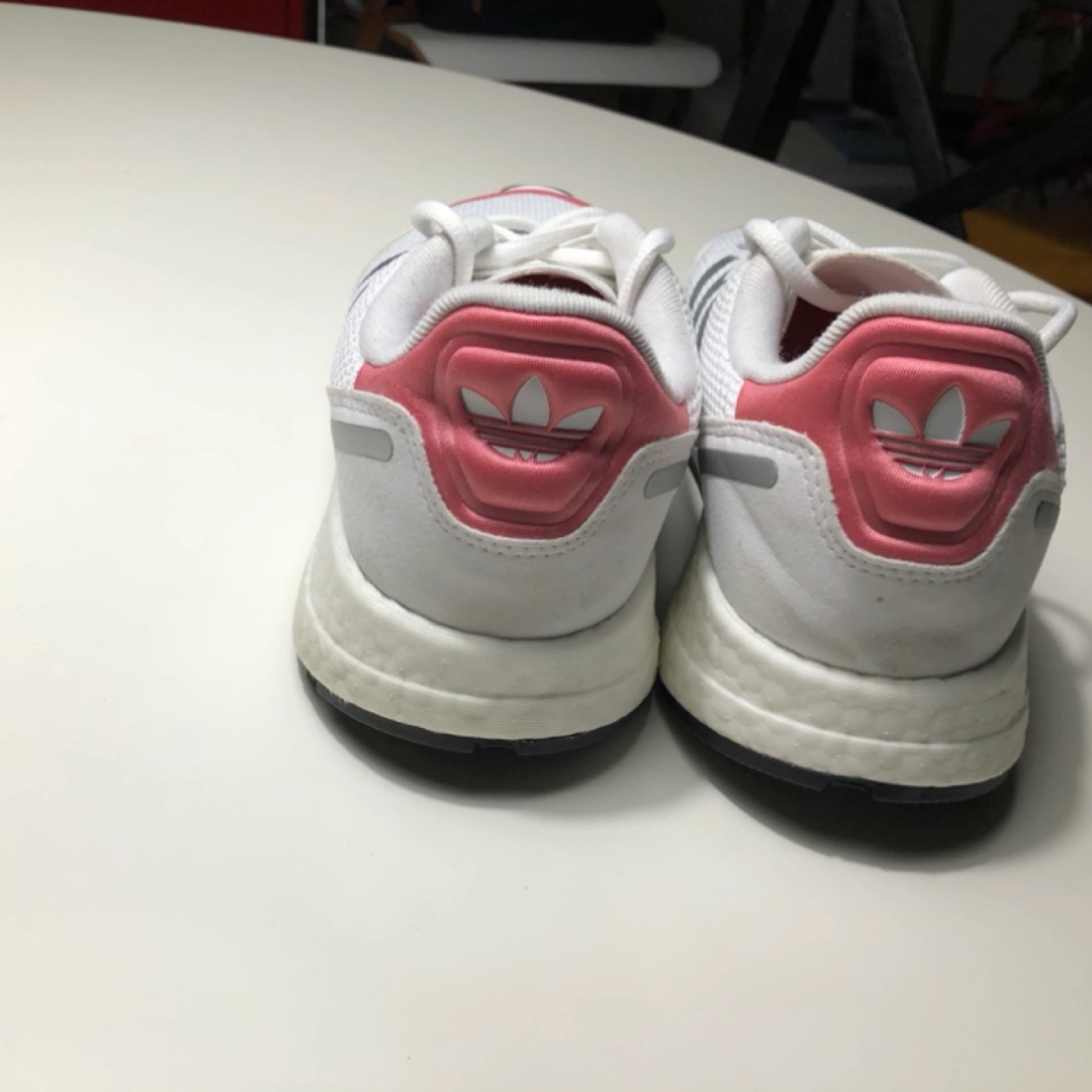 White mesh running shoes with high visibility metallic/silver stripes and pink accents. Excellent/like new condition. Size US 8. Ultra-comfortable, with mesh upper and lace up closure. Boost/EVA midsole and rubber outsole offer a stable feel and a good grip. Sold out on Adidas website