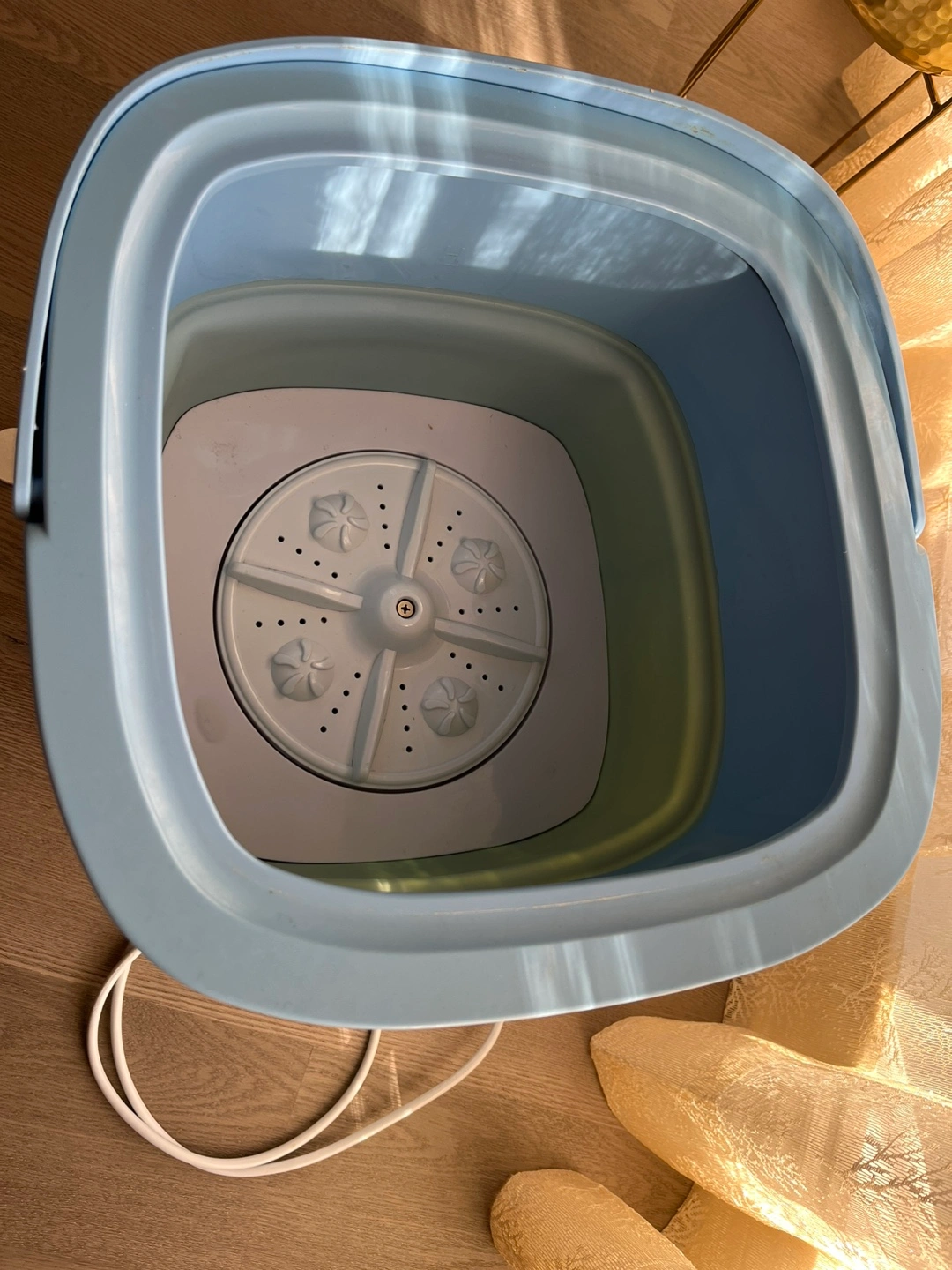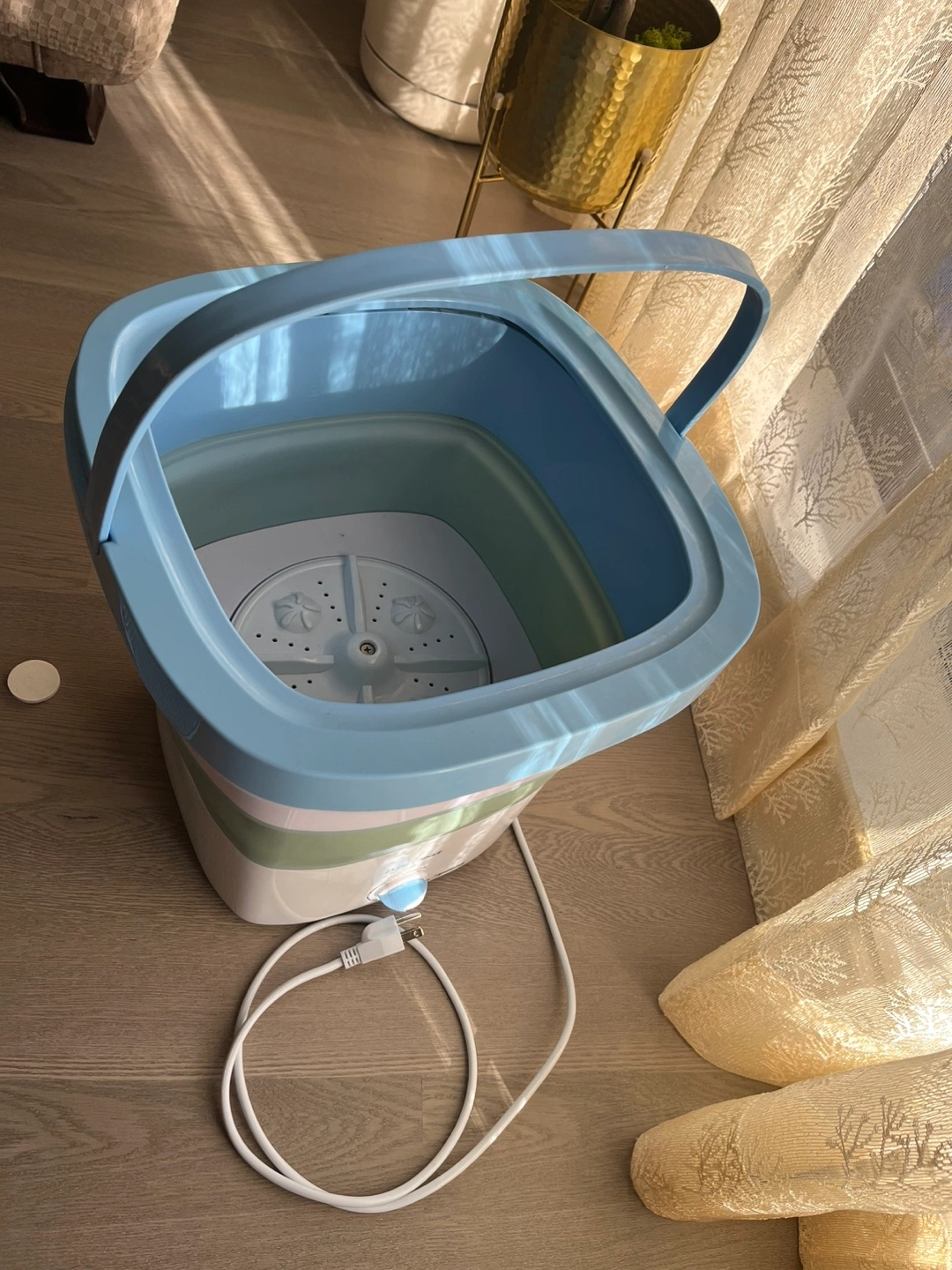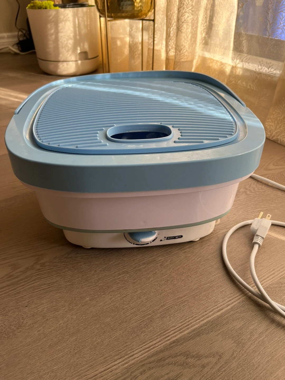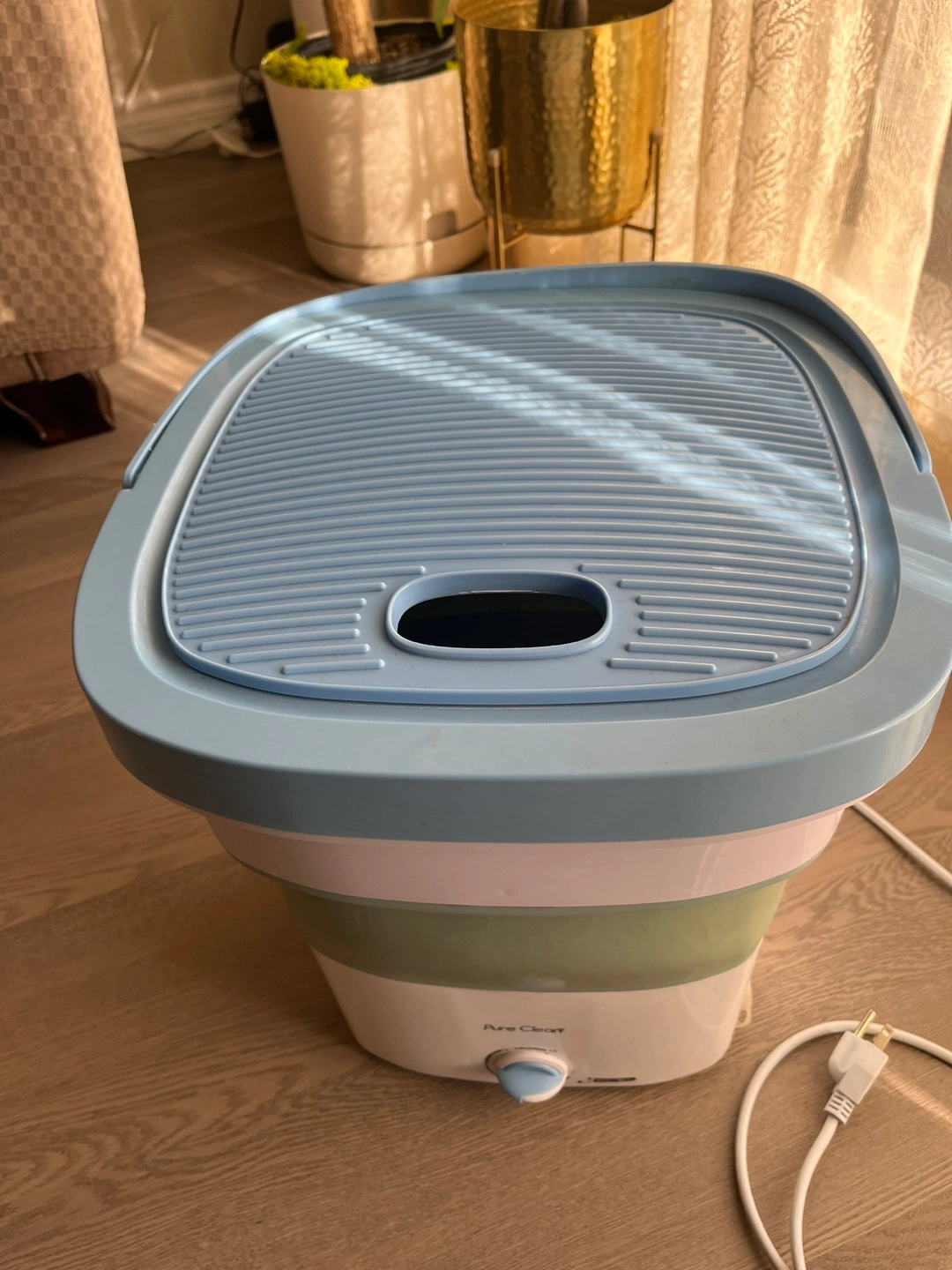 Small, portable washing machine, blue and white, with a handle, ideal for small loads of laundry. Pure Clean, Portable and collapsible Washing Machine for Travel, Camping & Dorm.