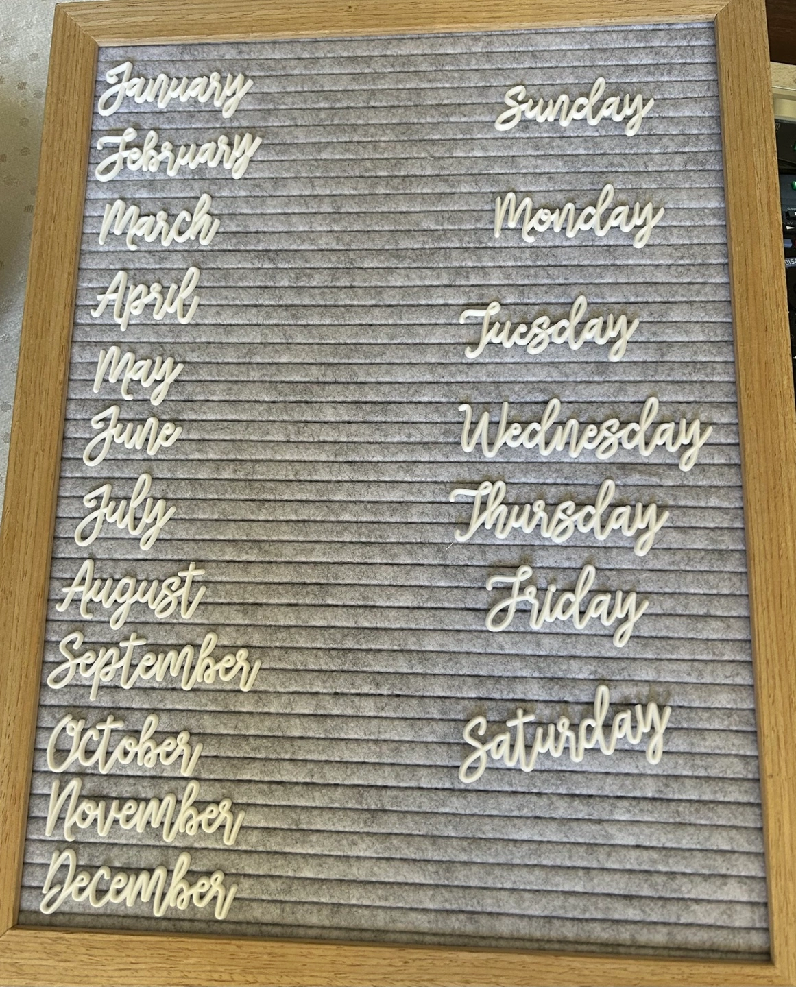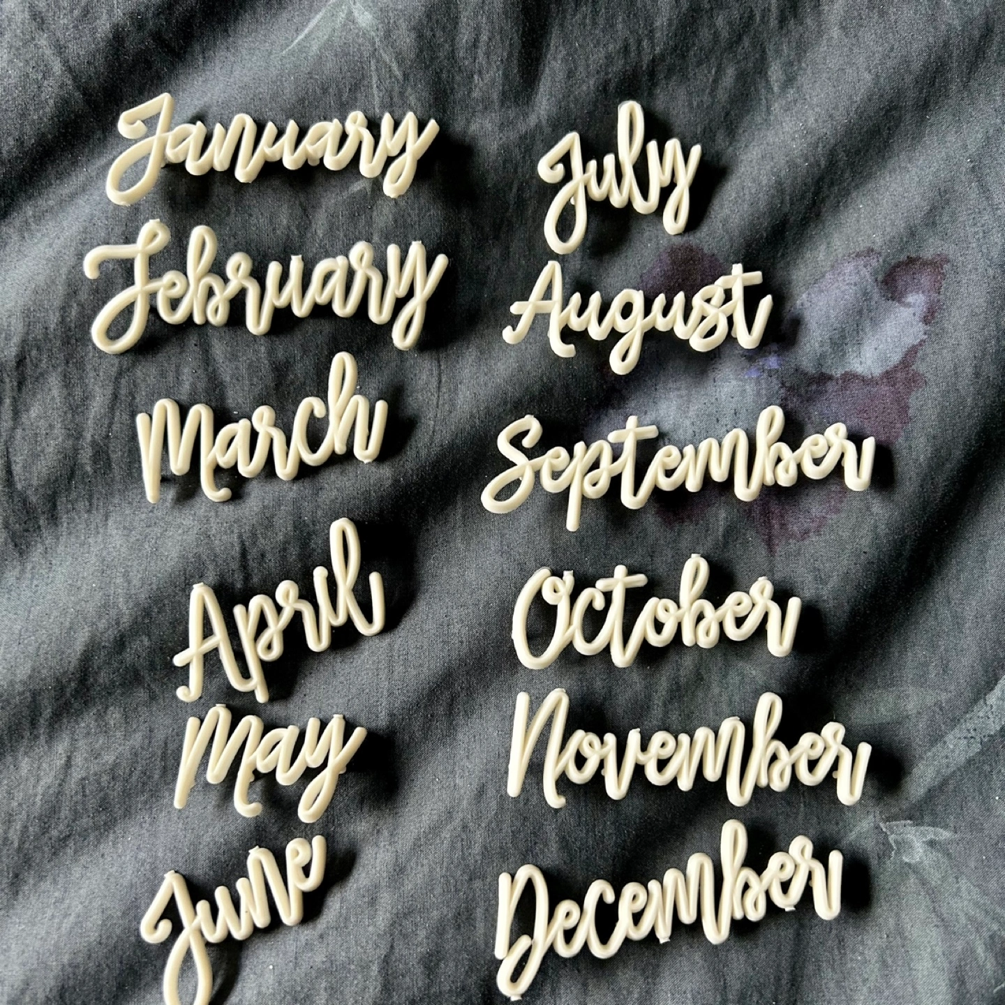 White plastic month letters in a canvas bag. Perfect for your letter board!