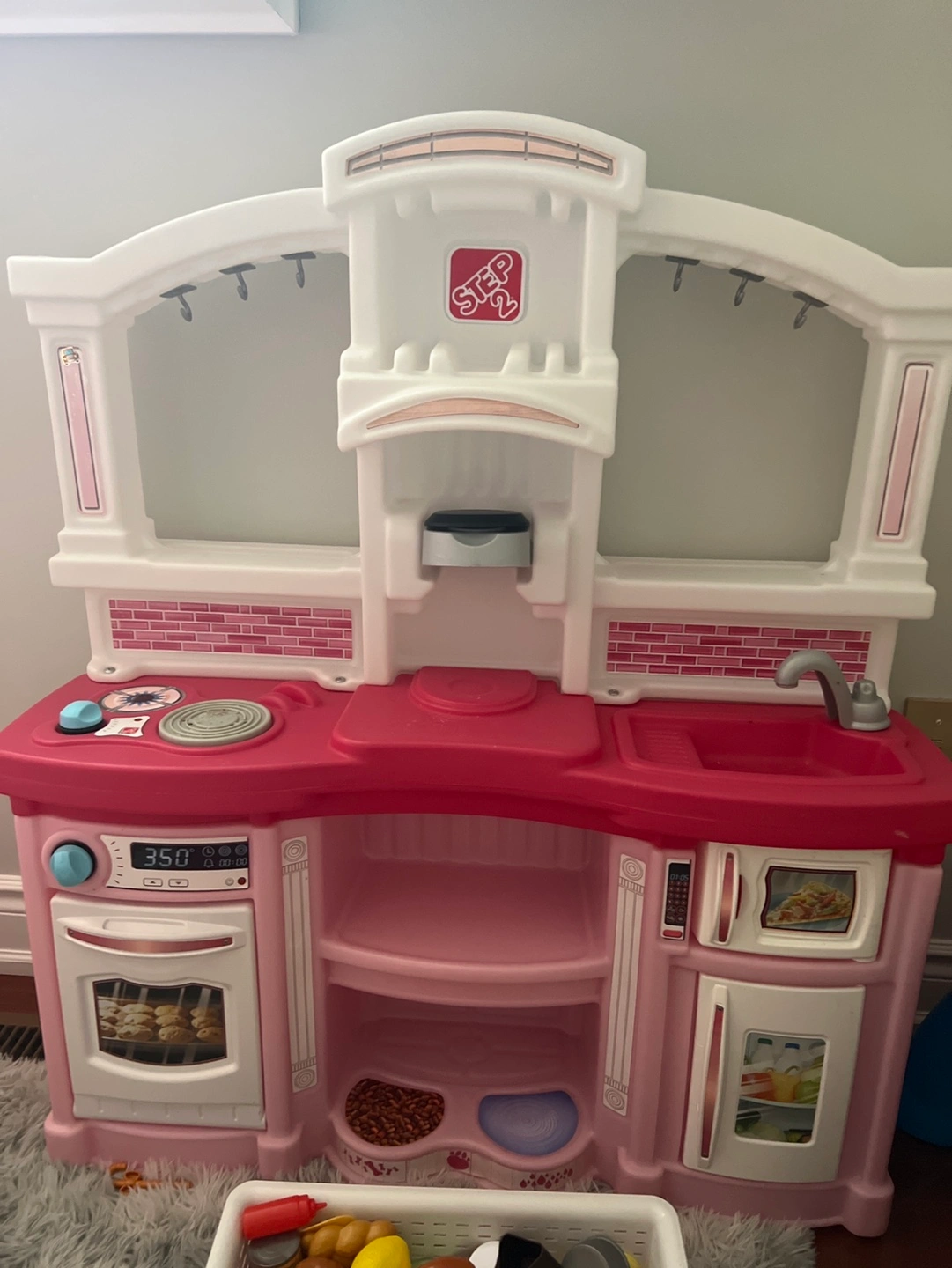 Pink and white play kitchen. Includes sink, stove, oven, fridge, and shelves. Has some minor wear and tear.