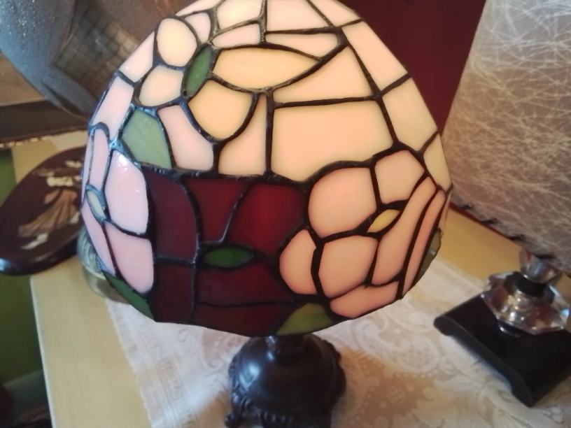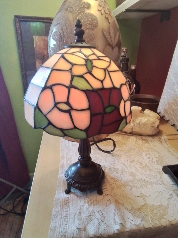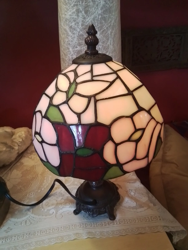 Tiffany type lamp with bronze base Measurements: 14"H x 9"W Stained Glass Table Lamp in excellent working condition fine condition Stained glass table lamp with pink and red flowers. Has a bronze base with a decorative design. Pickup at Young Street and Steels Ave