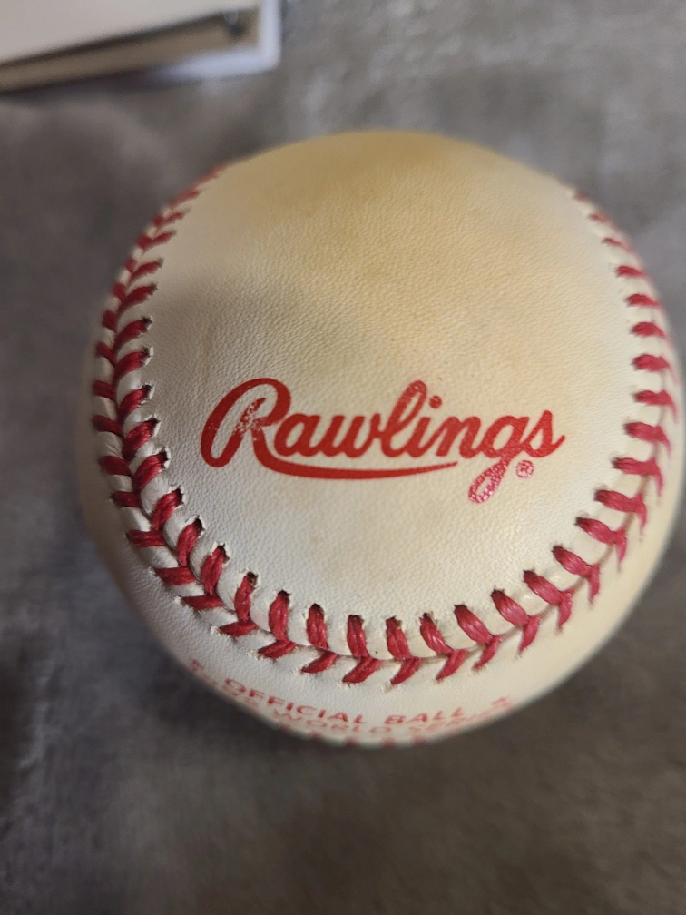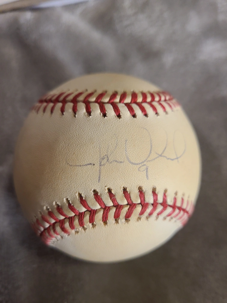 Rawlings baseball signed by John Olerud, 1992 World Series. In display case with plaque.