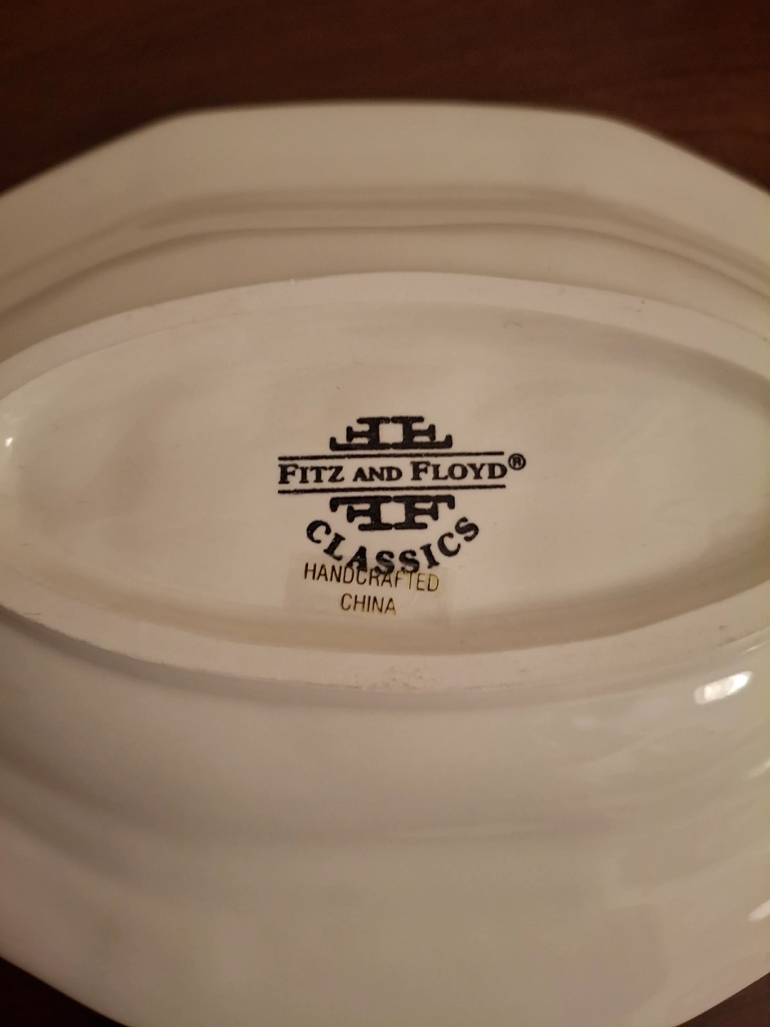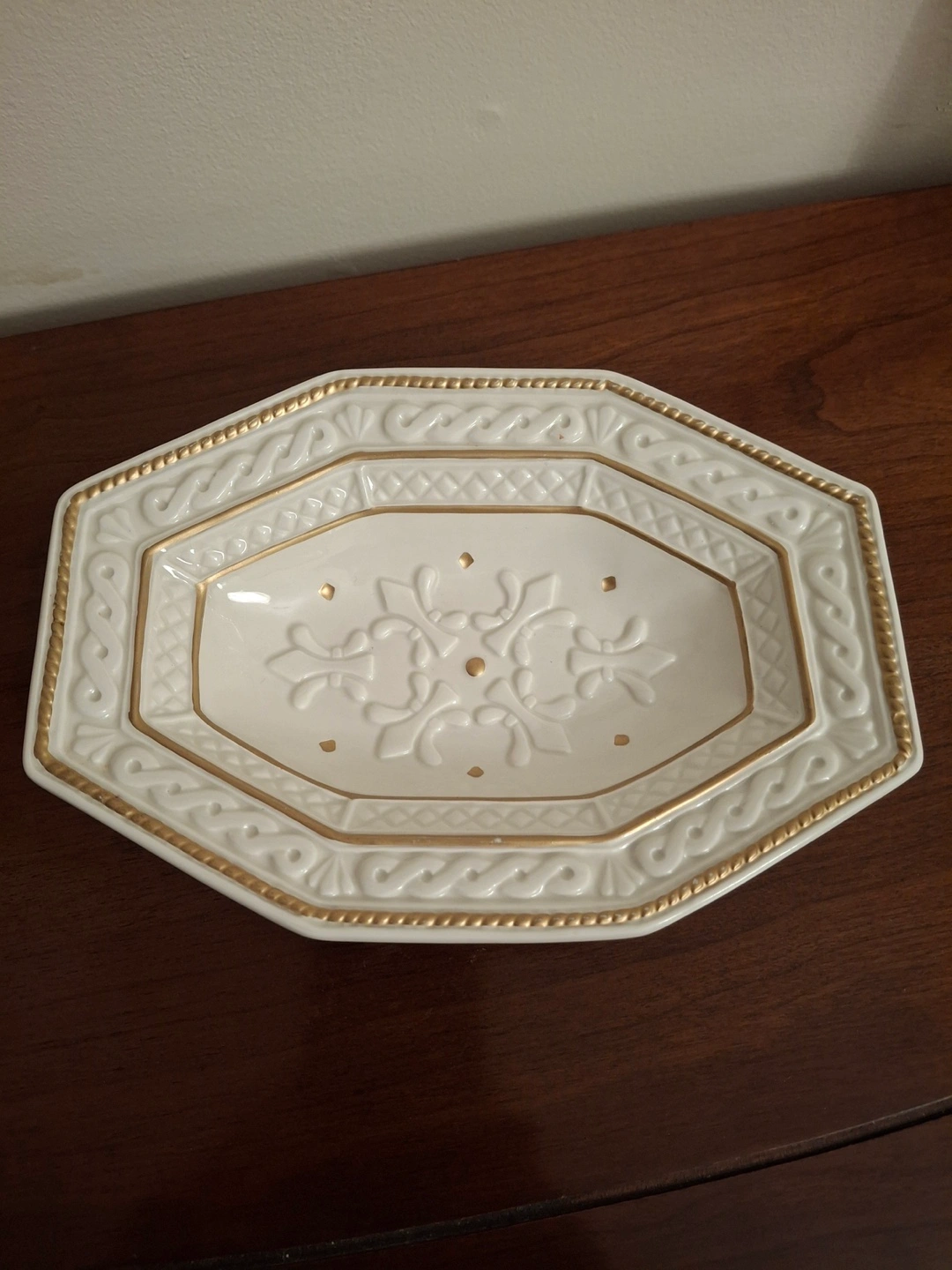 Cream octangular dish with gold detailing & gold ball edging. Good for nuts, candies, pickles etc. 7.5” x 5.25”. Good condition. Available for pickup in Markland Wood.