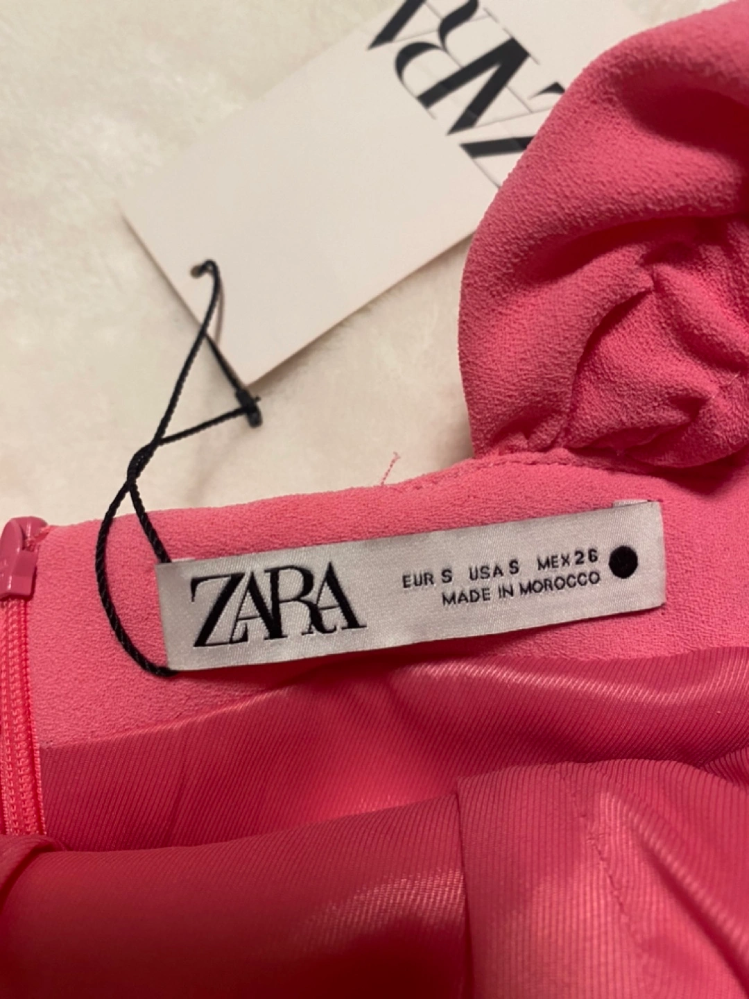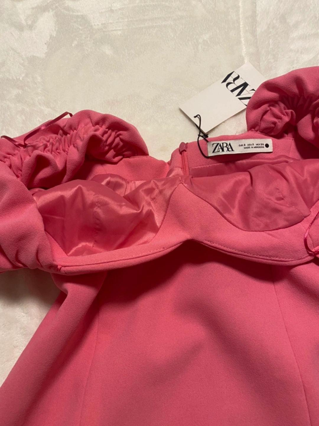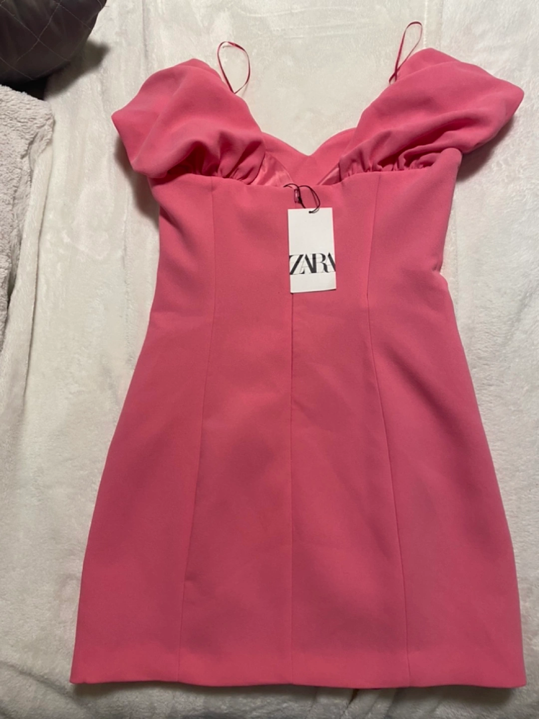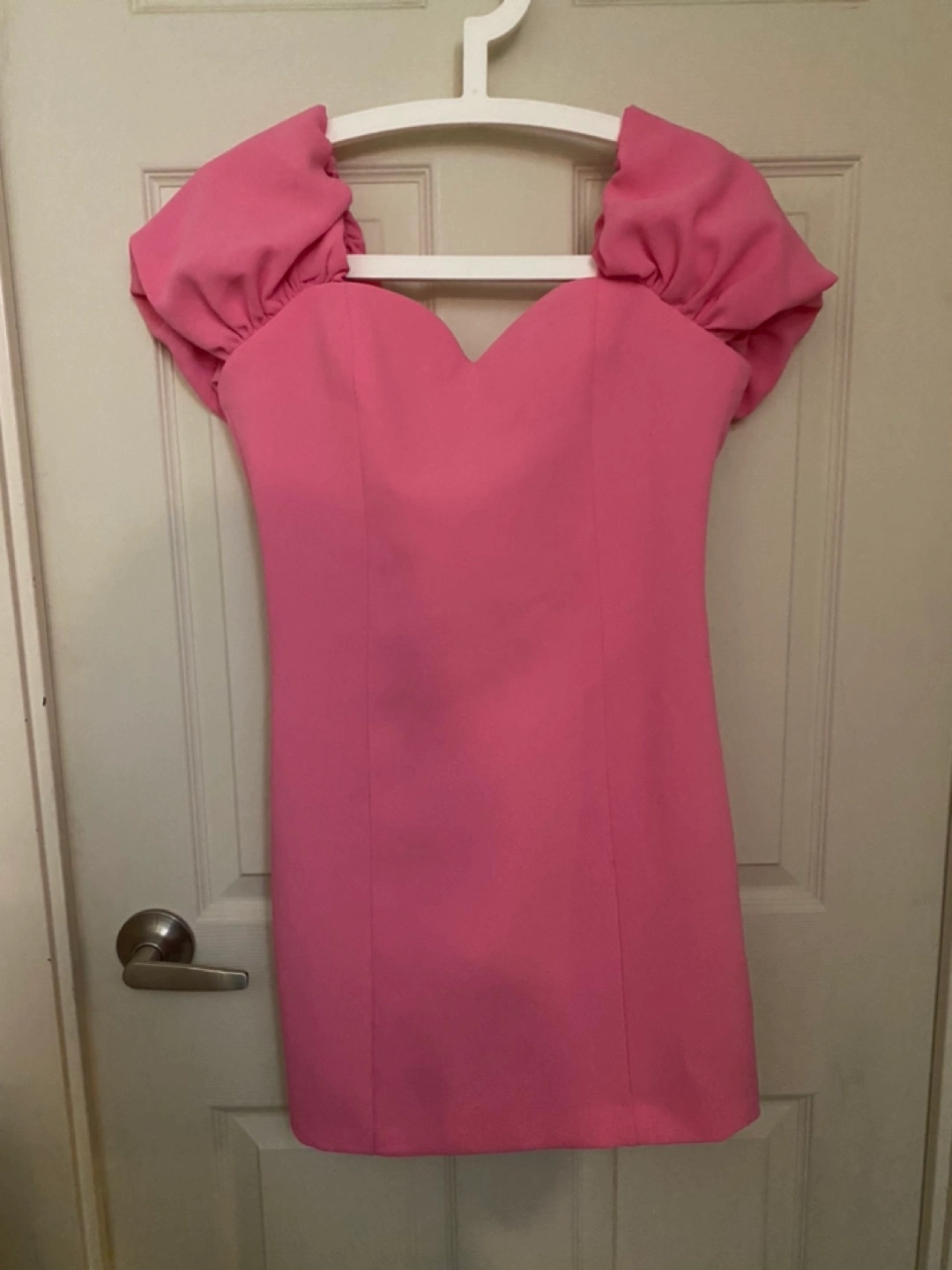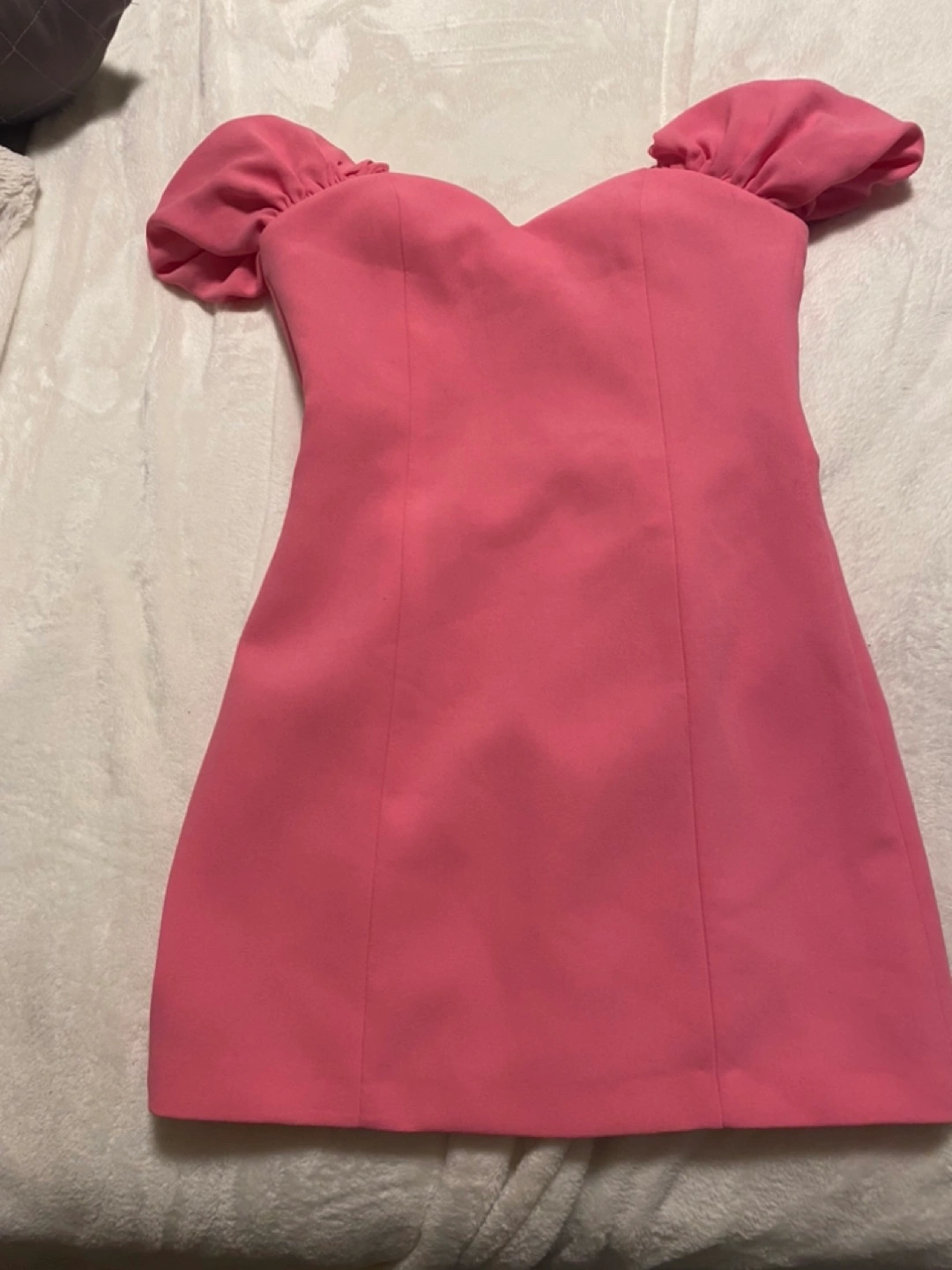Pink mini dress with puff sleeves. Heart shaped neckline. Zipper closure. Made in Morocco. Never worn with tags.