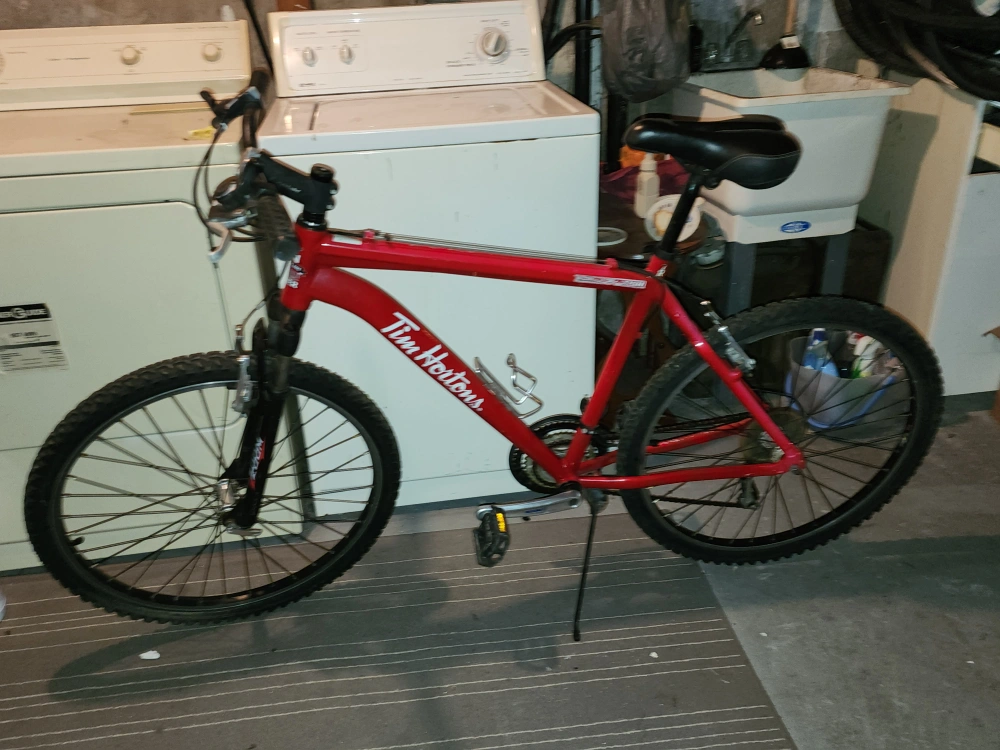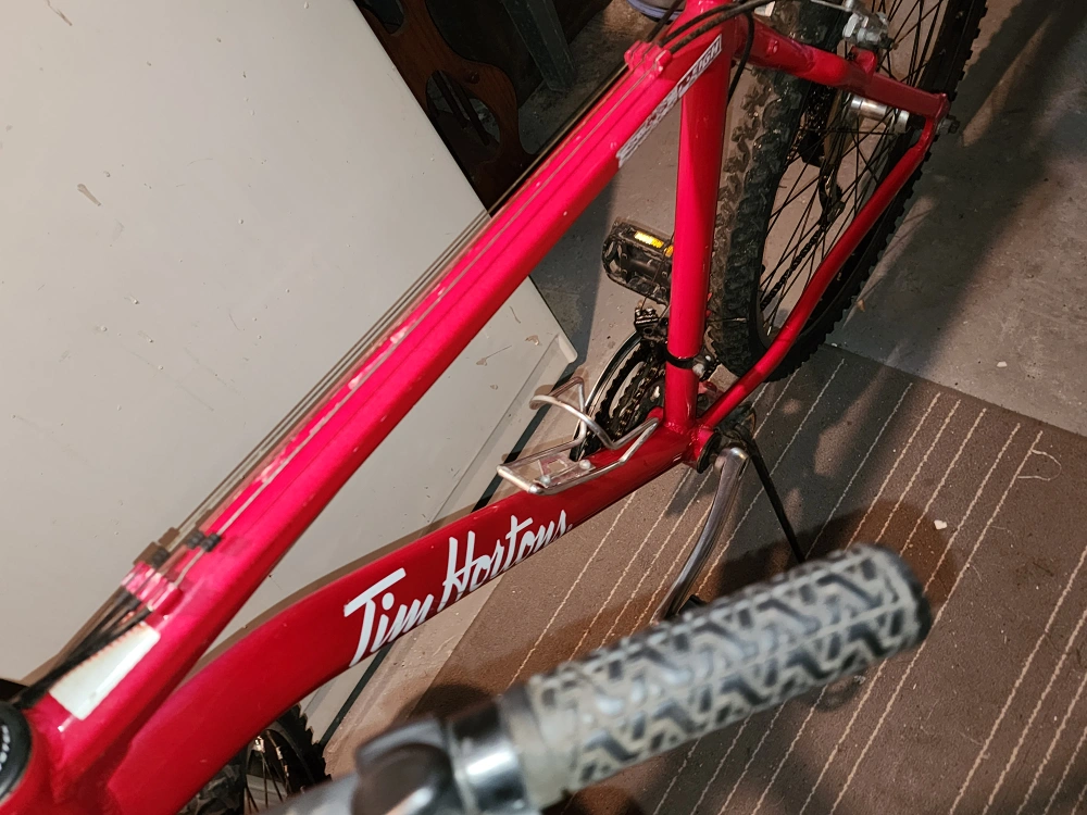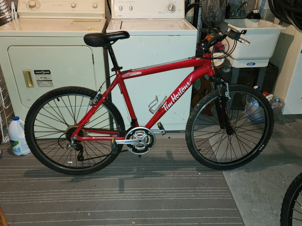 I'm selling my limited edition Raleigh 2011 Tim Hortons 25th roll up the rim anniversary bicycle. It's been ridden, it has flaws its not perfect. But it's mechanically perfect. It's a 21 speed bike and has 26x1.95 tires. This bike is a Canadian icon and has/will turn heads! Perfect Christmas present for the tims lover in your life! Asking 225 obo