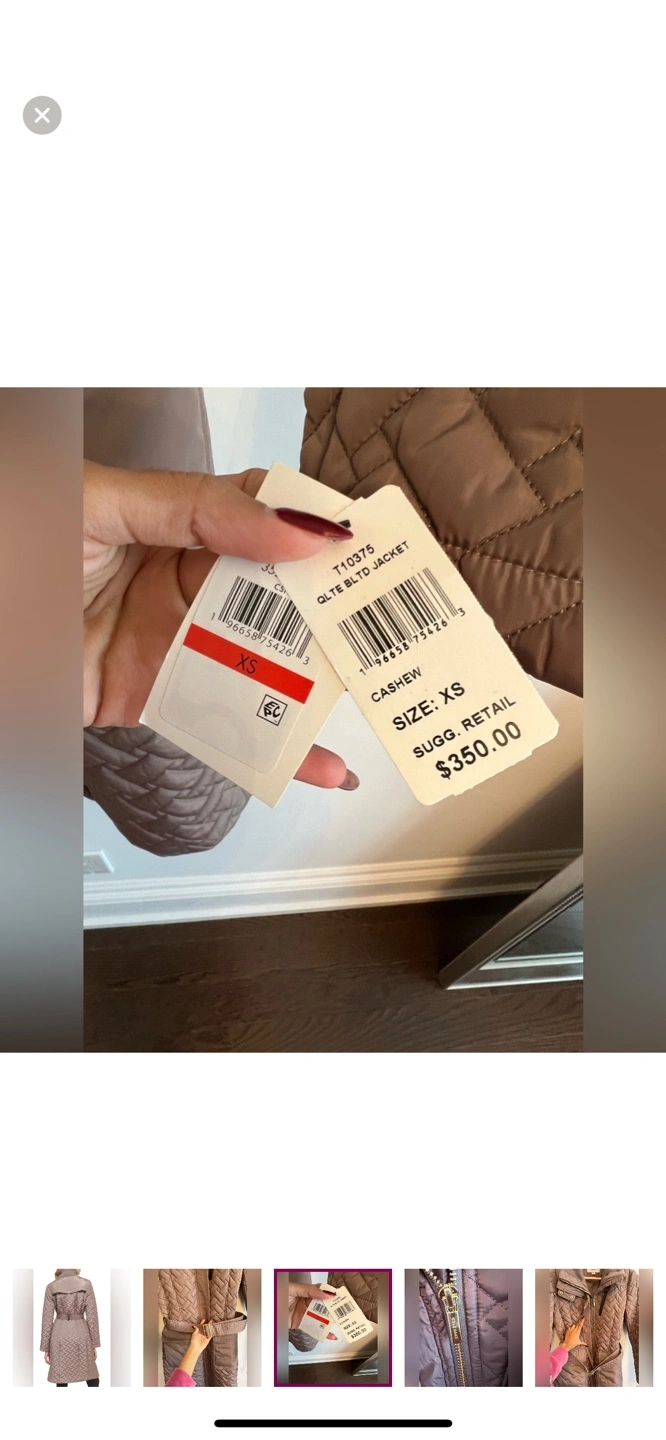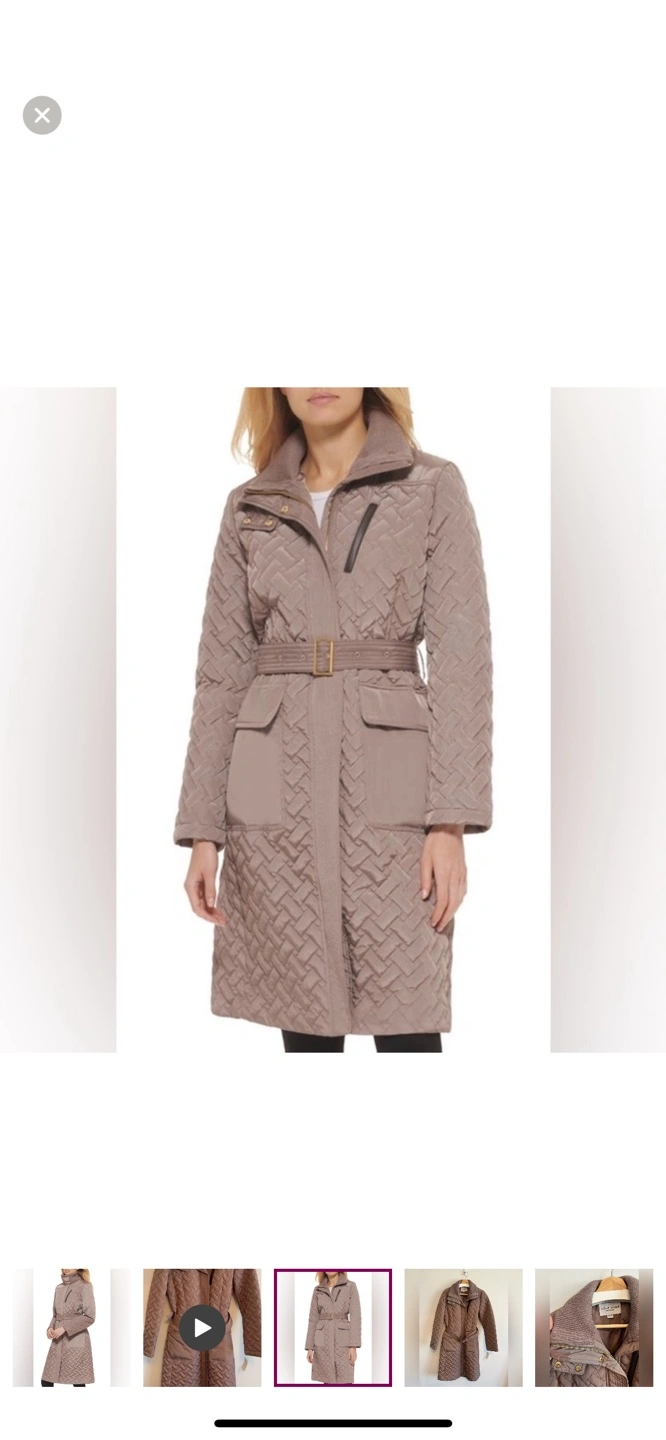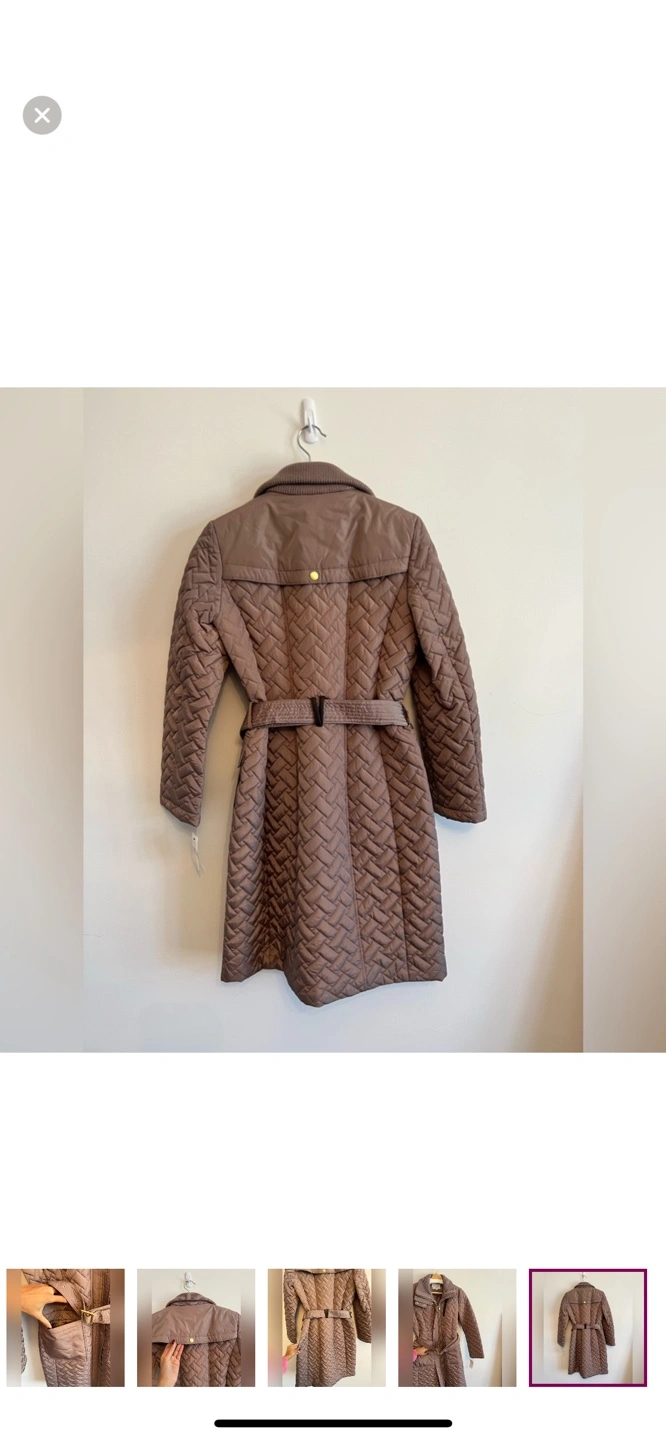 Brown quilted jacket with belt. Has two pockets, one zippered. Zipper closure.
