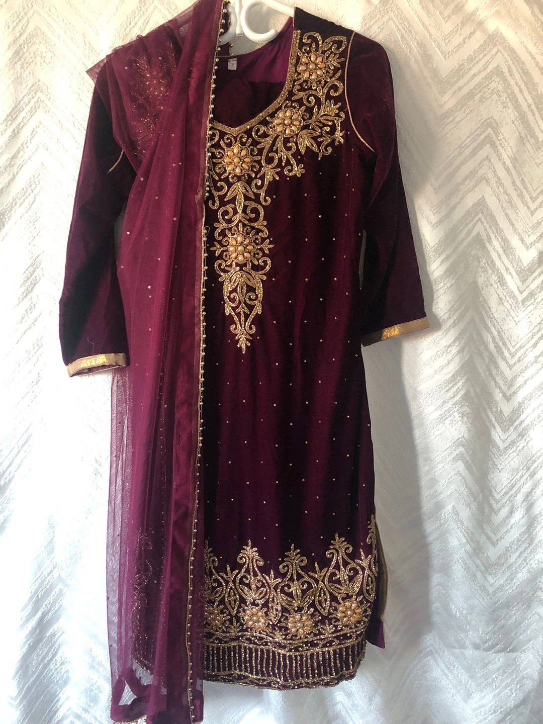 Burgundy velvet salwar kameez suit with gold embroidery. Includes a matching dupatta.