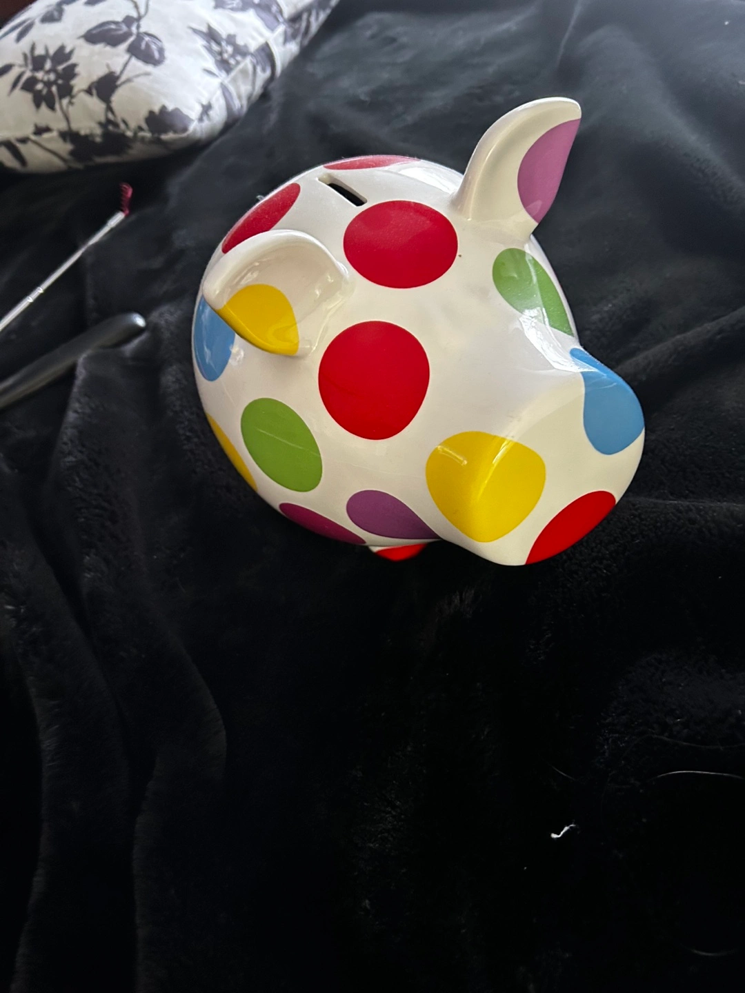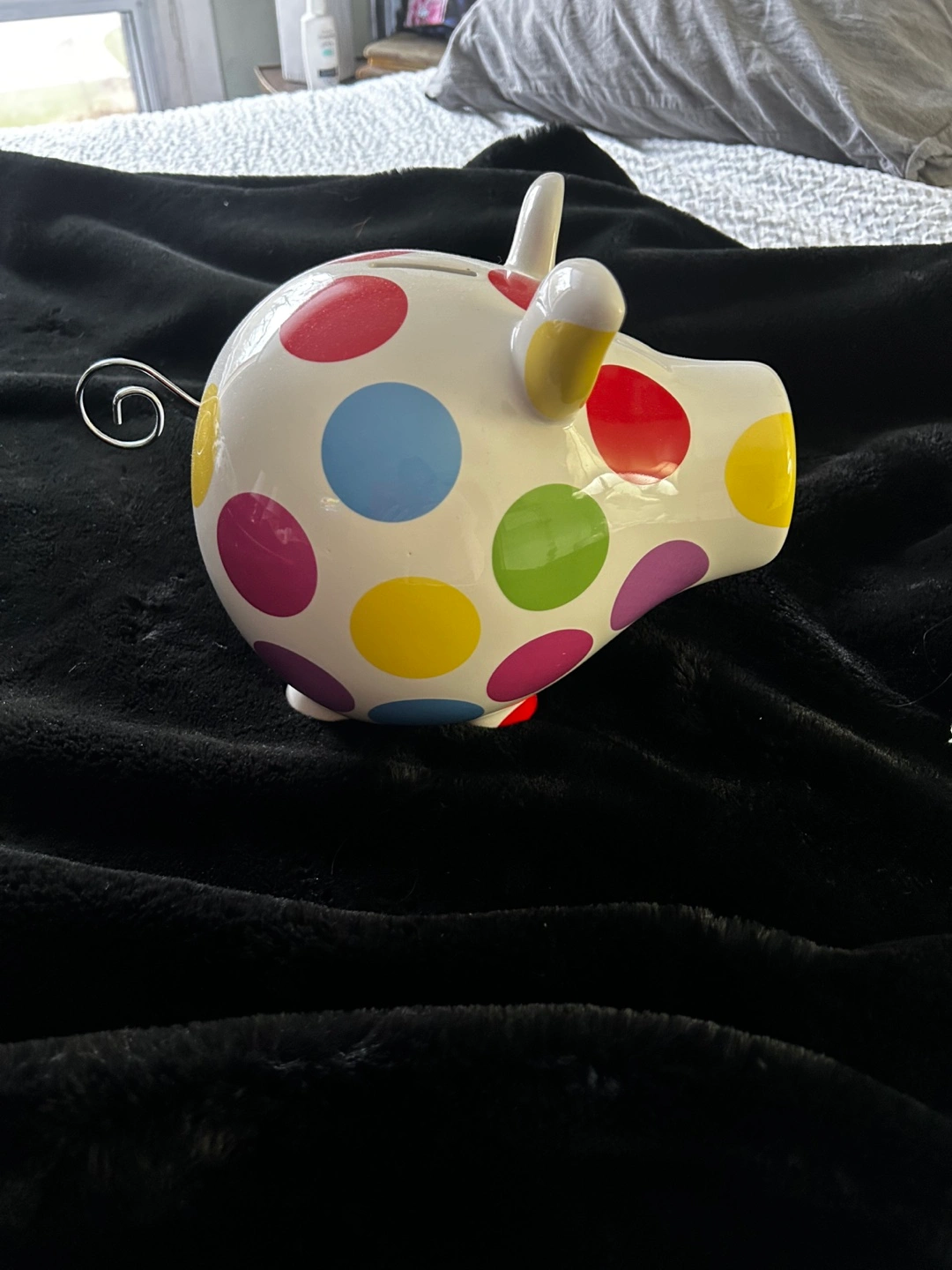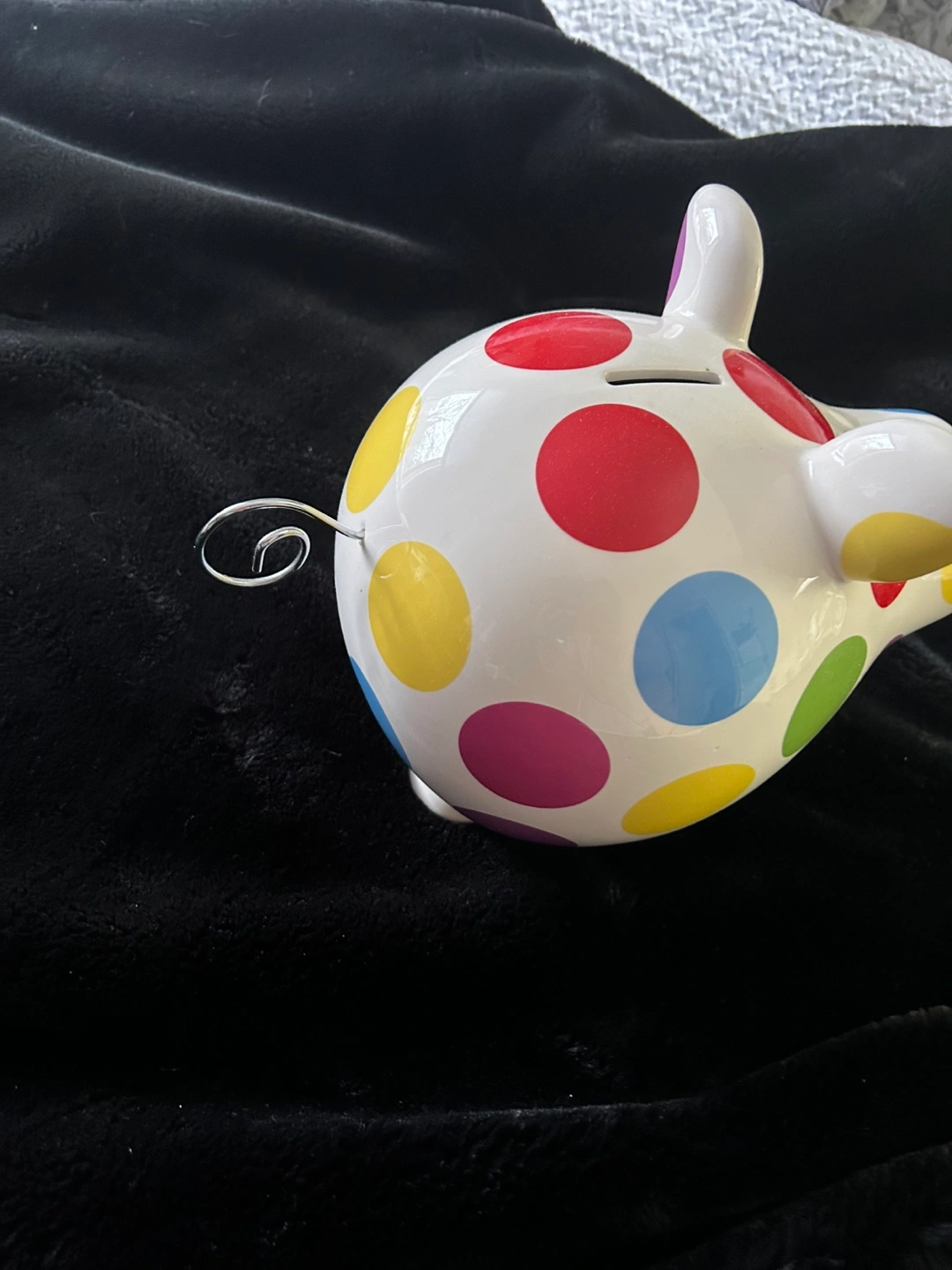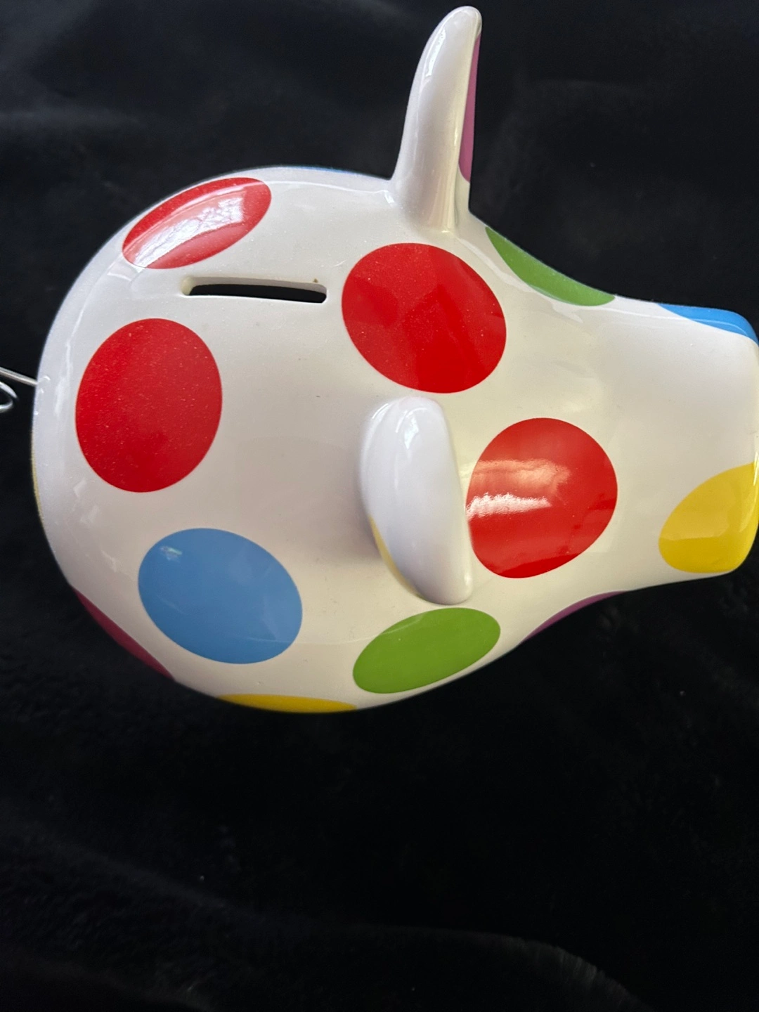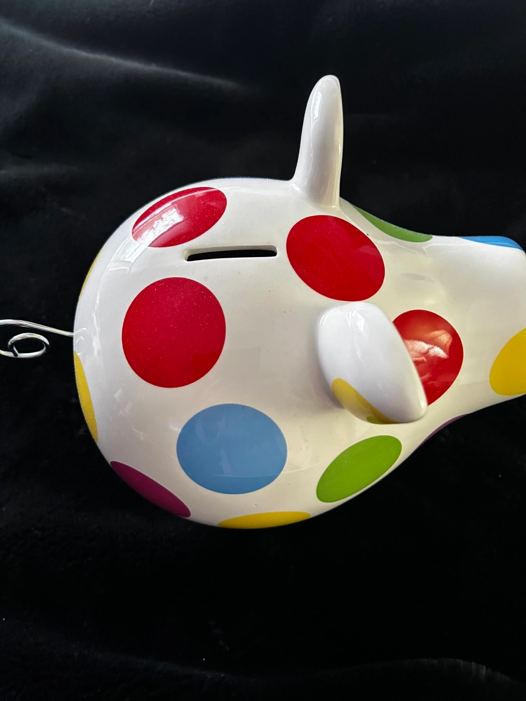 Ceramic piggy bank with multi-coloured polka dots. It has a metal curly tail. It is new just been sitting here. I forgot about it and now my grandkids are too old. Makes a great gift. Pick up area, Bayview andSHEPPARD.
