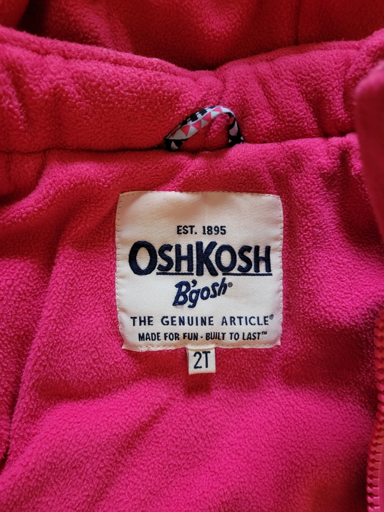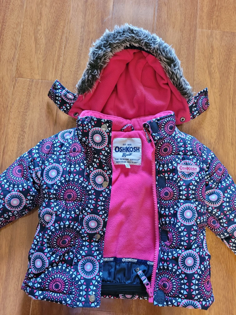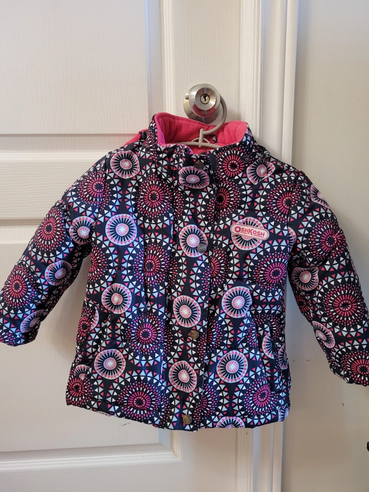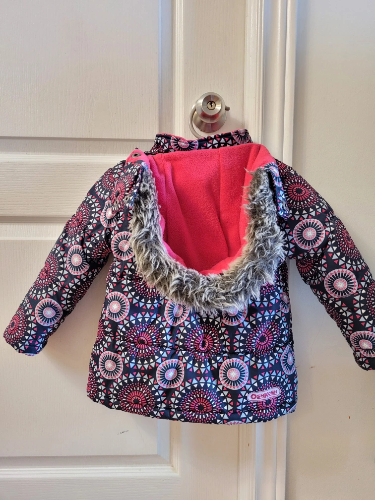 Kids winter jacket. Size 2T. Fleece lining and a faux fur hood. Geometric print with pink, blue, and white on a black background. Pretty and very warm!!
