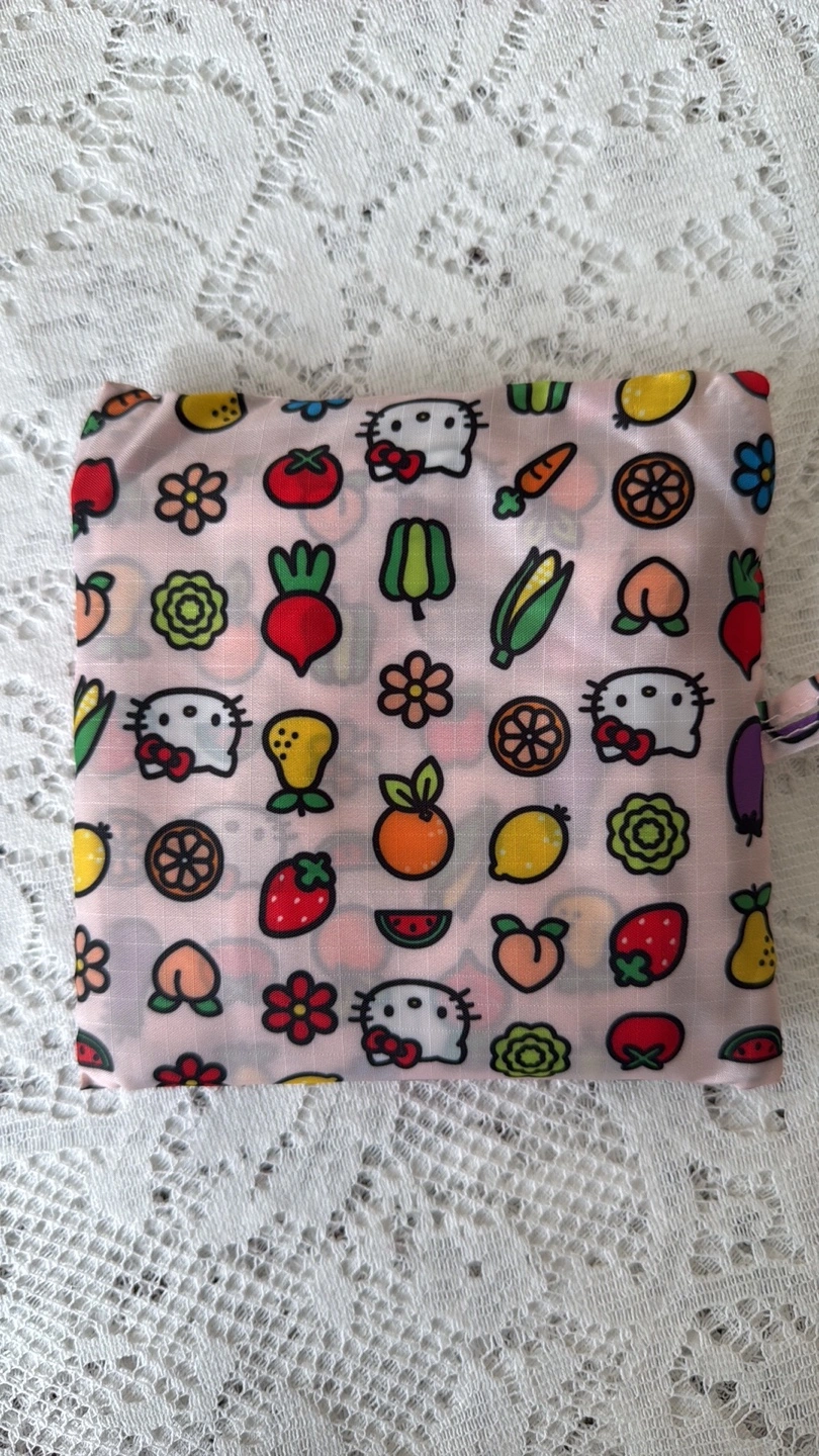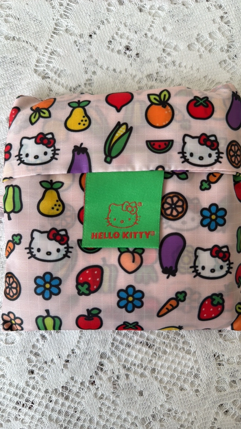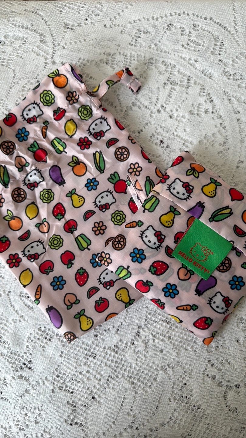 HELLO KITTY & FRIENDS REUSABLE BAG: πππ½ππ ***In a very attractive Fruits & Vegetables design!!! ***A great gift idea!! β’β’β’PICKUP LOCATIONβ’β’β’ Scarborough Town Centre Mall only, evenings.. ***(3 PIECE SET): 1)Reusable bag (Standard size)/ never been used so itβs still folded in the pouch!! 2)Mini pouch to put in the Folded bag 3)Mini drawstring bag (pic#5) to store the 2 items indicated above βοΈfor easy storage ***Absolutely brand-new. Received it as a gift, in original packaging ***A versatile bag for groceries etc. ***RETAIL VALUE: $14.00 Before tax/ selling at a reasonable $9.00 fixed price ***Machine washable https://www.baggu.com/products/standard-baggu-hello-kitty-and-friends-scene ALSO SELLING: More Hello Kitty items, please see listing