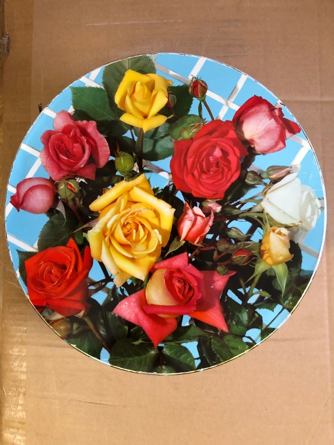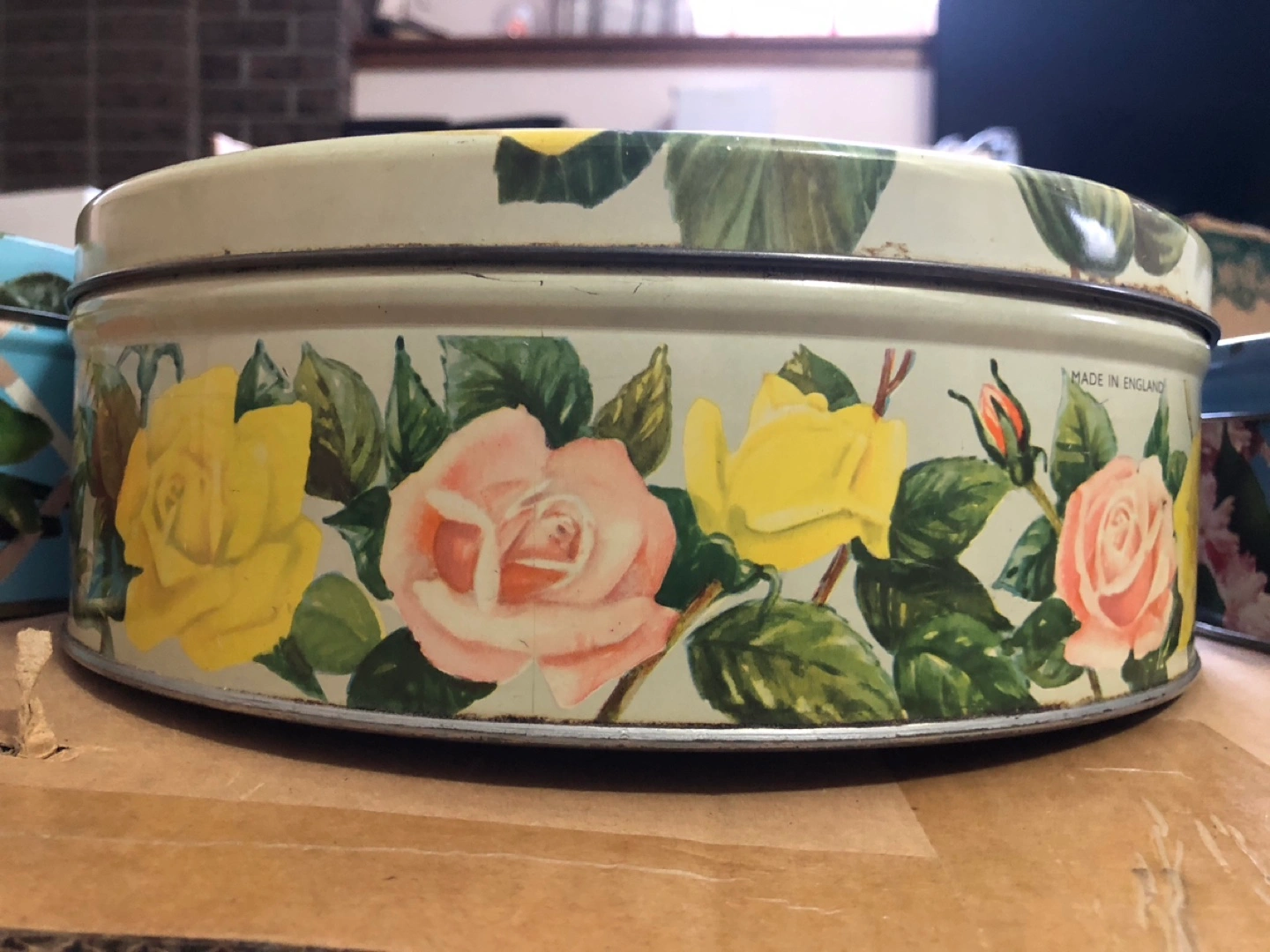 Set of three vintage floral tins. All tins are in good condition with no dents, but show signs of wear. Tins are approximately 10-12 inches in diameter. Great for storage, decoration, or crafting.