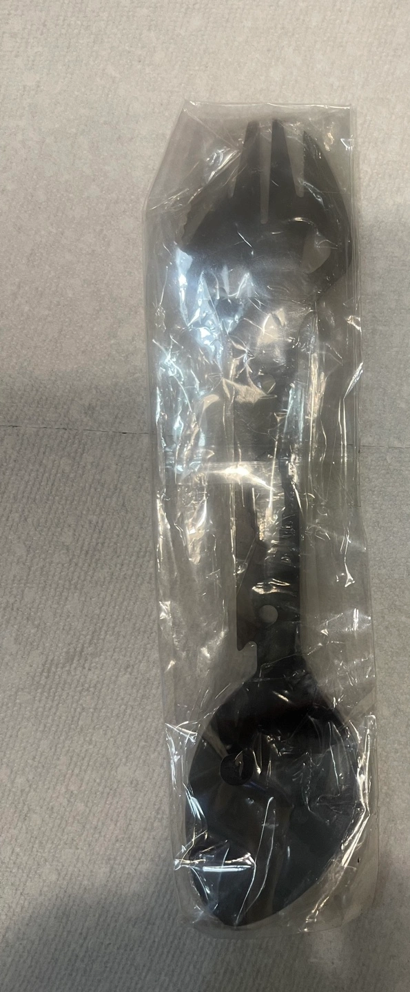 Black camping all-in-one tool/utensil: includes a fork, spoon, and knife. Features a bottle opener and a can opener. New, never used.