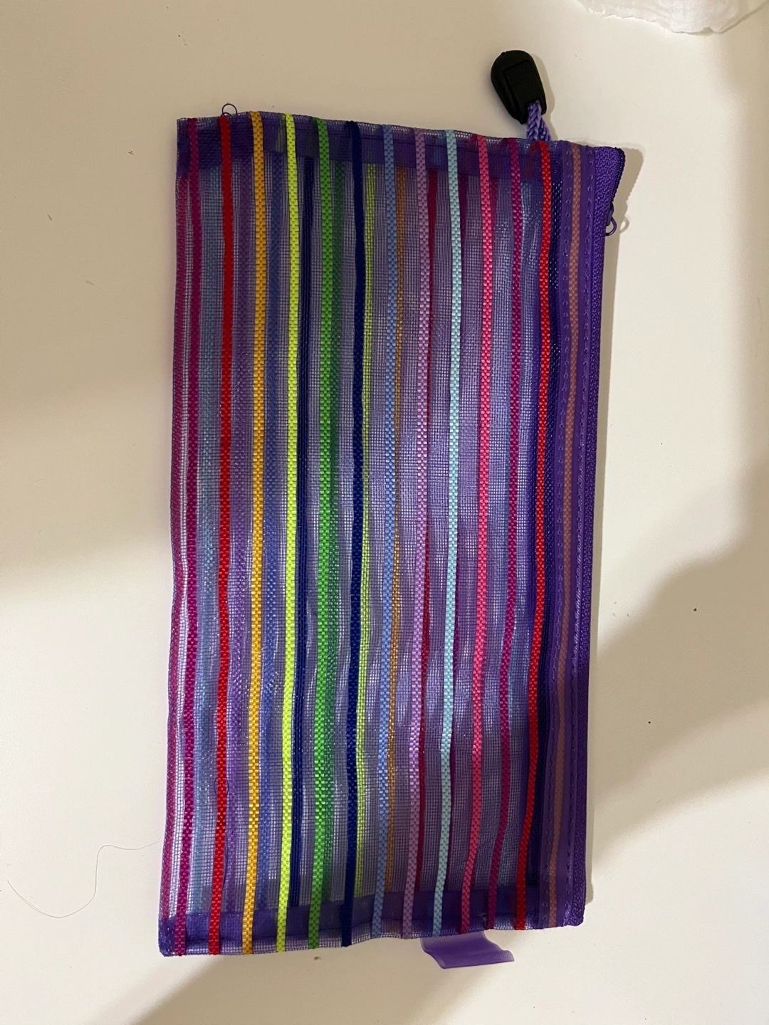 Purple mesh pouch with rainbow stripes. Has zipper closure. It can be used as a pencil case- I haven’t used it before