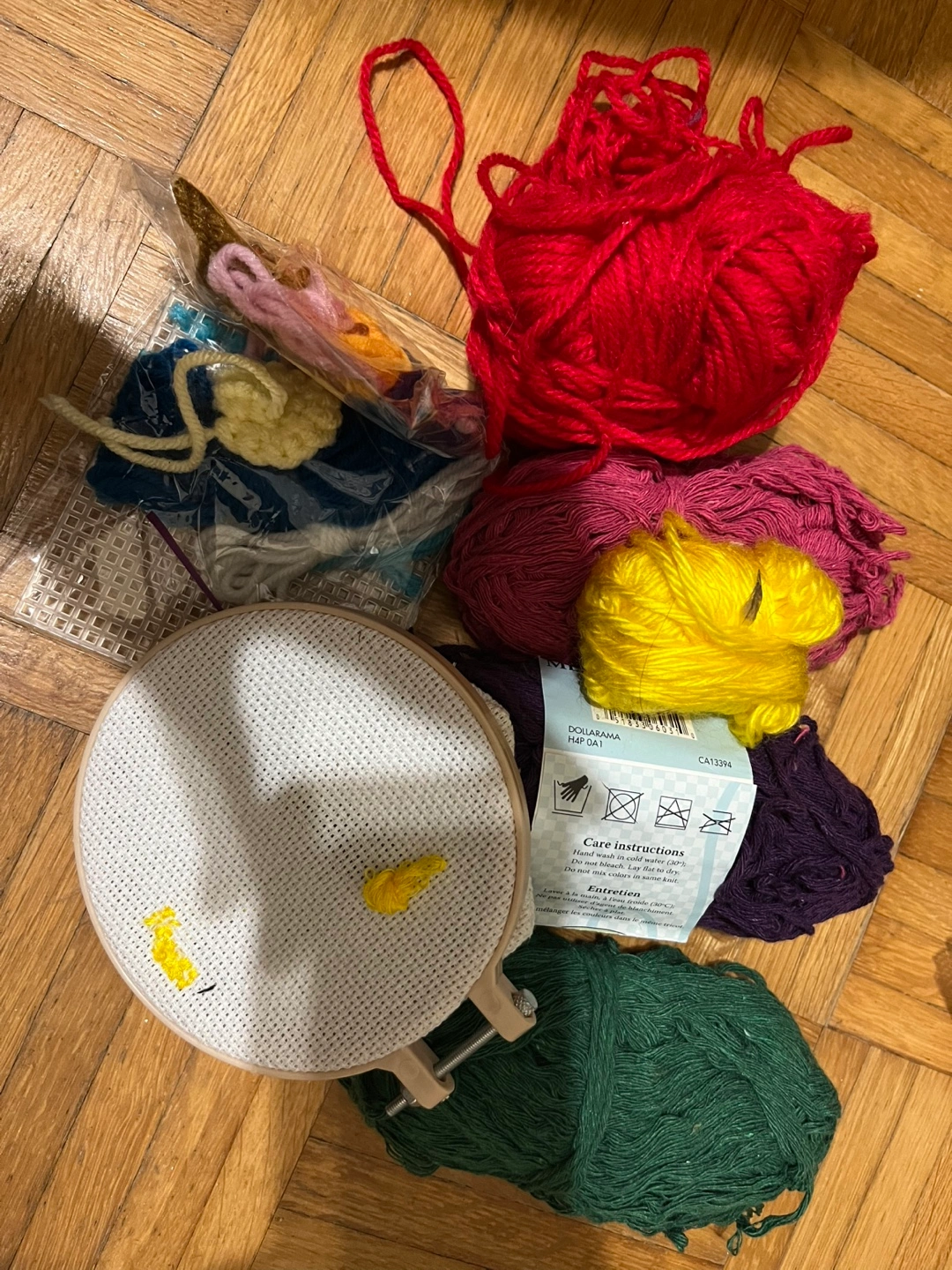 Embroidery kit including a round embroidery hoop, yarn in various colours, and embroidery floss in a plastic bag. The yarn is likely acrylic. It’s just some random yarn I don’t use anymore (red may be tangled) All of it for $2