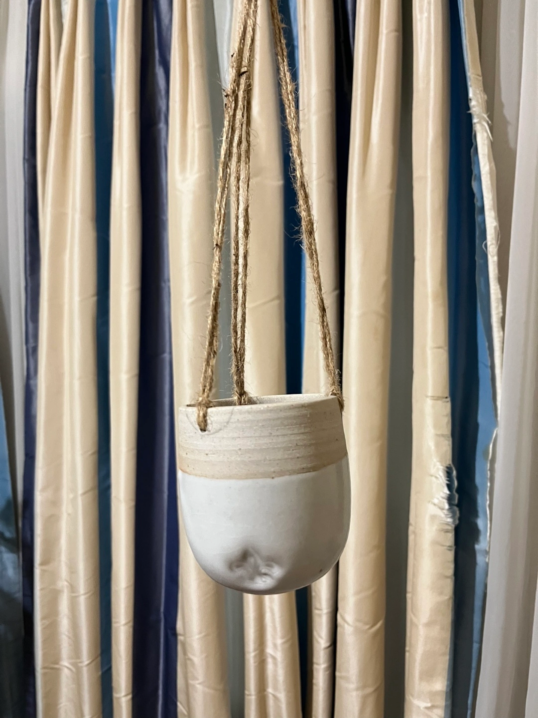 White ceramic hanging planter. Has a brown, speckled glaze on the rim. Comes with a natural jute rope for hanging. It’s about the size of a tennis ball Good quality Used only once or twice I couldn’t hang it in my room so I’m giving it away