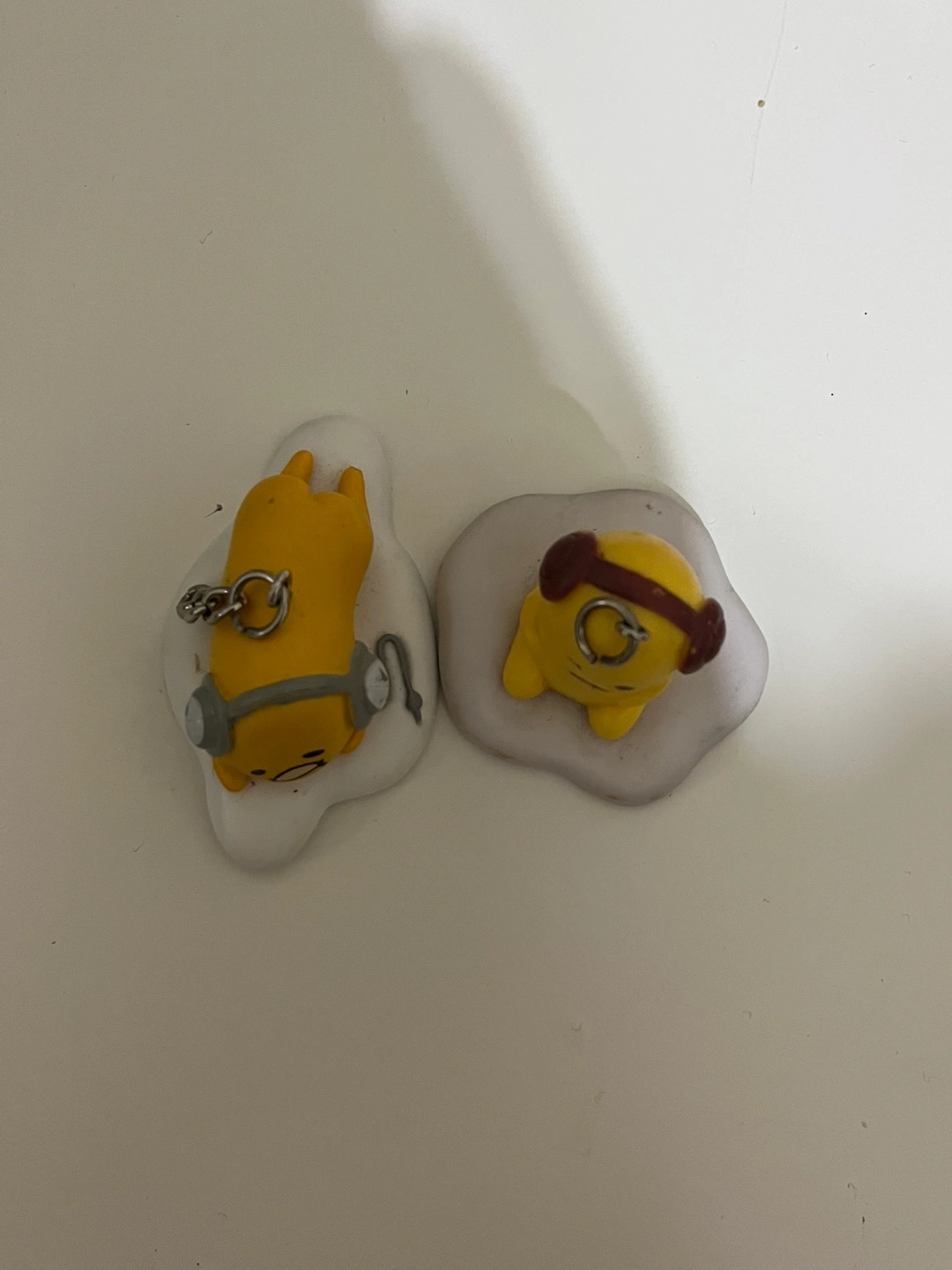 Two Gudetama keychains. One is lying down on a white egg yolk, with headphones on. The other is sitting up with brown ears on its head, also on a white egg yolk. I lost the big ring that hooks it onto my bag $3for both $2 each