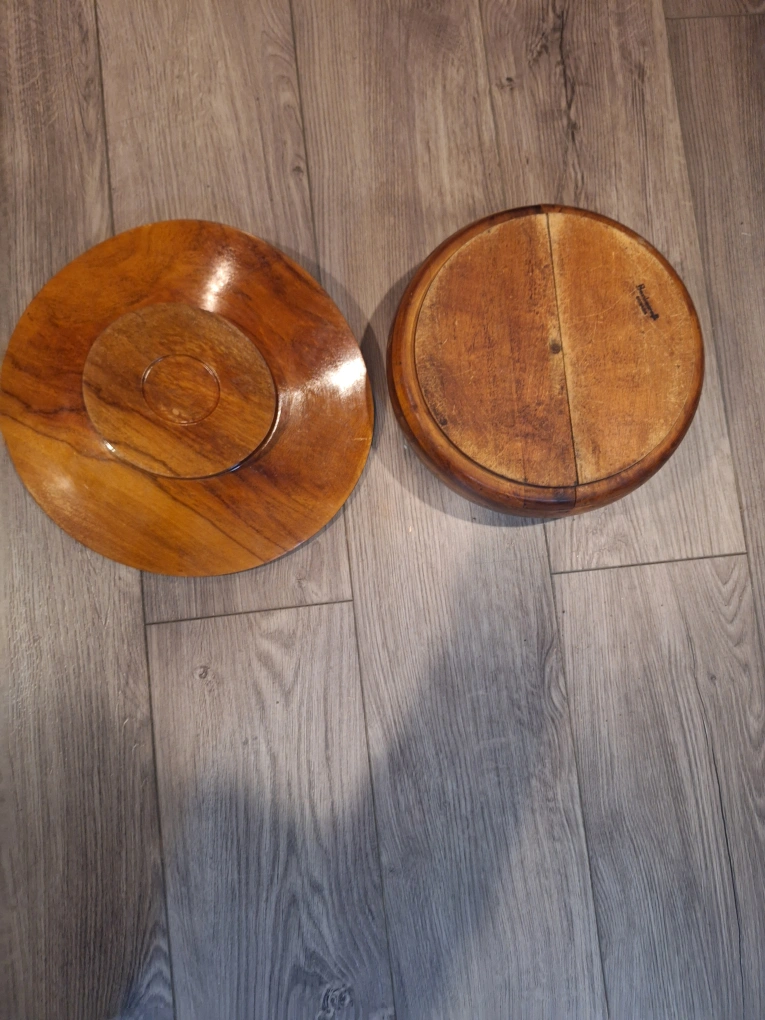 Set of two wooden bowls. One bowl is a lid for the other bowl.
