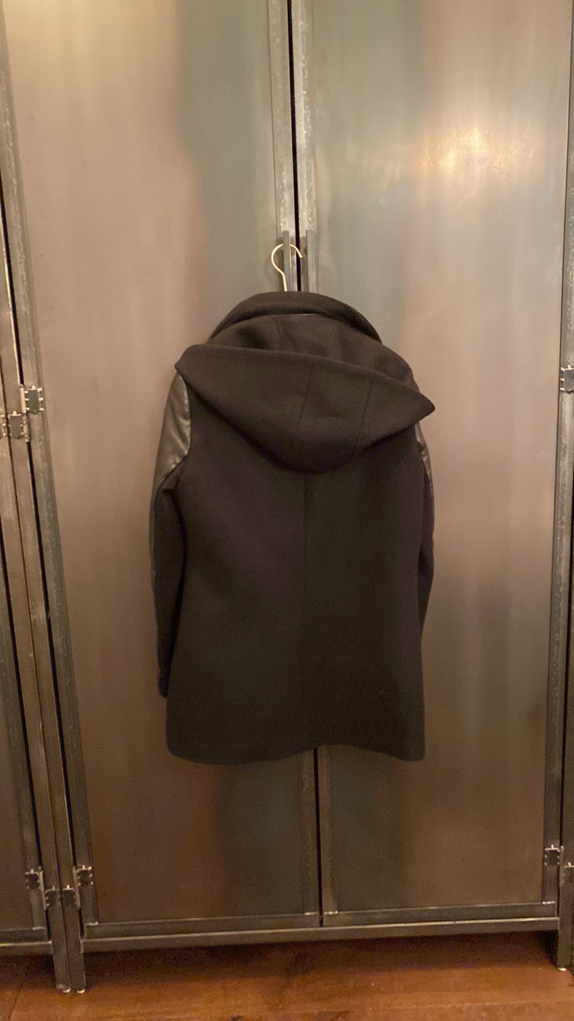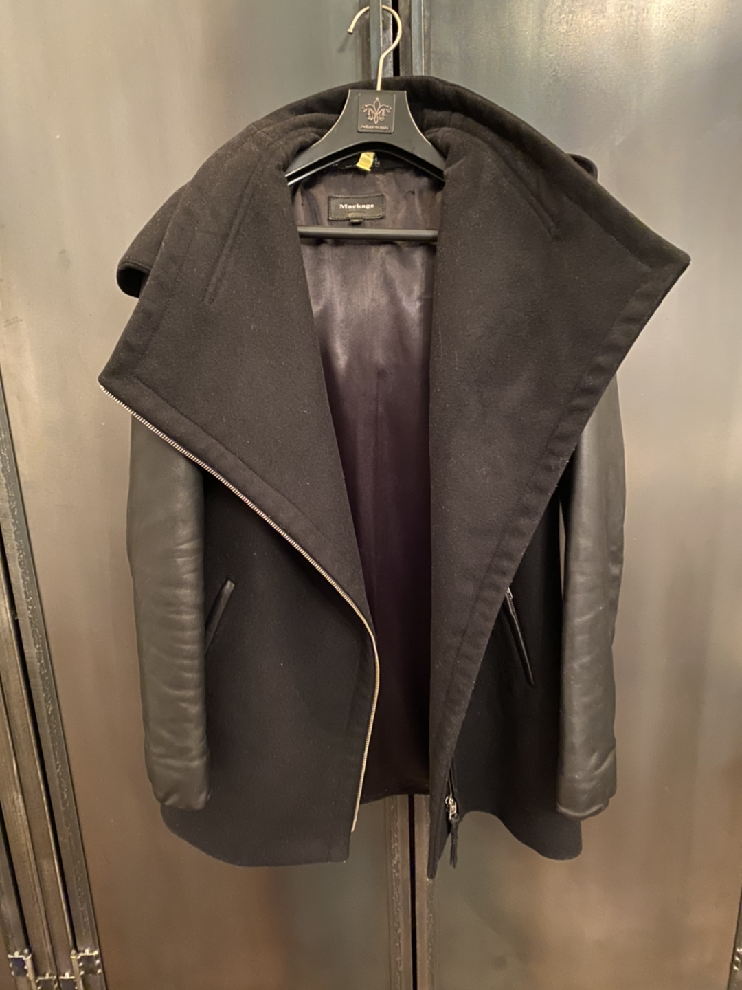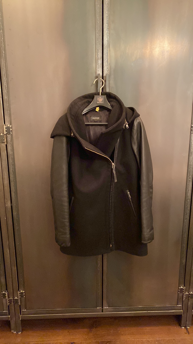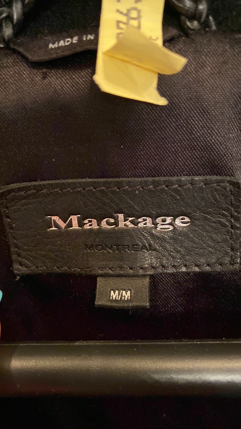Black Mackage Jacket in size medium. It is wool with leather sleeves and hood is removable. Beautiful jacket, only selling because I have gained some weight and it is a little snug on me.